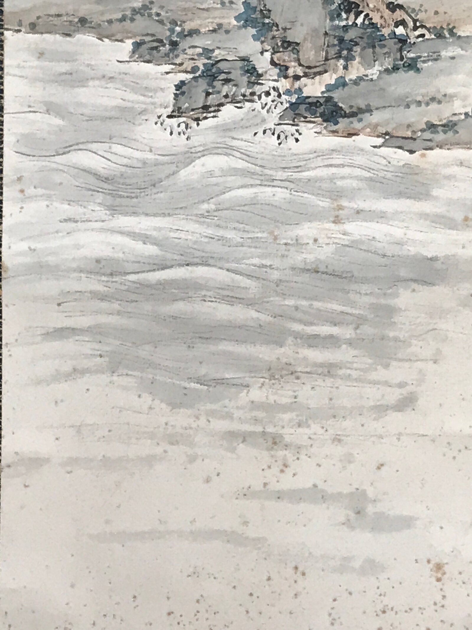 Japanese Hanging Scroll Kakejiku Vtg Mountain Tree Houses Cranes Color KJ128