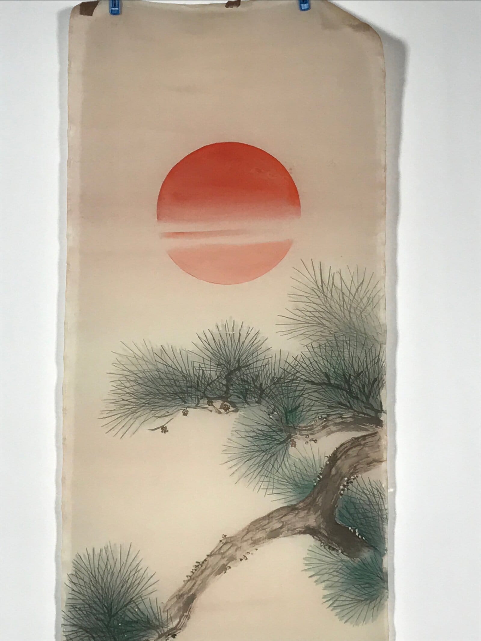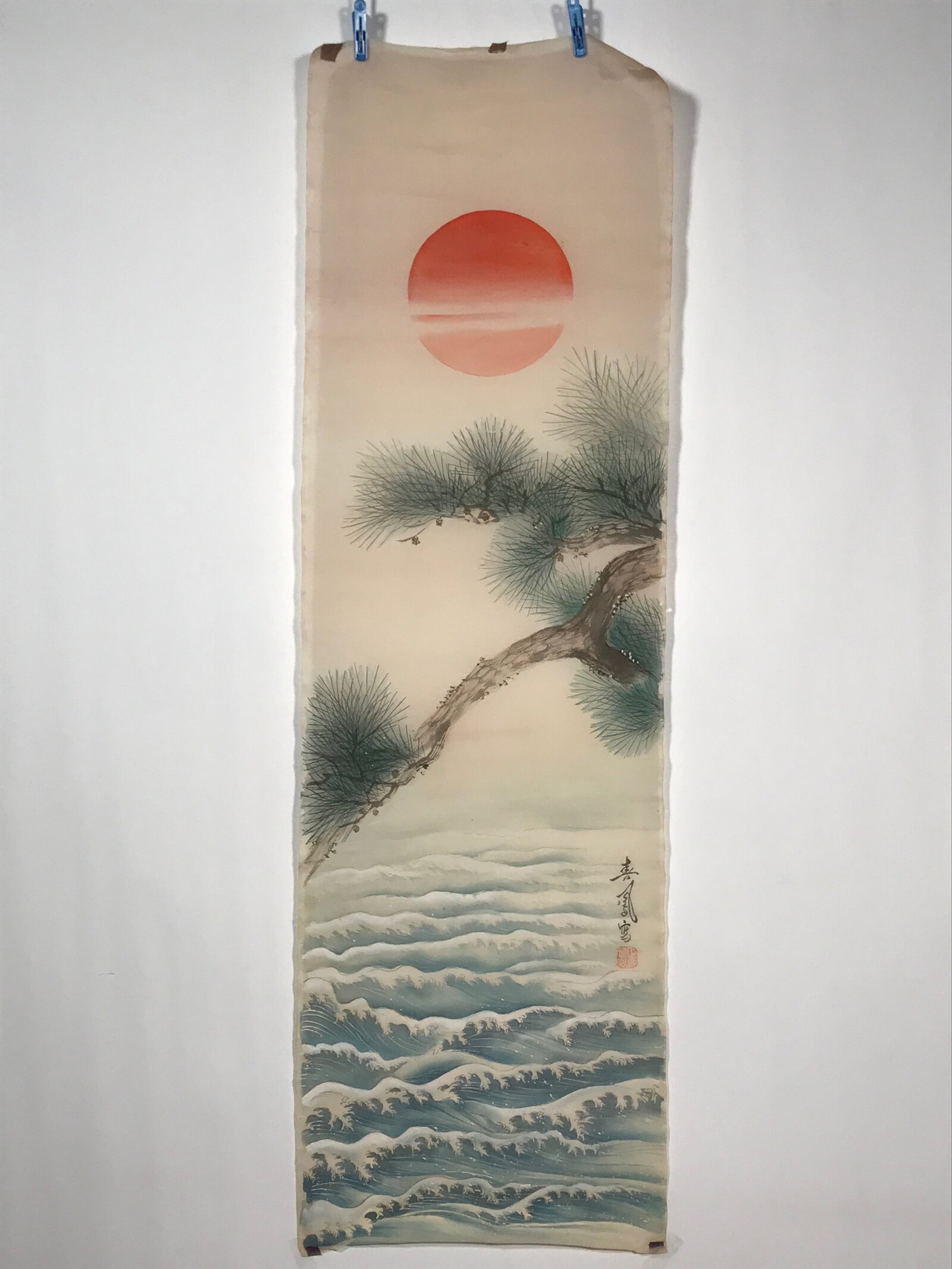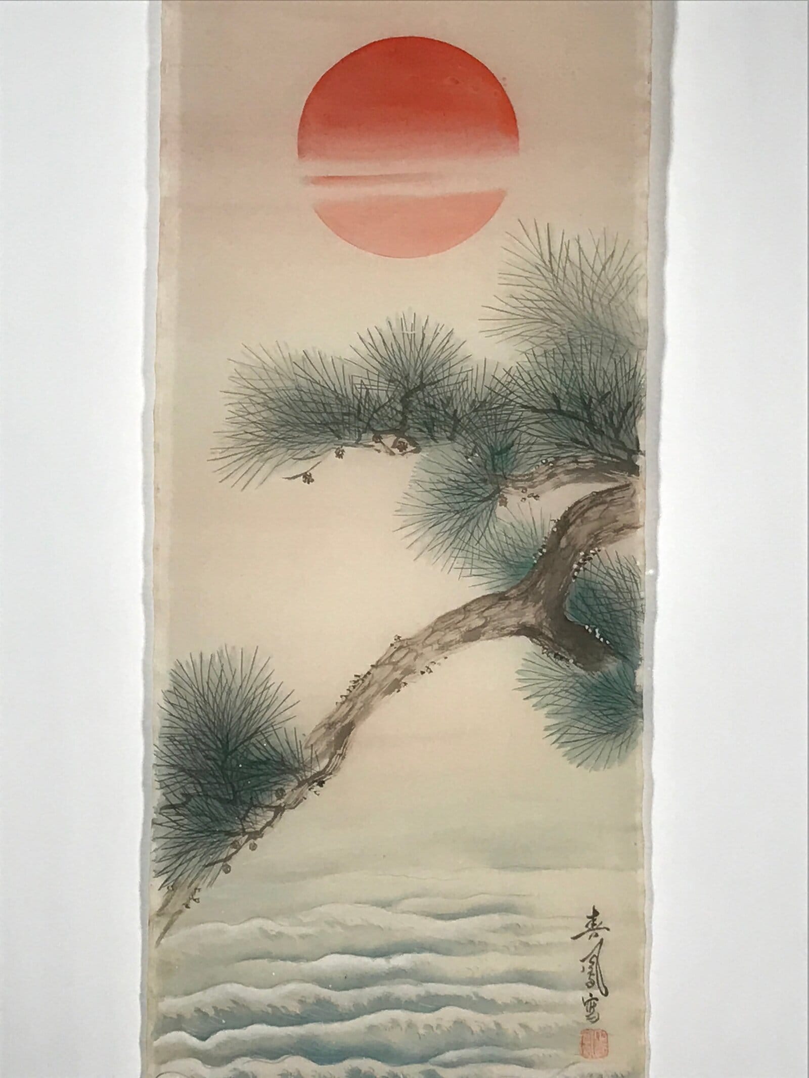 This vintage Japanese picture is for a hanging scroll (kakejiku or makimono). It features an illustration of a red sun rising above the sea. The branch of a pine tree can also be seen. This piece is signed by an artist Shunpu and red seals.