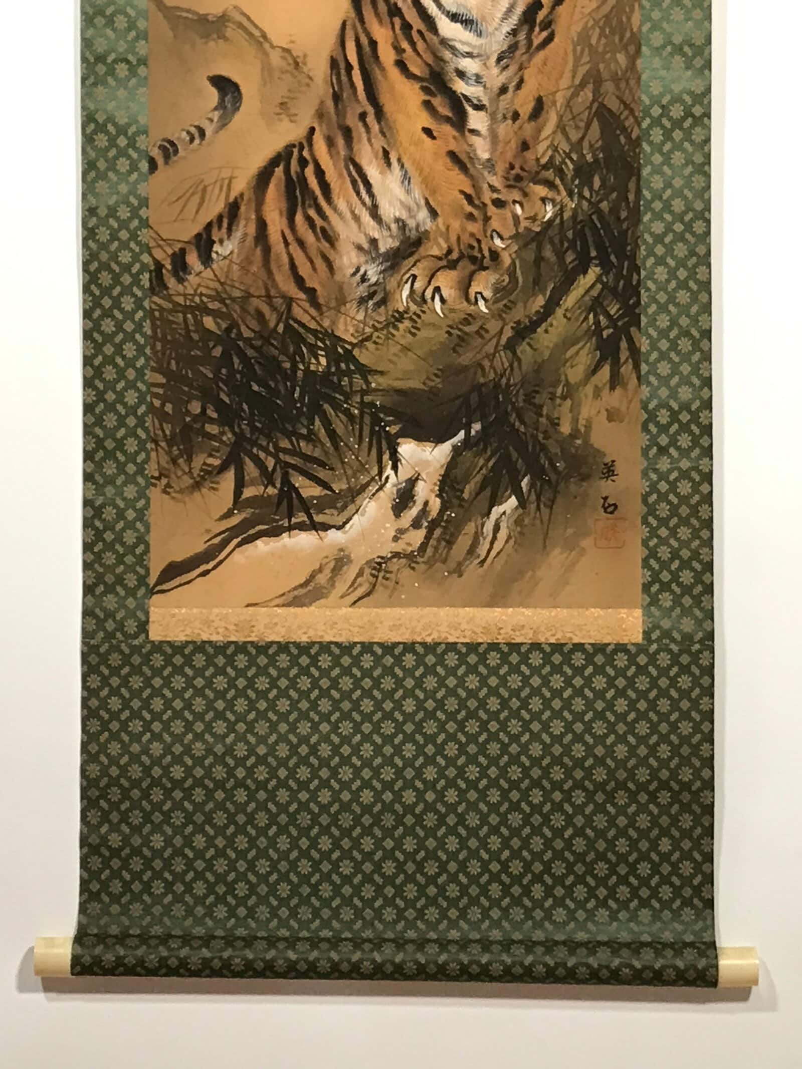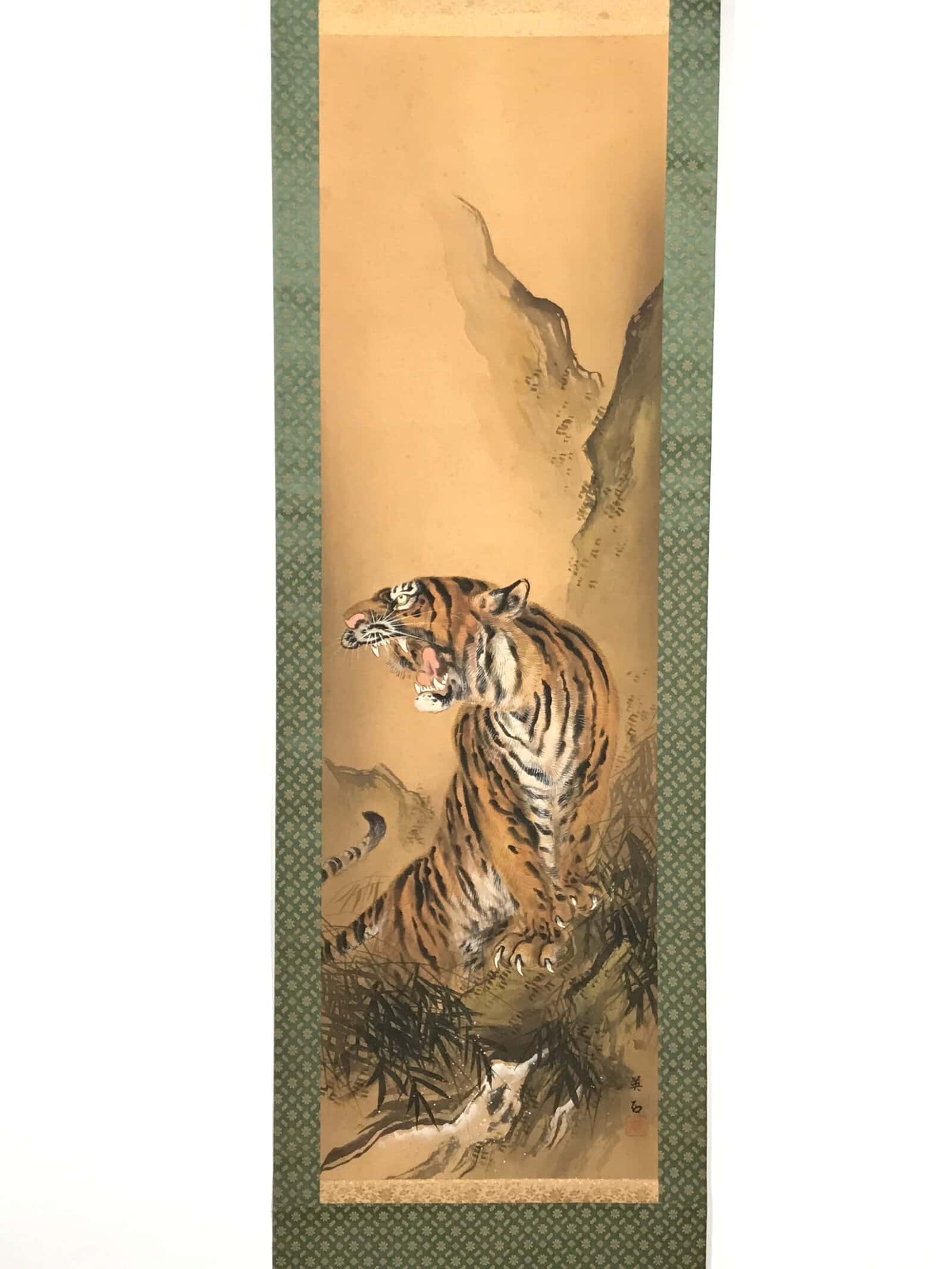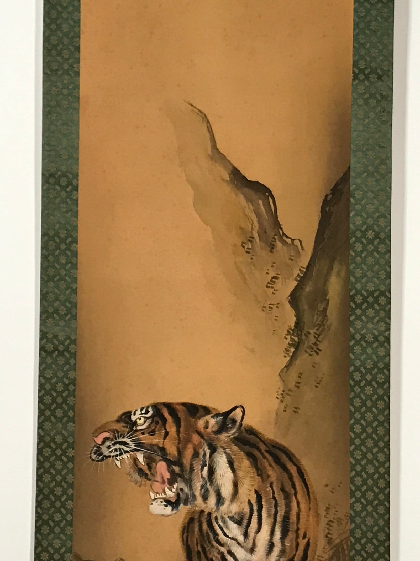 This vintage Japanese hanging scroll (kakejiku or makimono) represents a roaring orange and black tiger. Details of mountains and trees are also pictured. In Japan, the tiger is a symbol of courage and long life. Tiger is also one of the 12 oriental zodiac animals. This piece is signed by an artist Eiseki and a red seal.