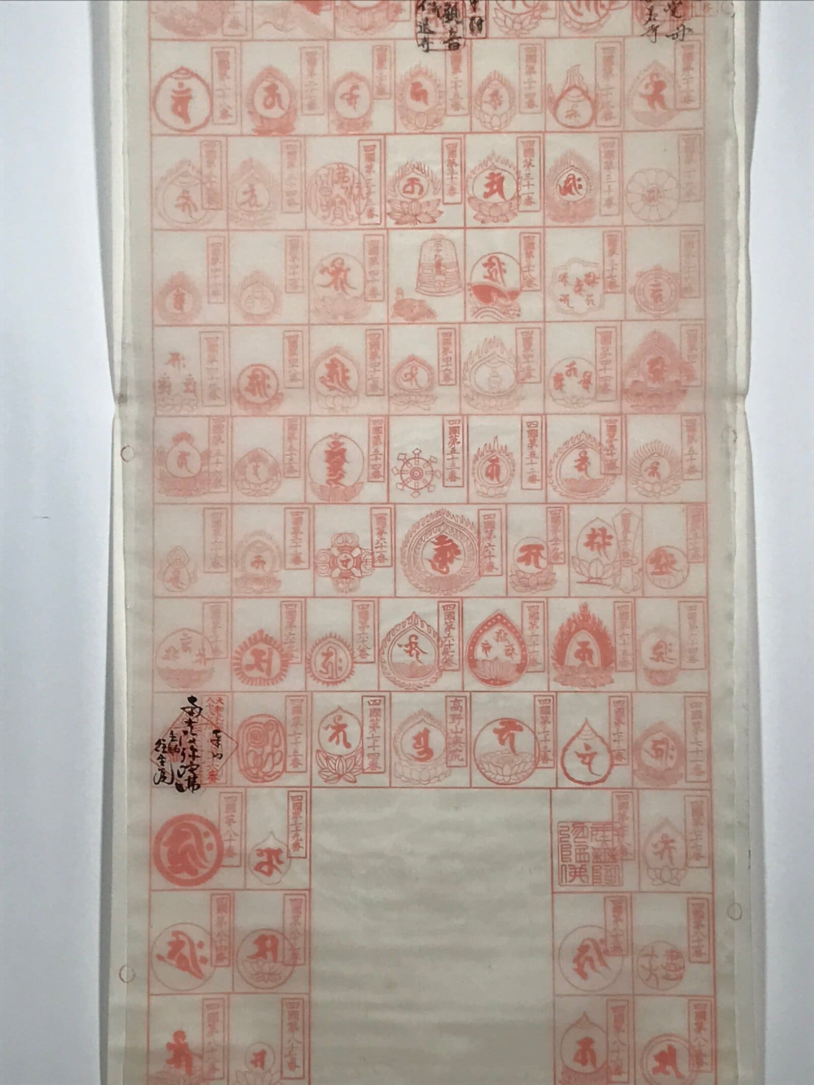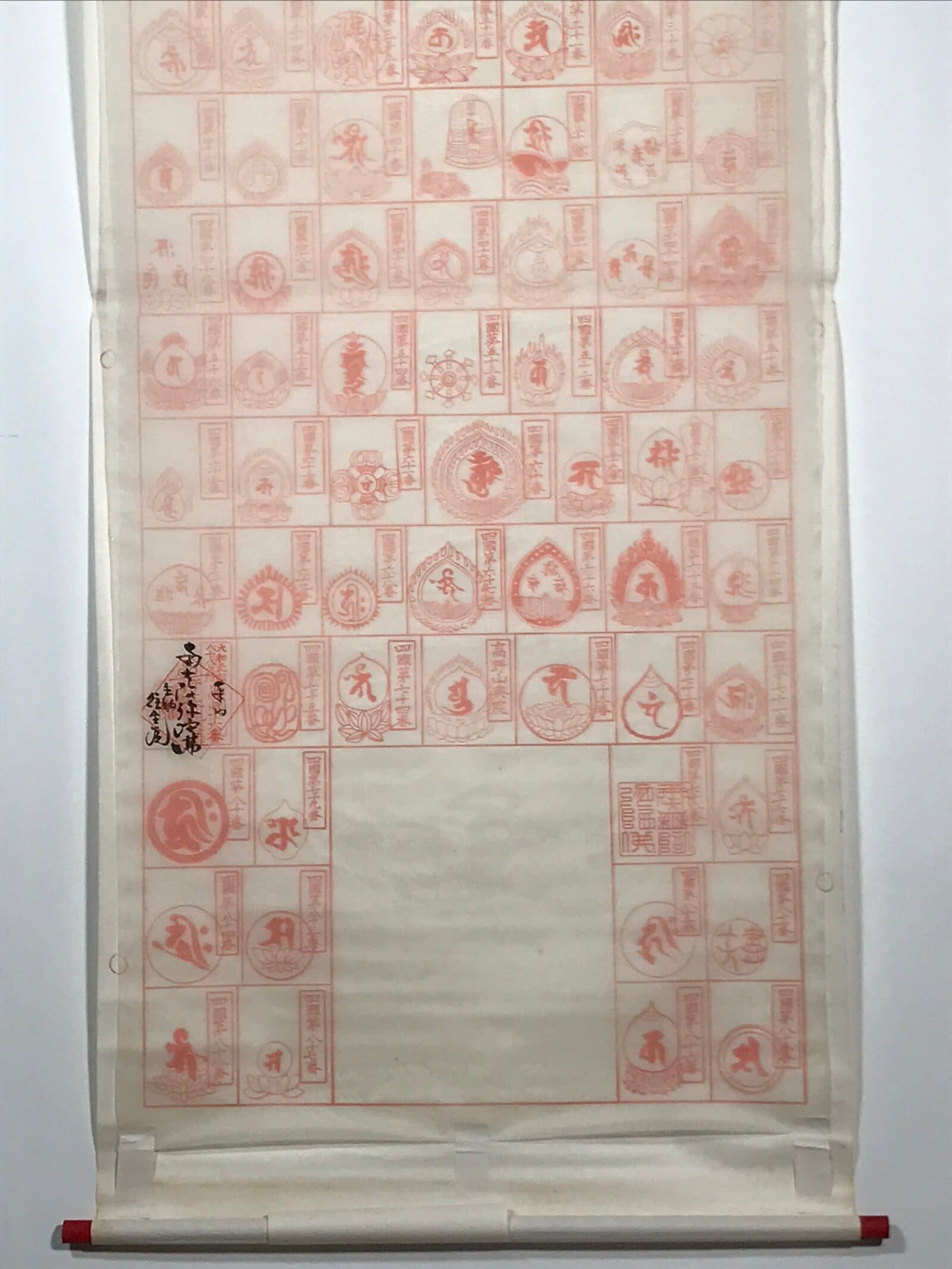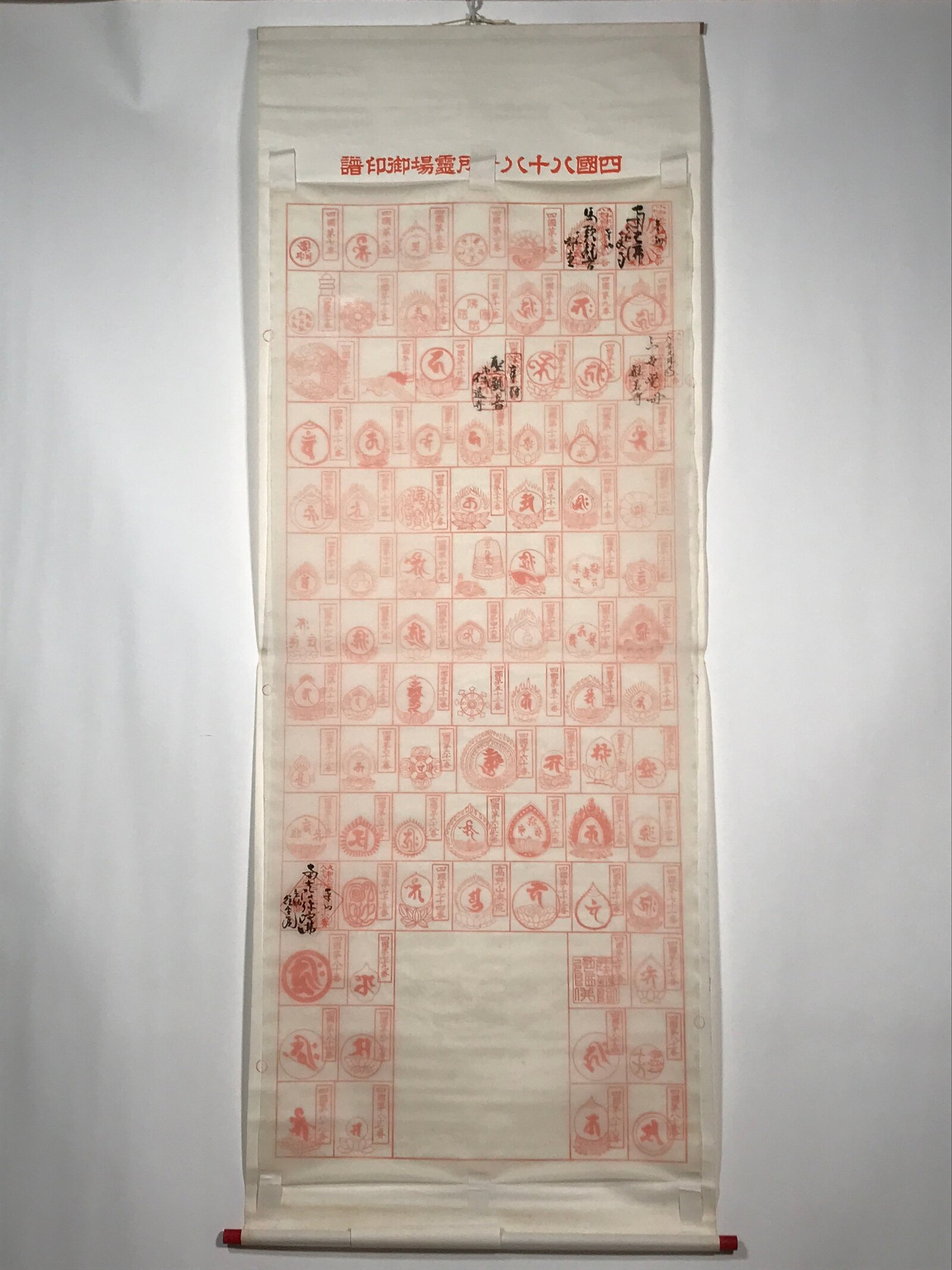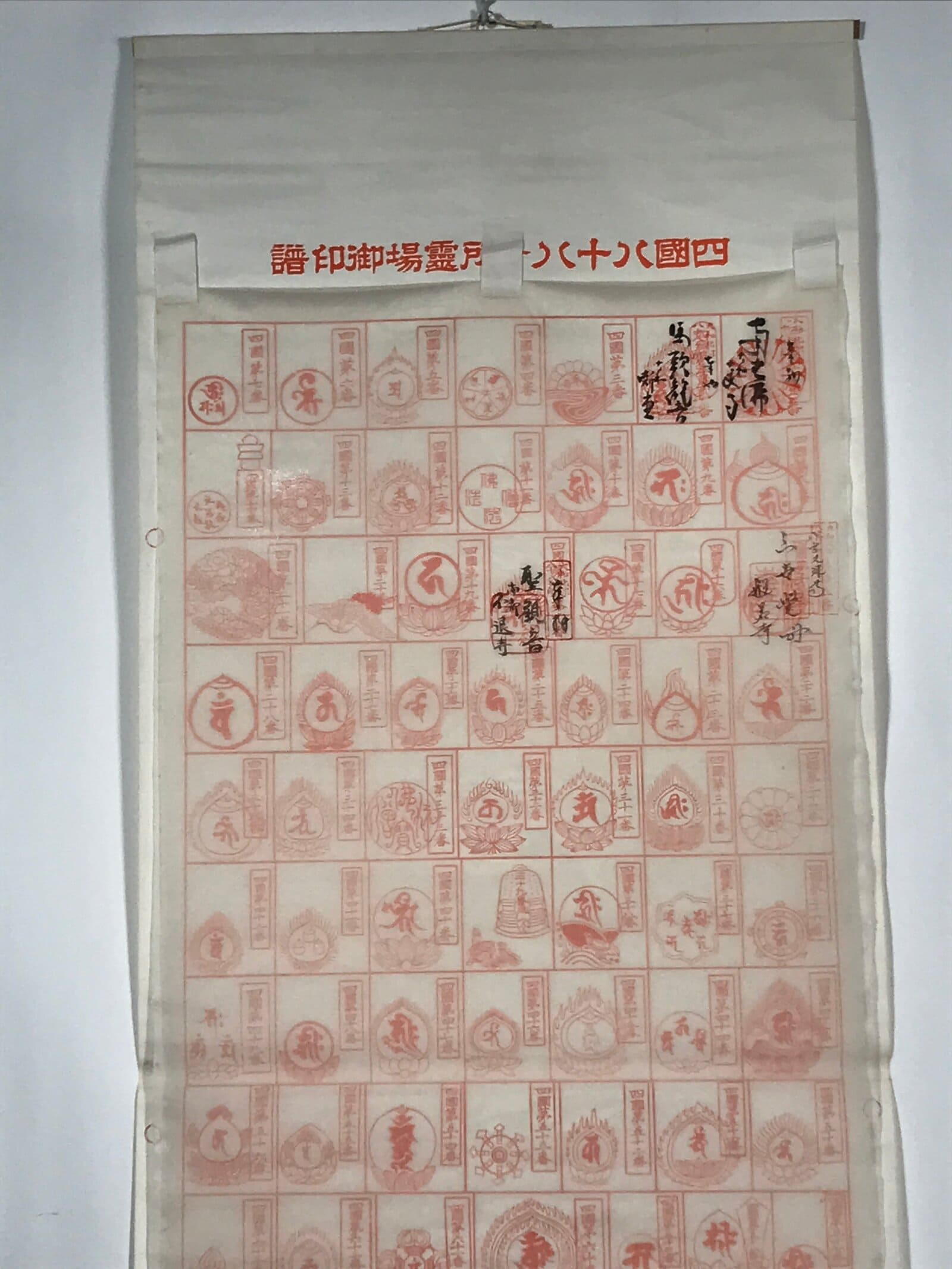 This vintage Japanese hanging scroll (kakejiku or makimono) features 88 boxes to place 88 red seals (goshuin) from the temples and places of the Shikoku Hachijuhakkasho or Shikoku Pilgrimage. This kakejiku has some boxes filled with temple seals.