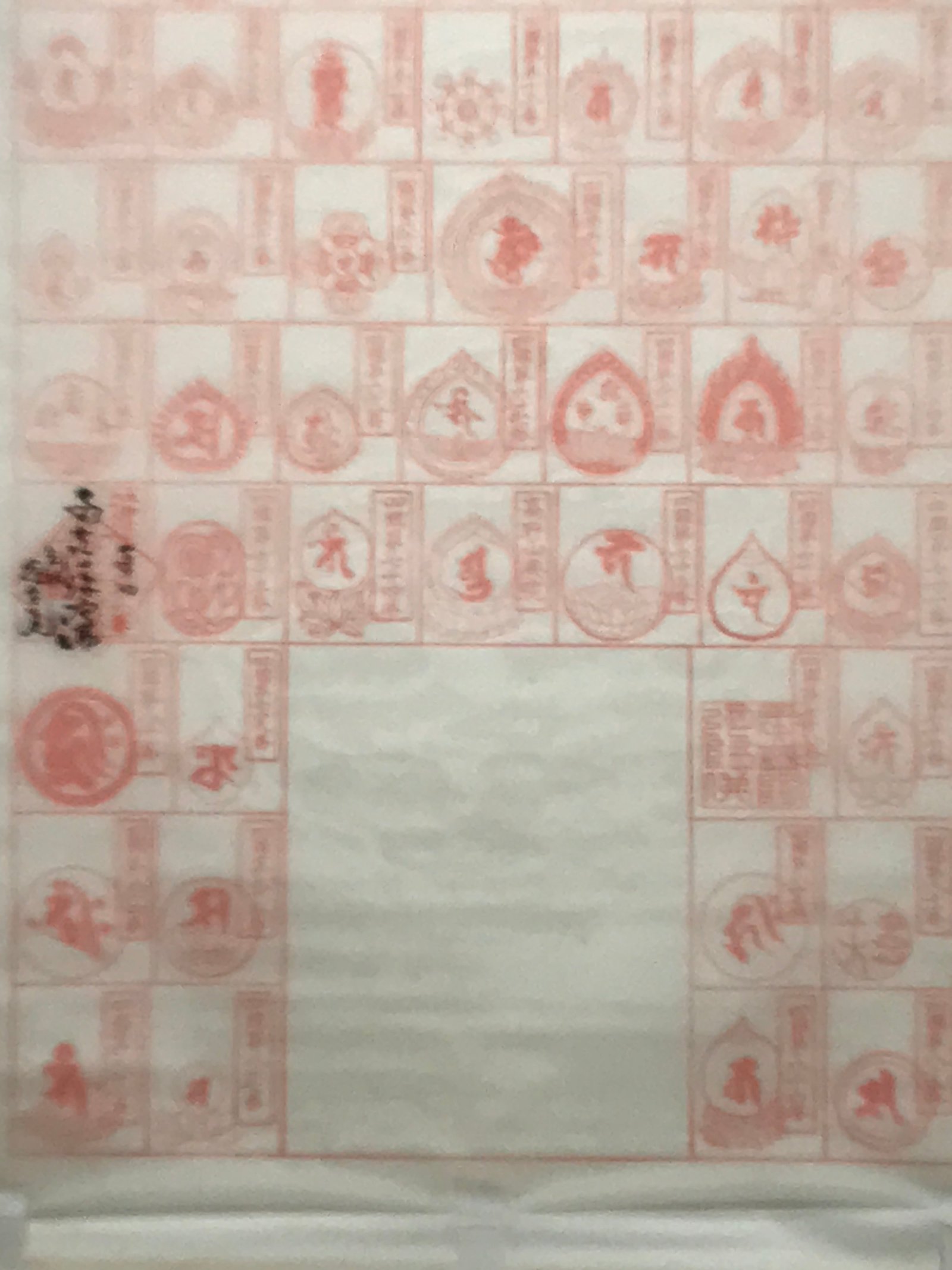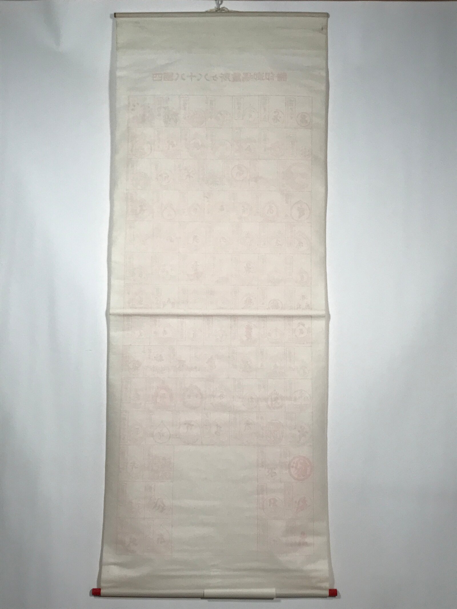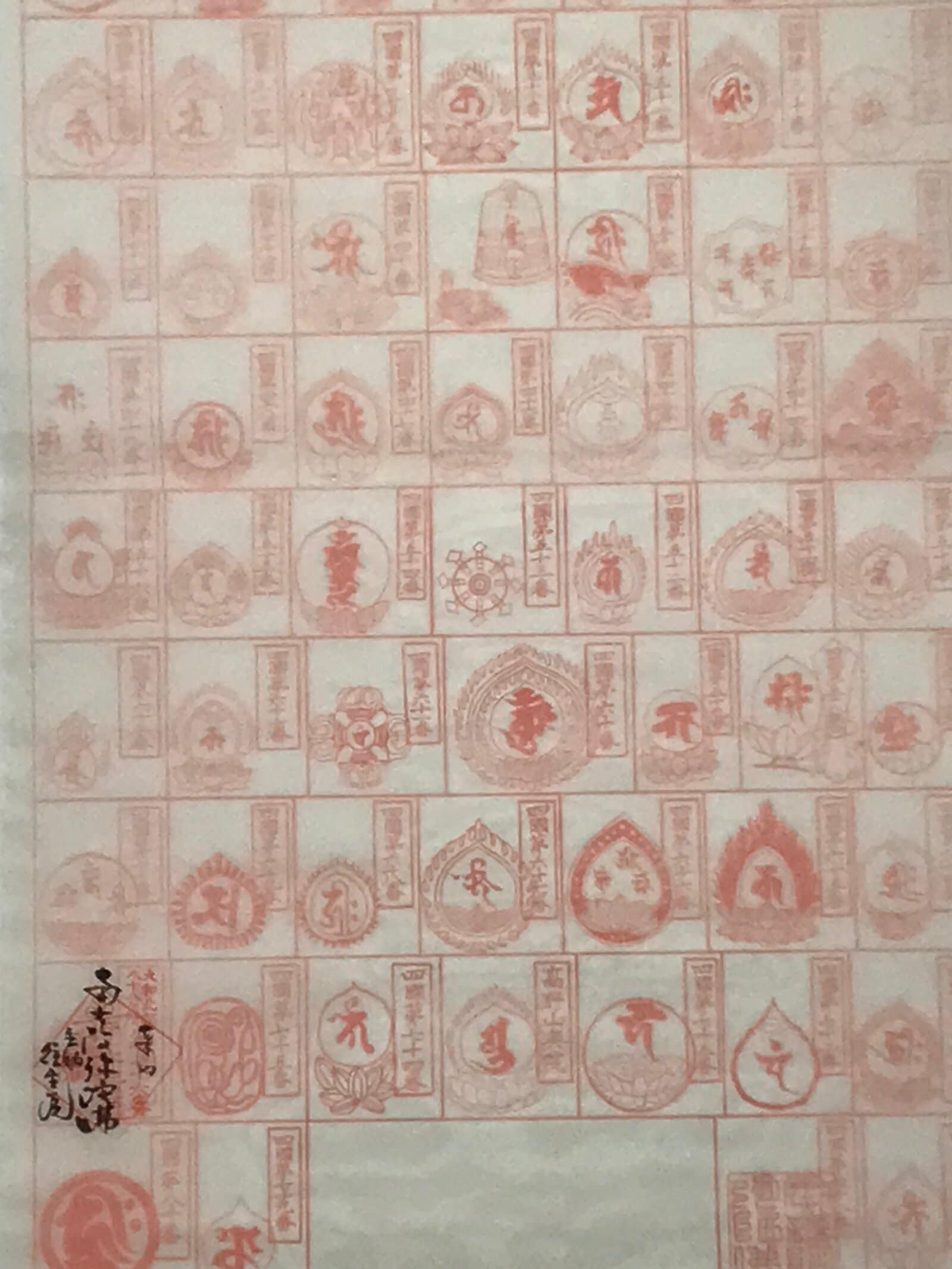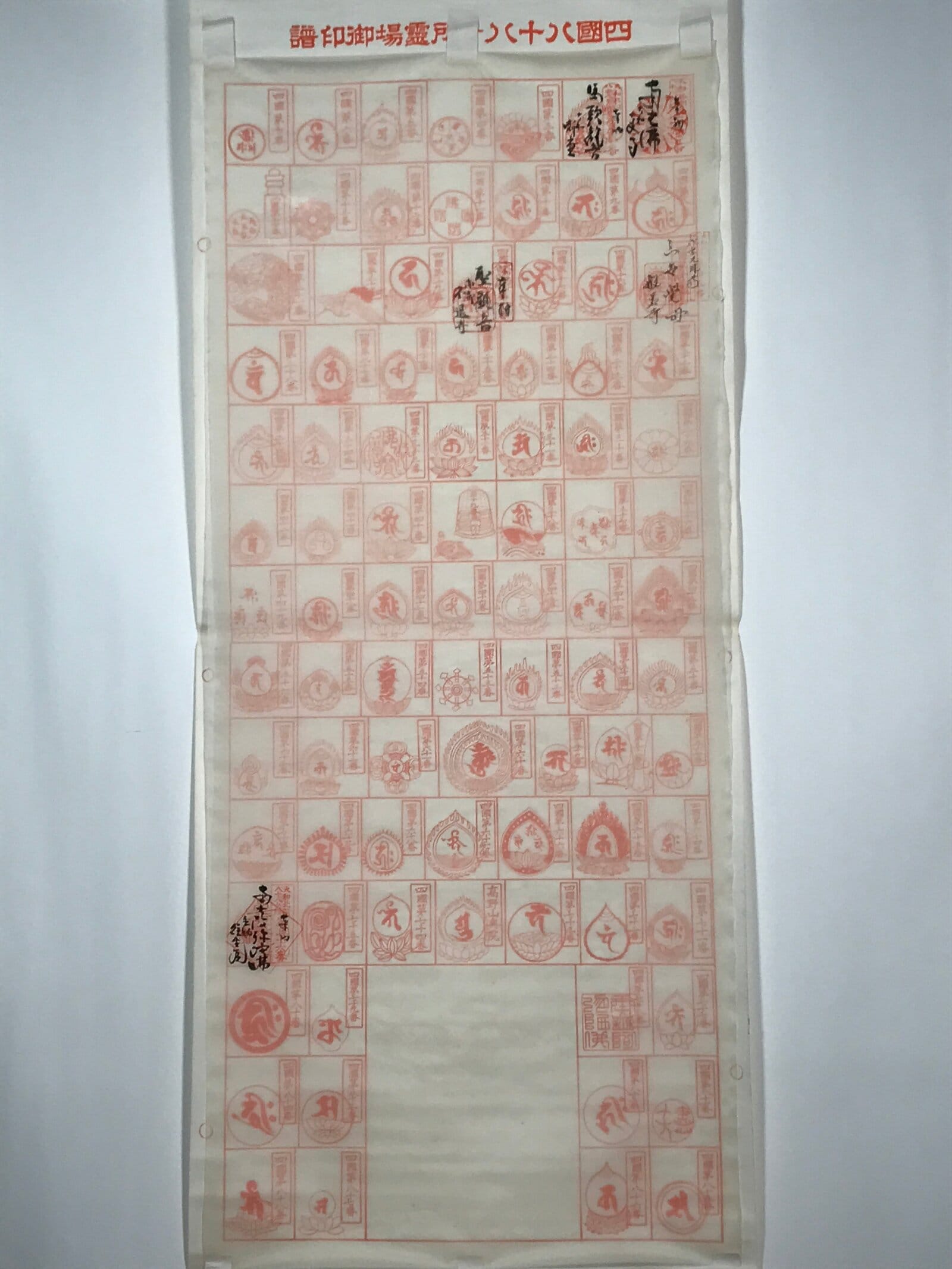 This vintage Japanese hanging scroll (kakejiku or makimono) features 88 boxes to place 88 red seals (goshuin) from the temples and places of the Shikoku Hachijuhakkasho or Shikoku Pilgrimage. This kakejiku has some boxes filled with temple seals.