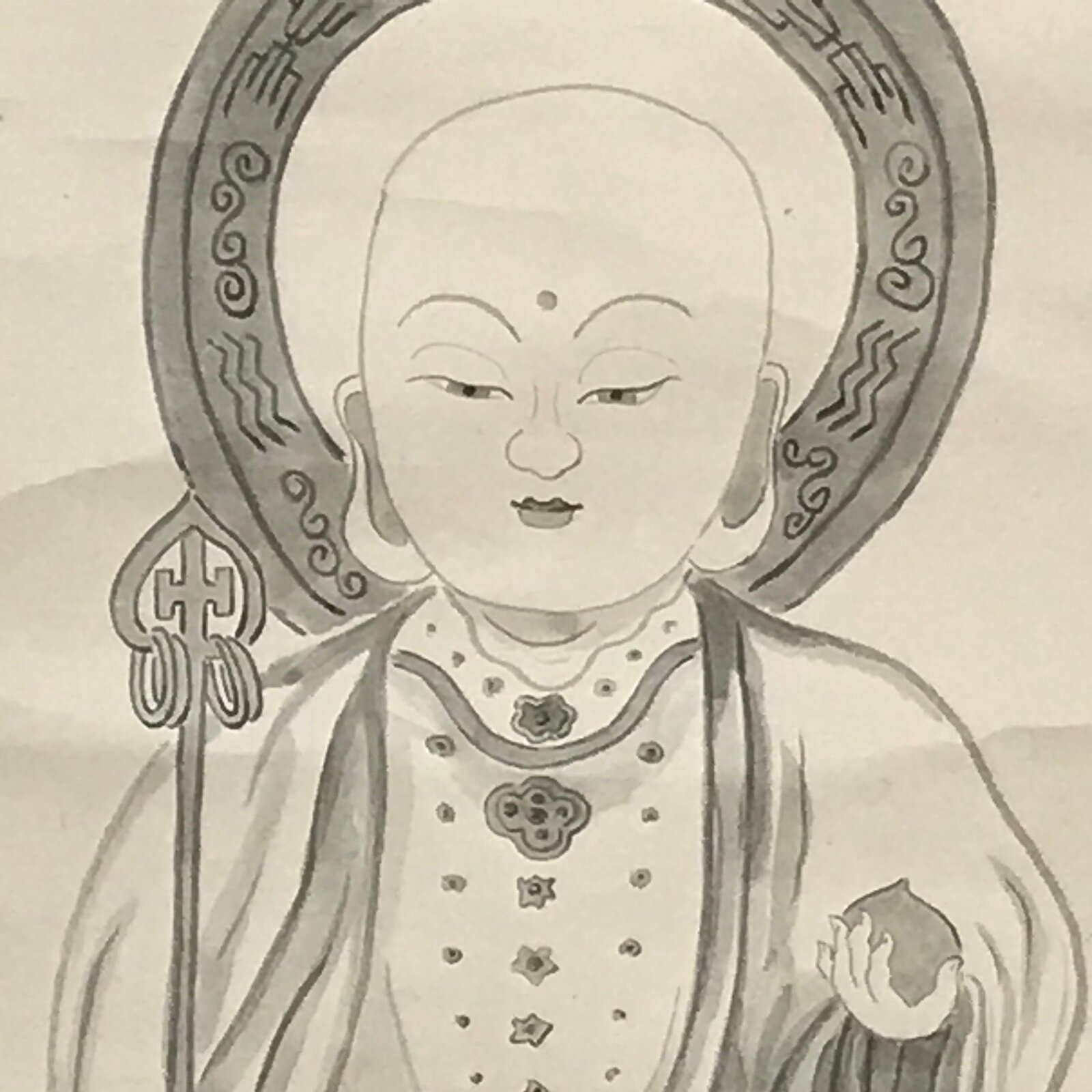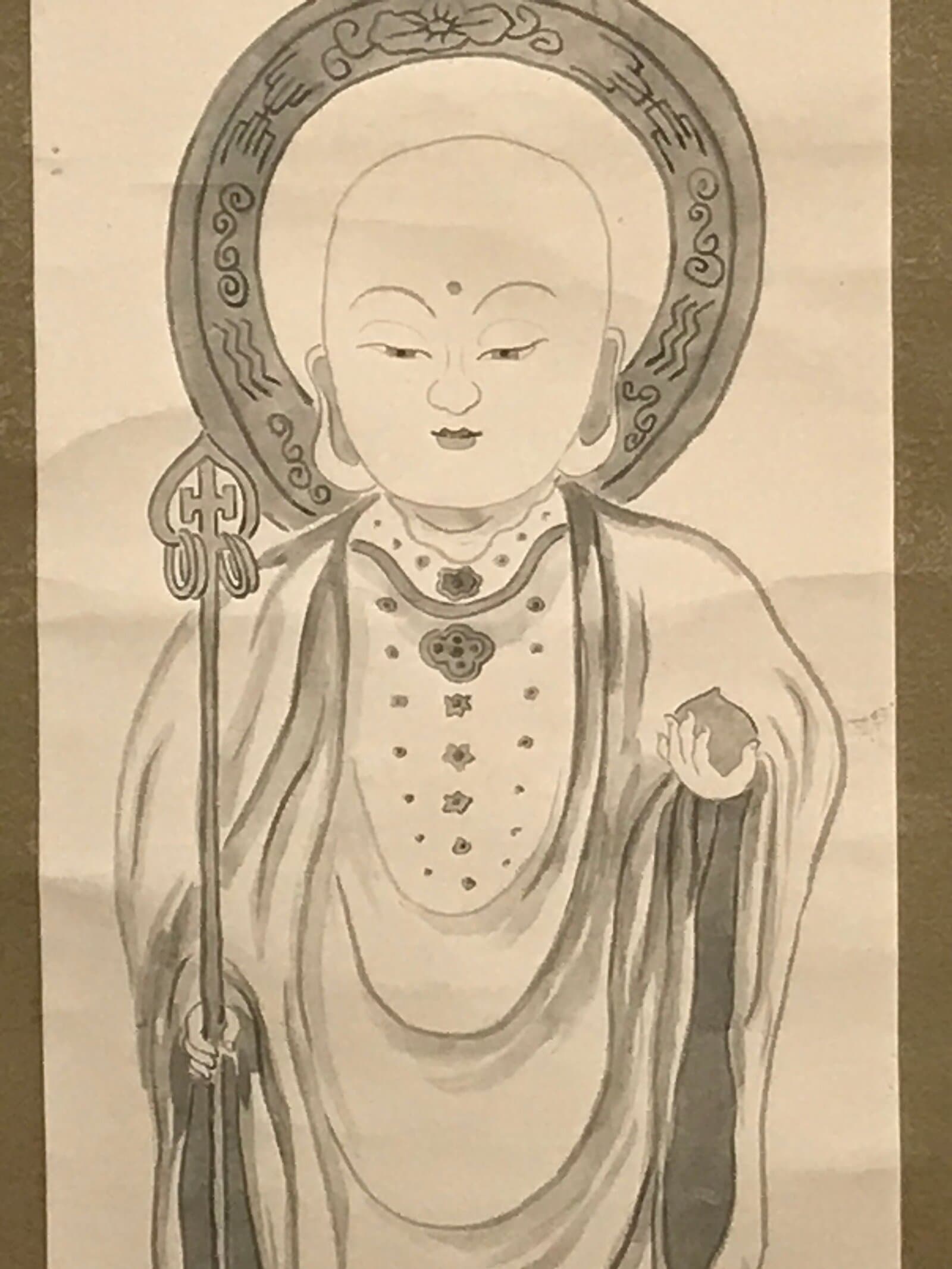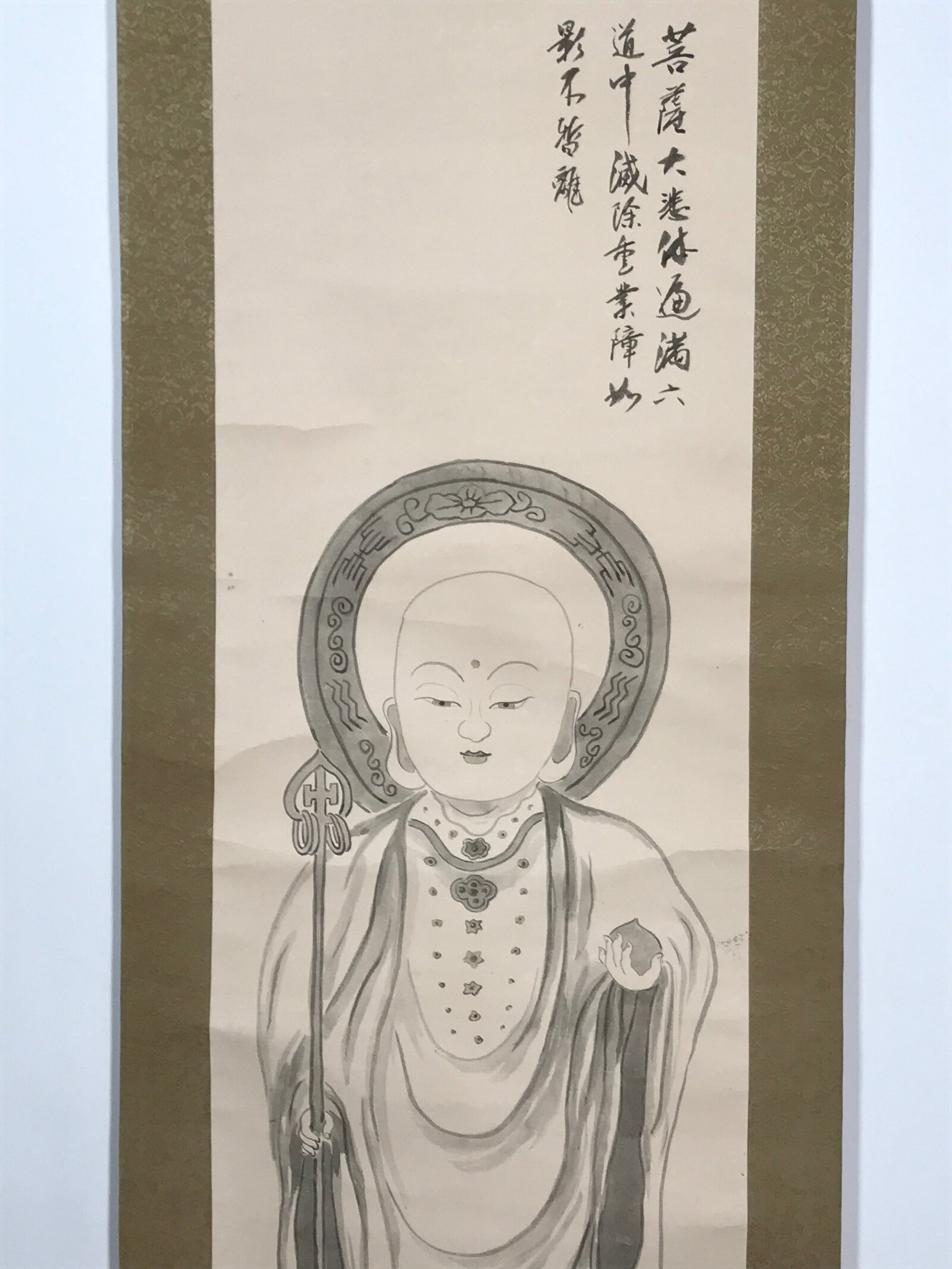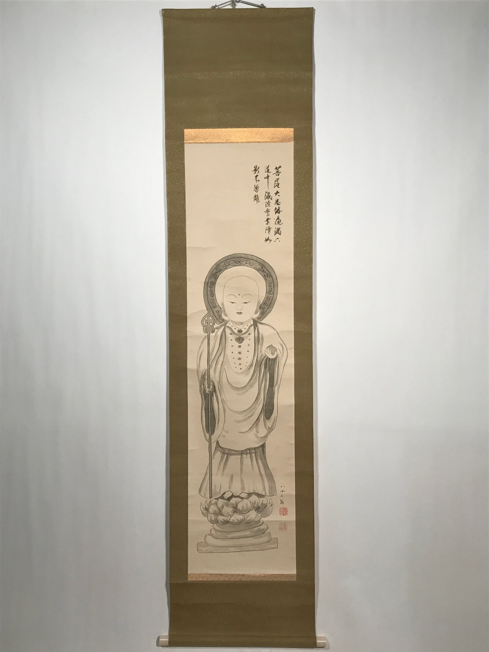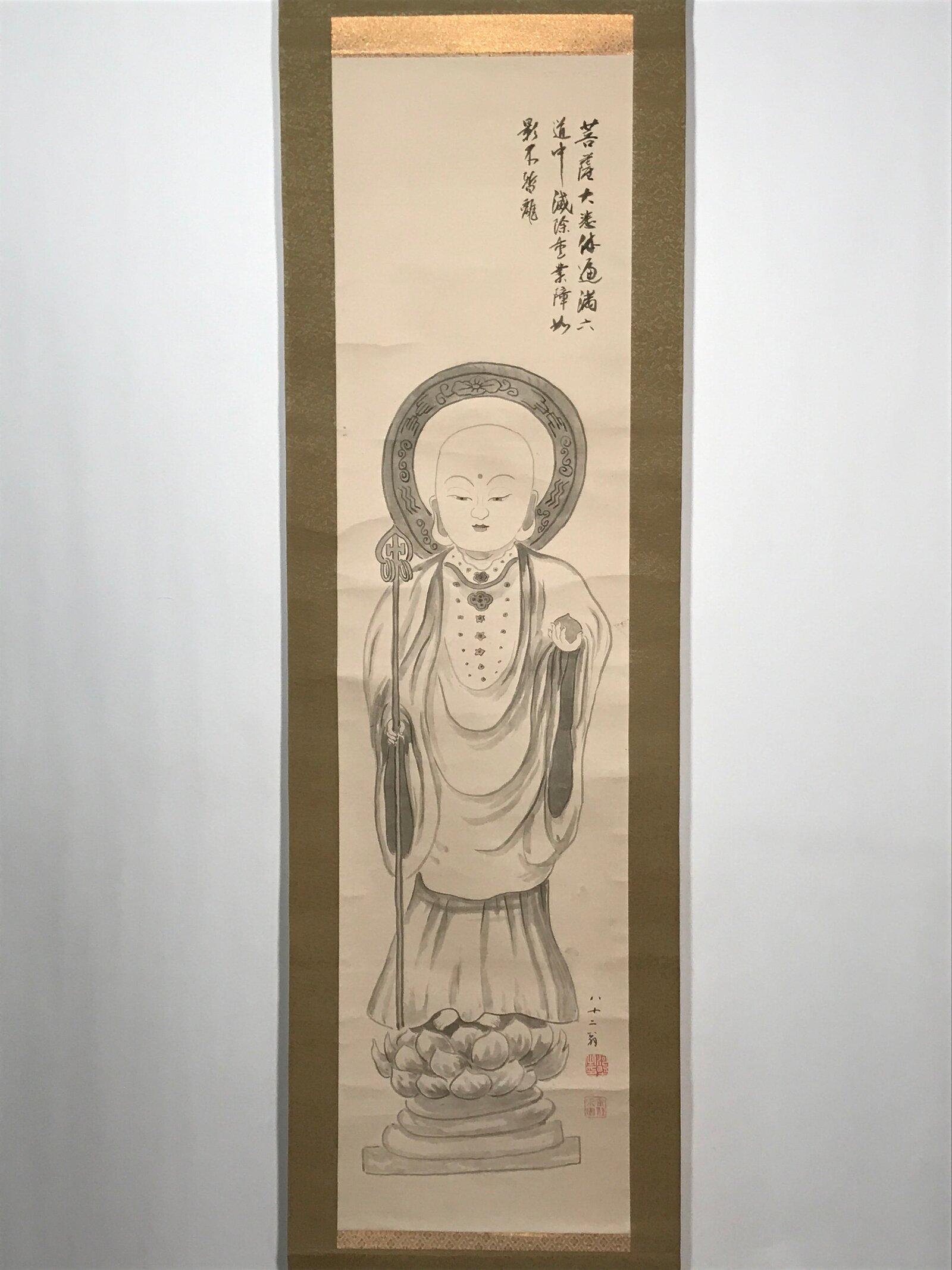 January 22, 2026Japanese Boxed Hanging Scroll Vtg Standing Jizo Buddhist Kakejiku Chagake SC959