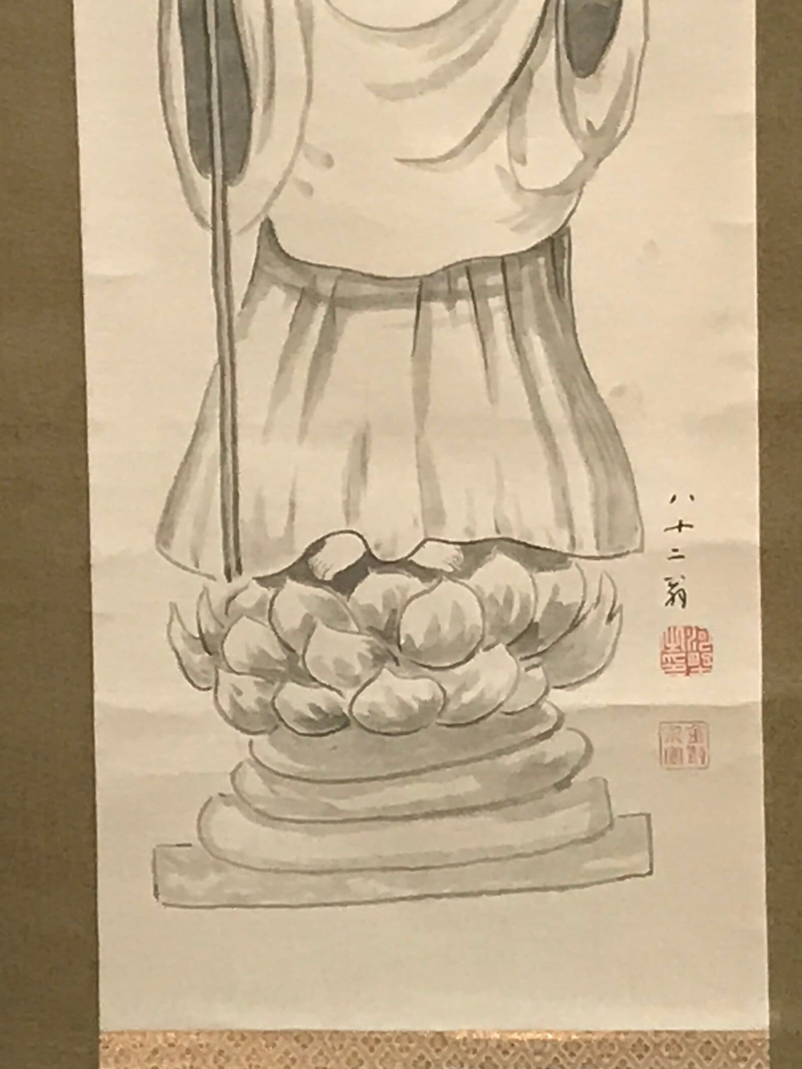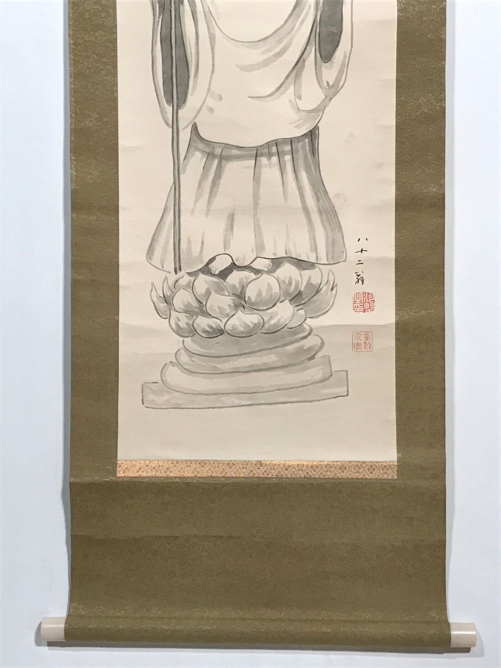 This vintage Japanese hanging scroll (kakejiku or makimono) features an illustration of a Boddhisatva statue standing on a lotus-flower-shaped stone. There is a calligraphed poem on the top right. This piece is signed with a name and red seals. It is stored in a paper box.