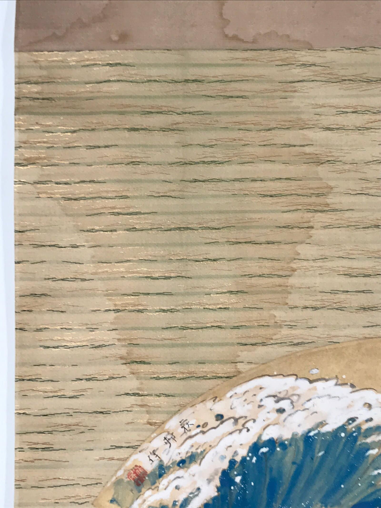 This vintage Japanese hanging scroll (kakejiku or makimono) features a seascape with big waves crashing and a round red sun, inside a fan shape. This piece is signed with a name and a red seal.