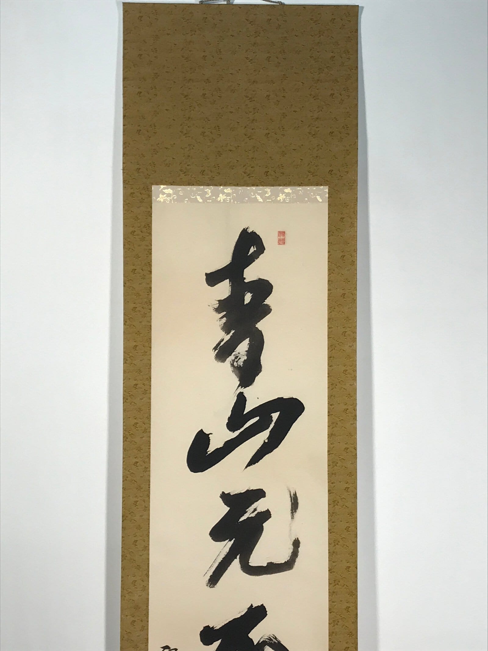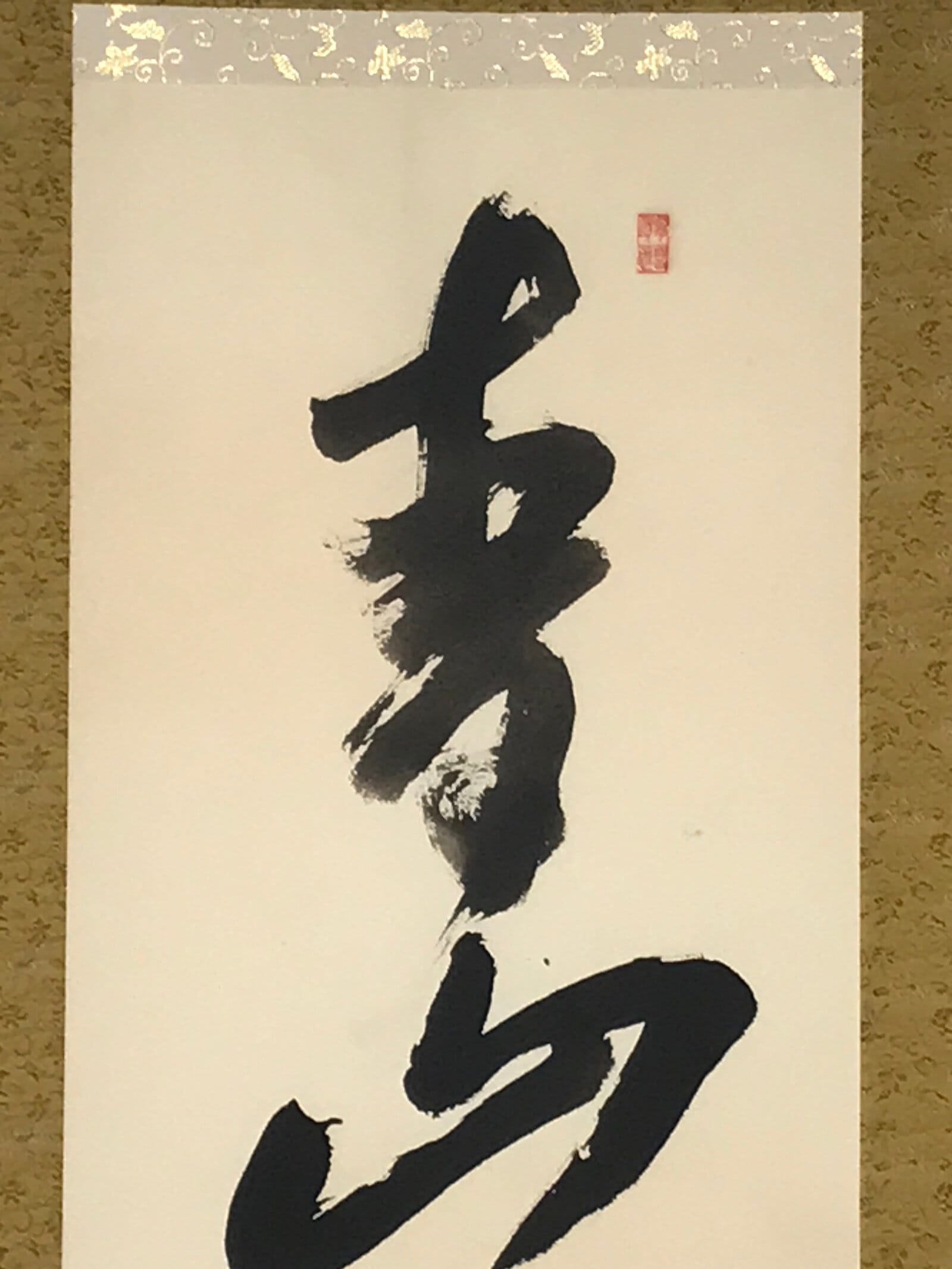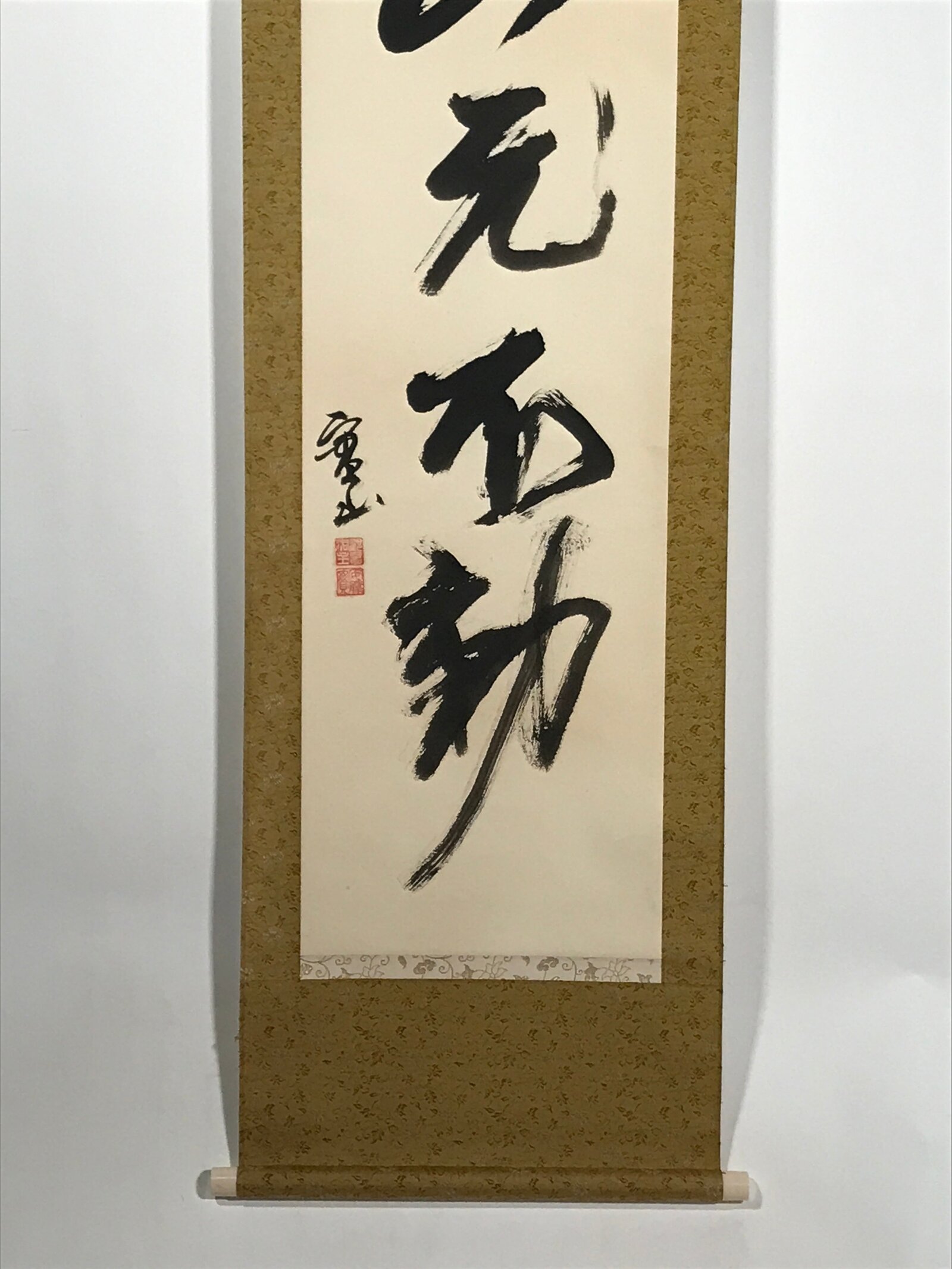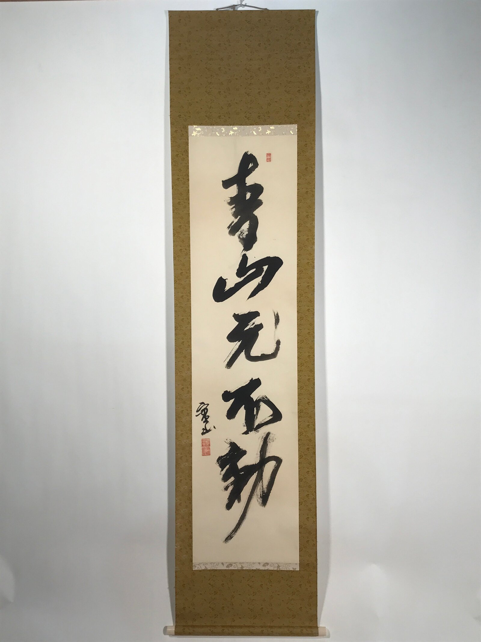 This vintage Japanese hanging scroll (kakejiku or makimono) features black-ink calligraphy with five big Japanese kanji characters: 青山元不動, translating to ‘the mountains remain calm and serene’. This piece is titled and signed with a name and red seals.