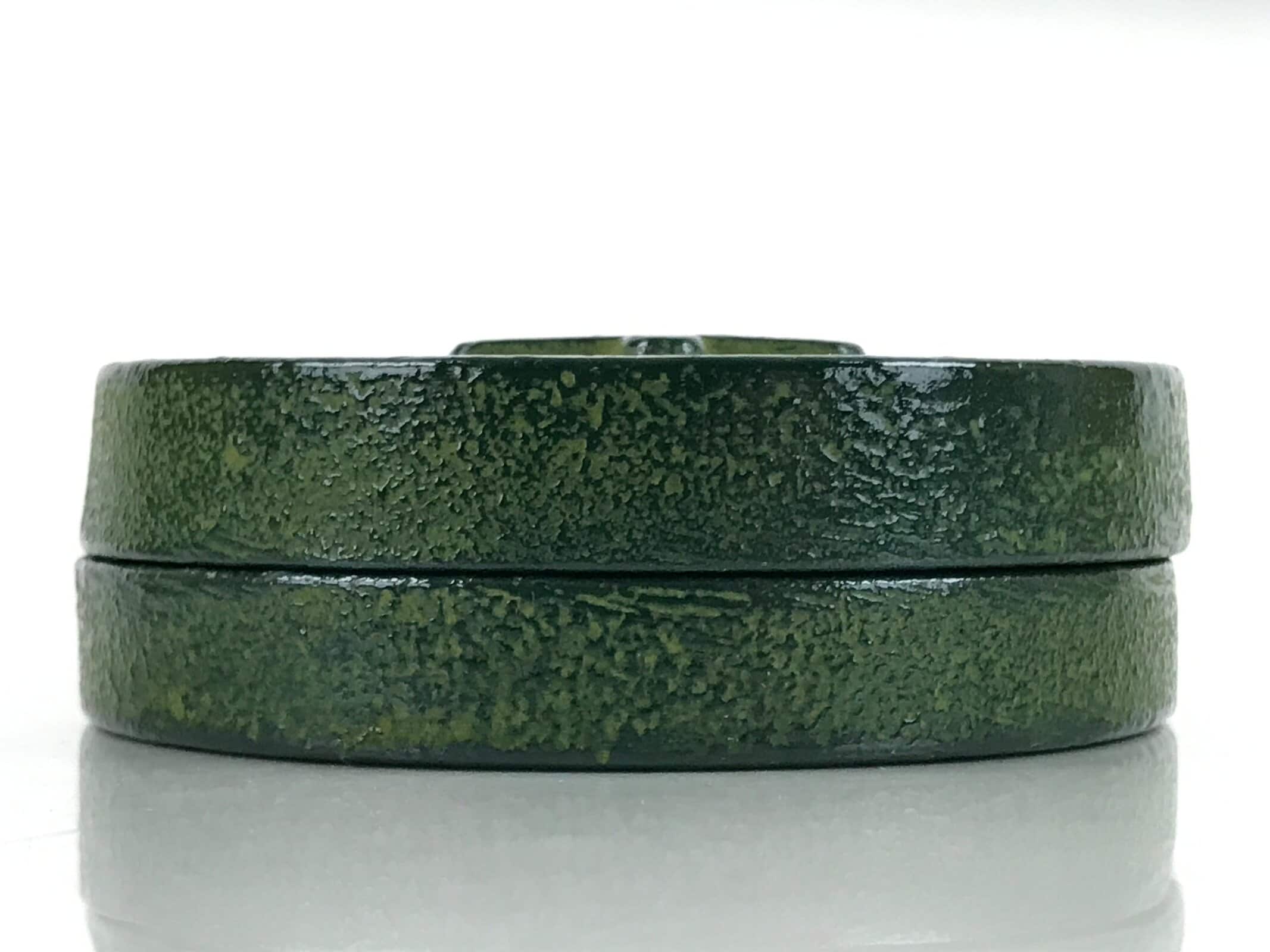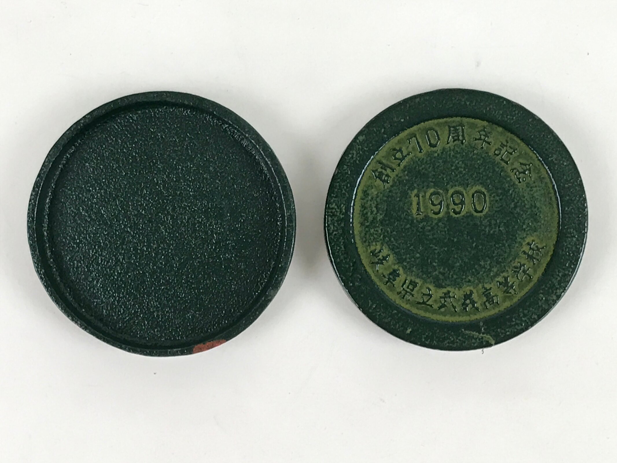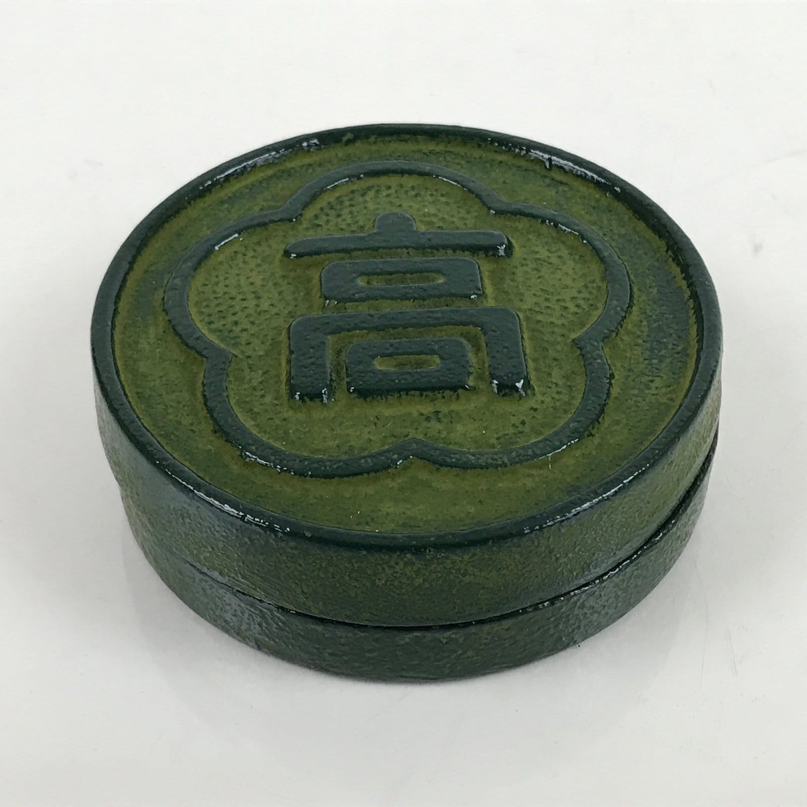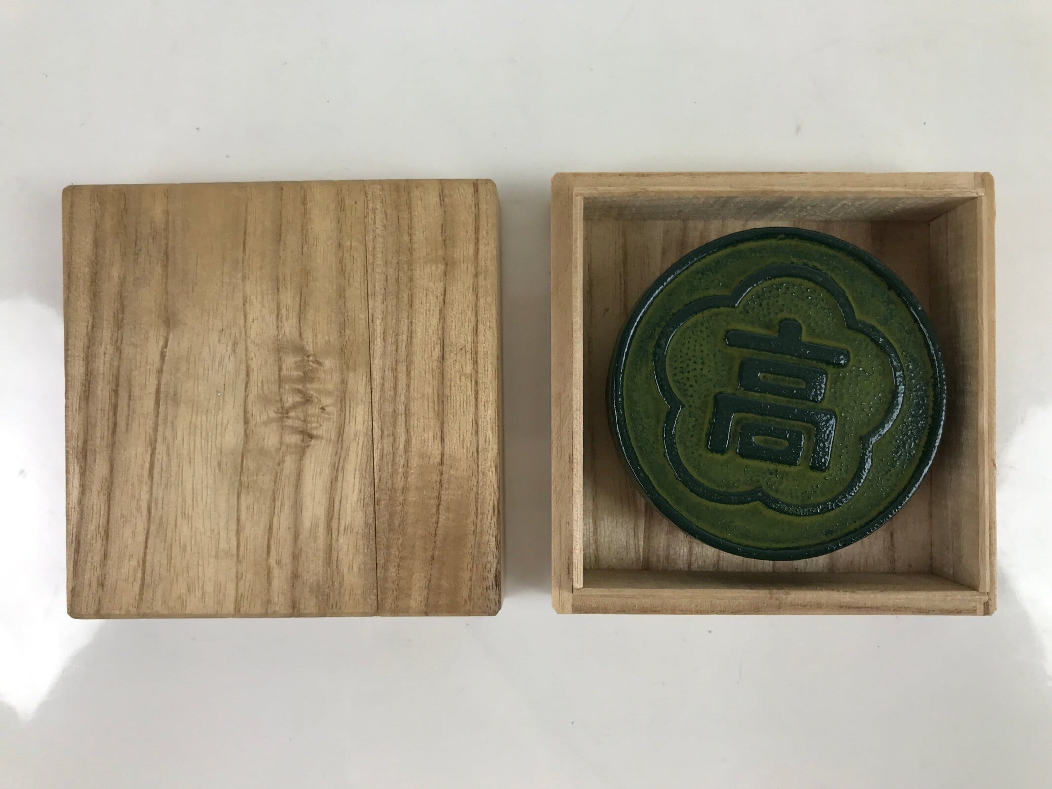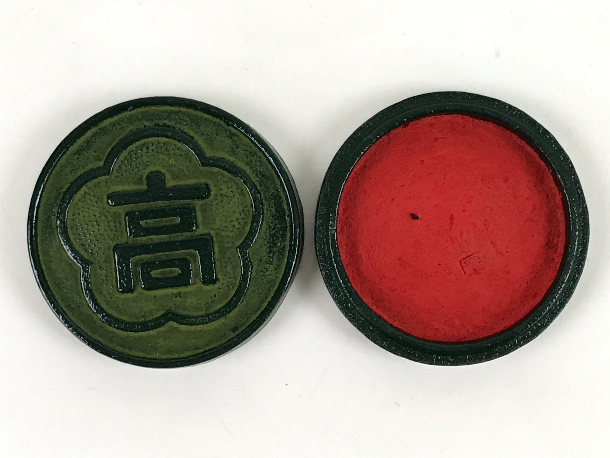 This is a vintage Japanese vermilion ink pad with a lid. This type of ink is used for Hanko or Inkan, the Japanese seals. The container is green and made of cast iron. Kanji of 高 and cherry blossom design on the lid. There are Kanji on the bottom. This case comes with a wooden box.