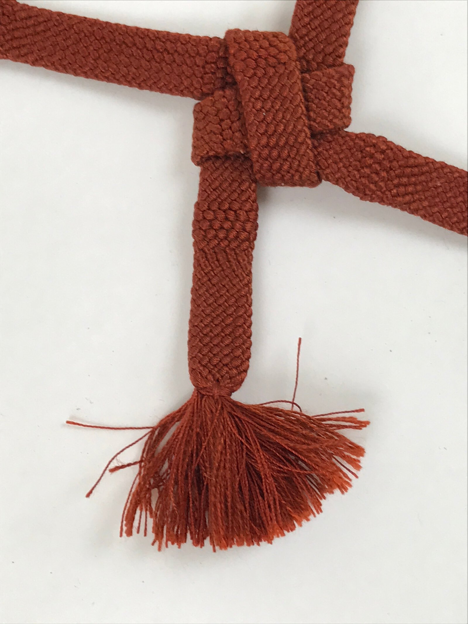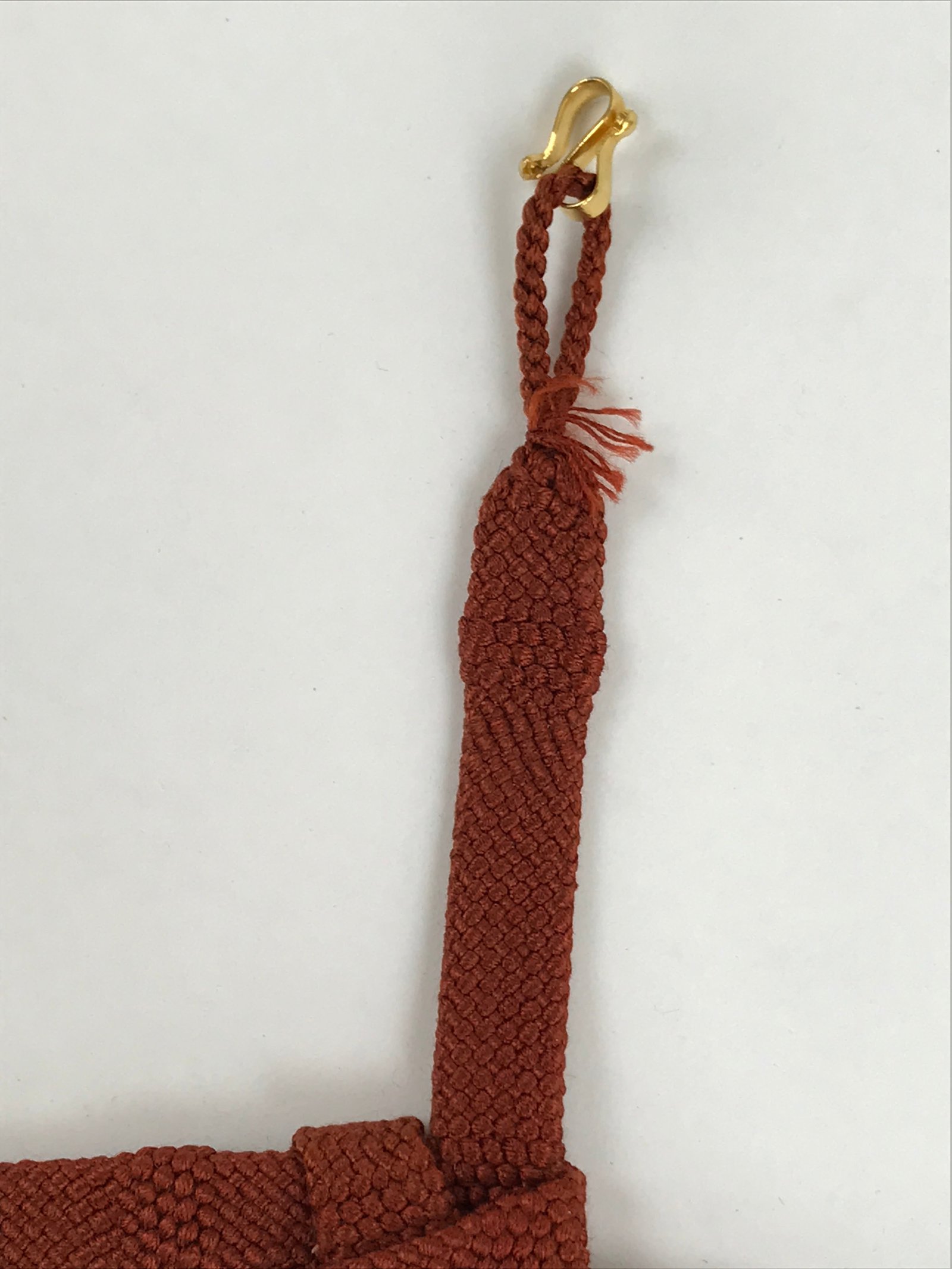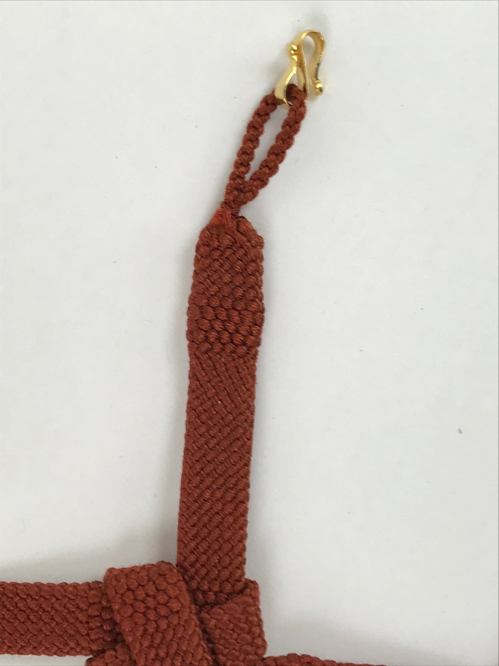 This is a Japanese vintage braided silk haori himo. One of many different styles of kumihimo cords is a solid reddish-brown color with thicker braid accents on the top and bottom. This haori himo is made of two pieces knotted together in a square pattern that showcases all the intricate braid patterns. It comes with S-hooks to attach to the haori.
