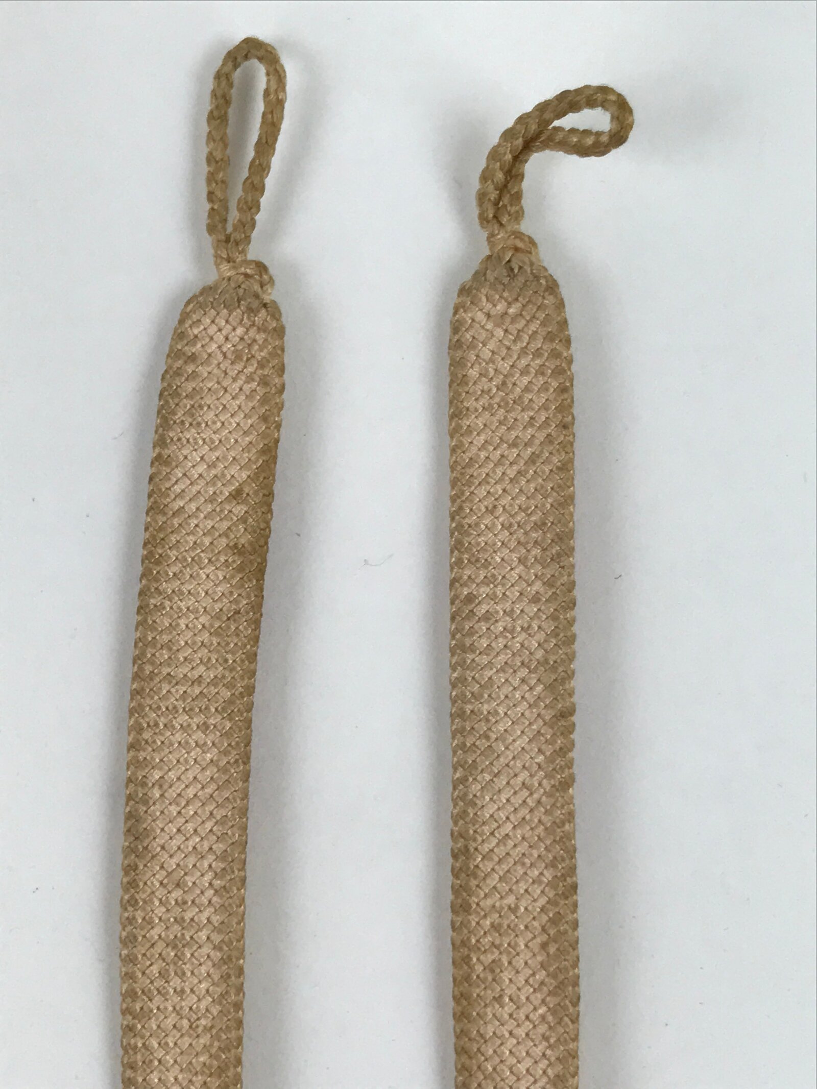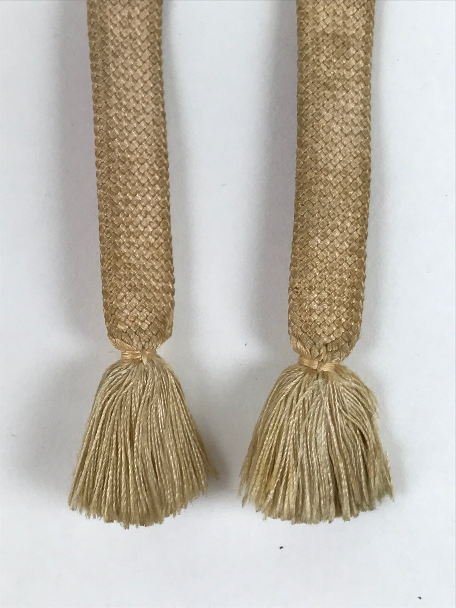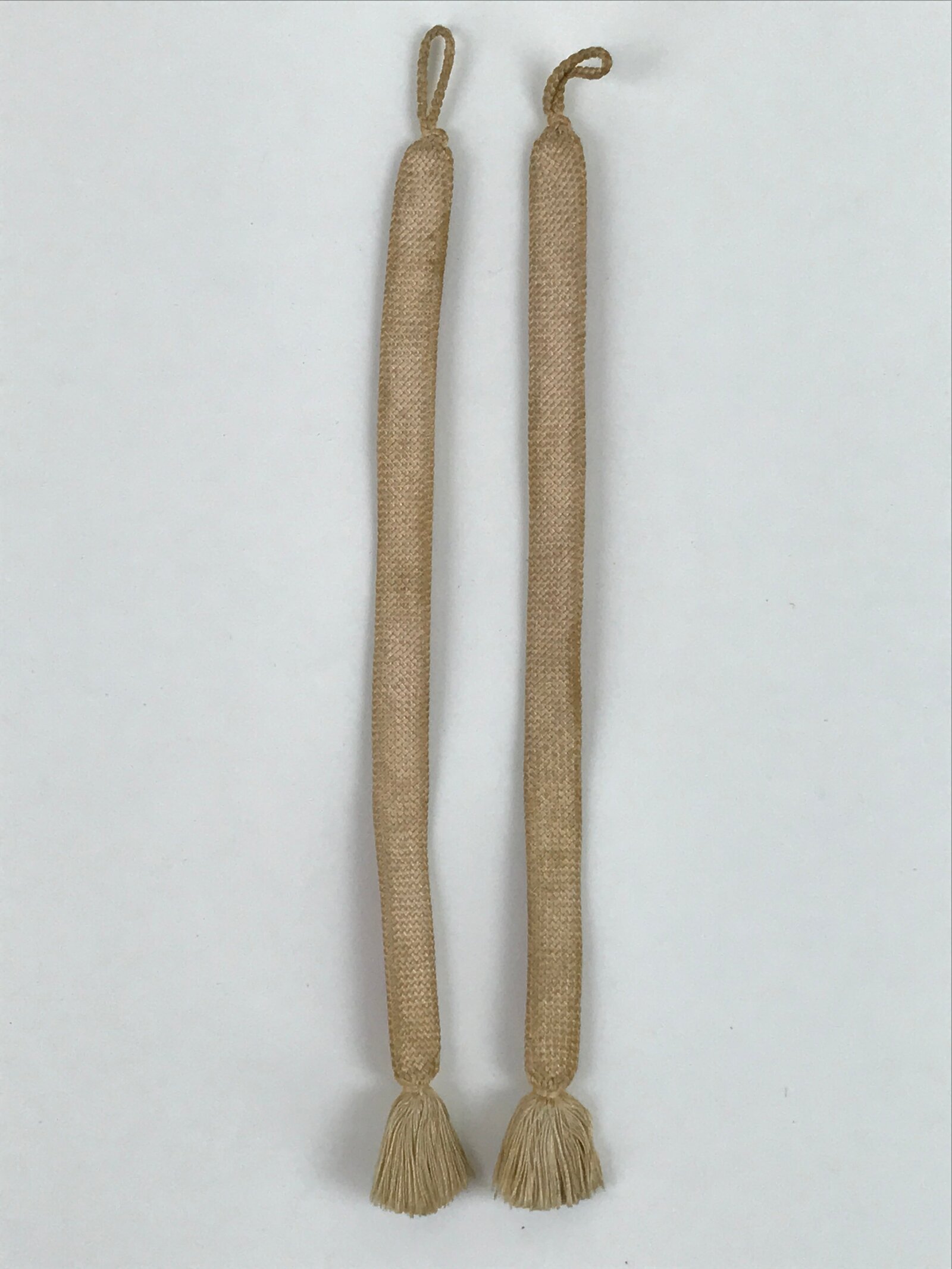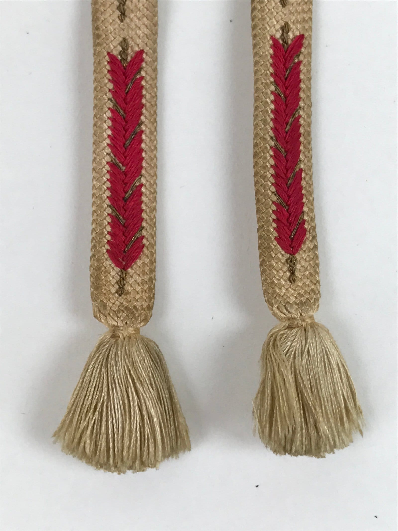 This is a Japanese vintage braided silk haori himo. One of many different styles of kumihimo cords, this pair of cords are mostly a soft tan/beige color with hot pink feathery designs mimicking fletching on arrows. These two pieces would be tied in a traditional-style knot for decorative appeal.