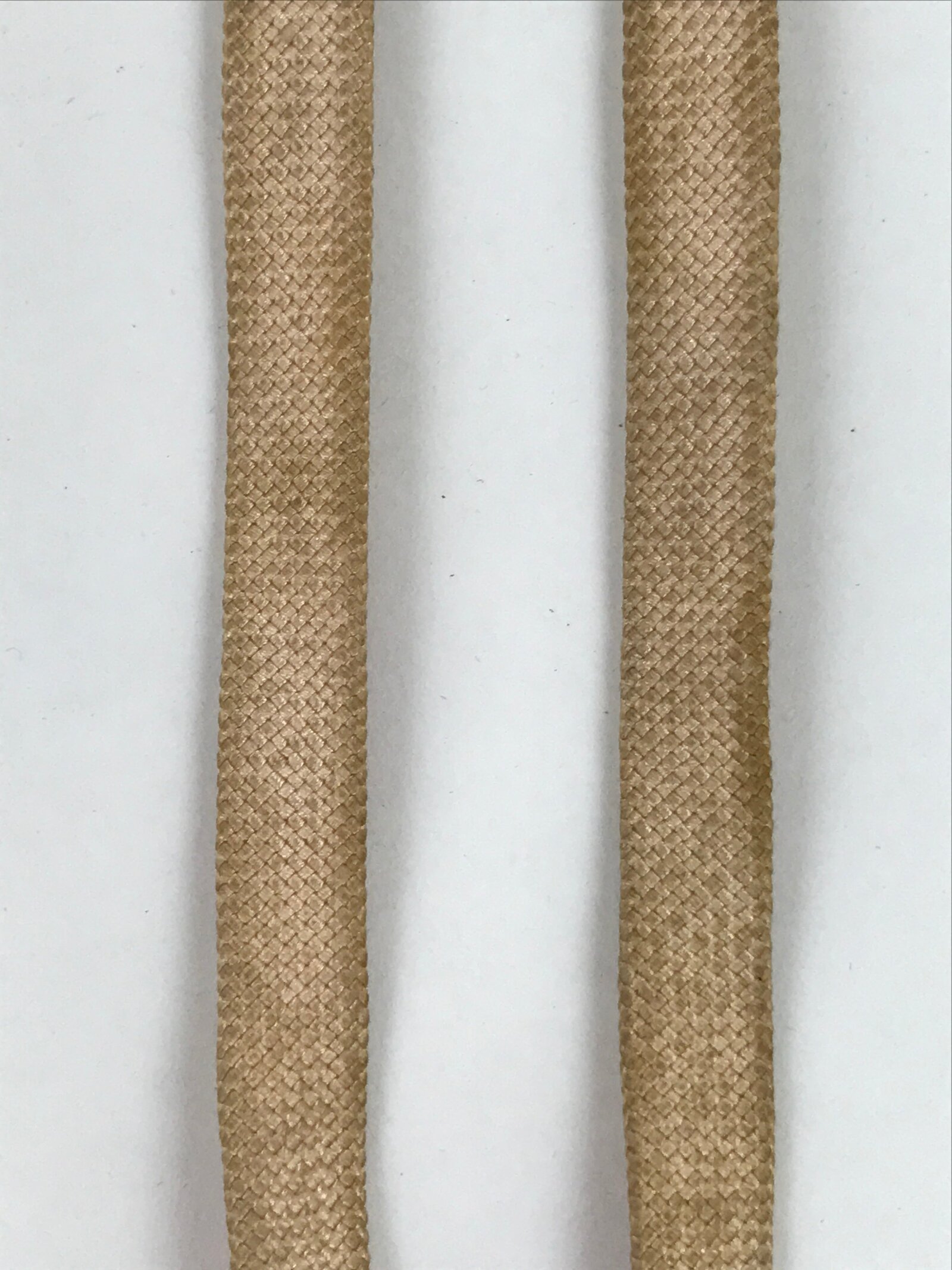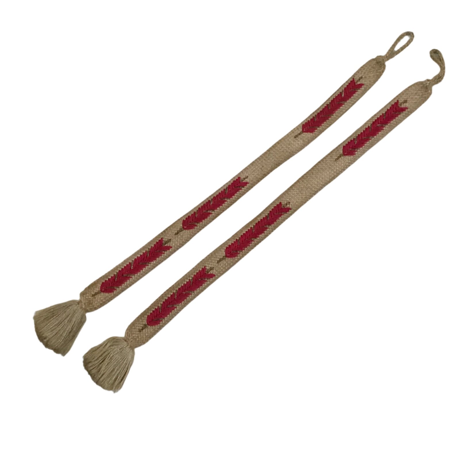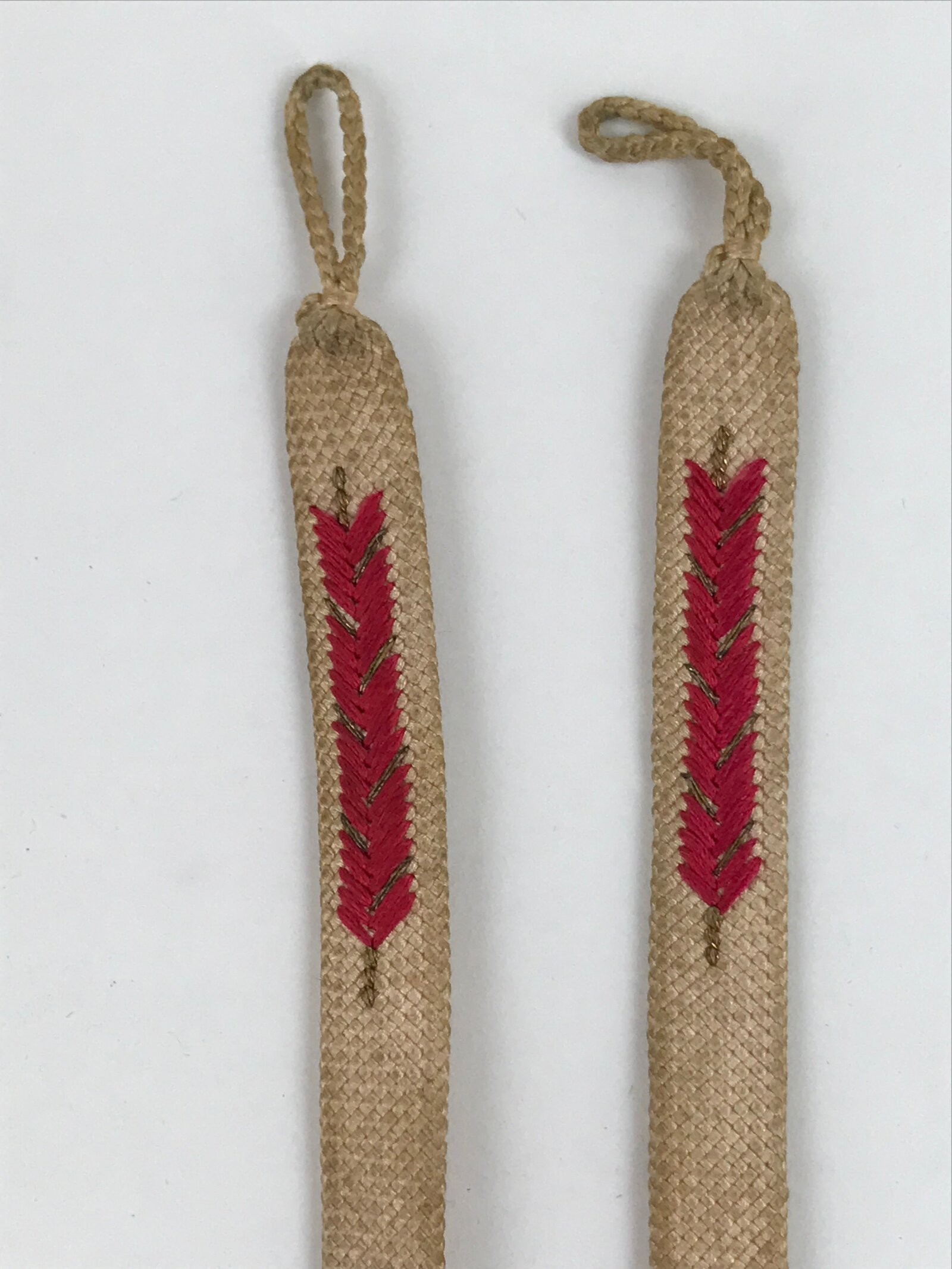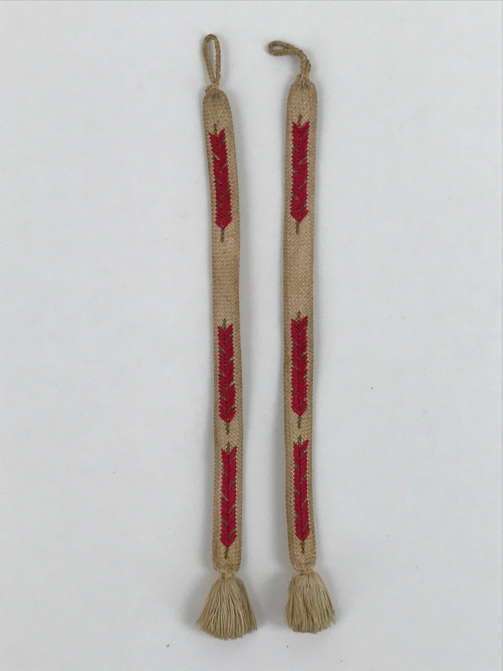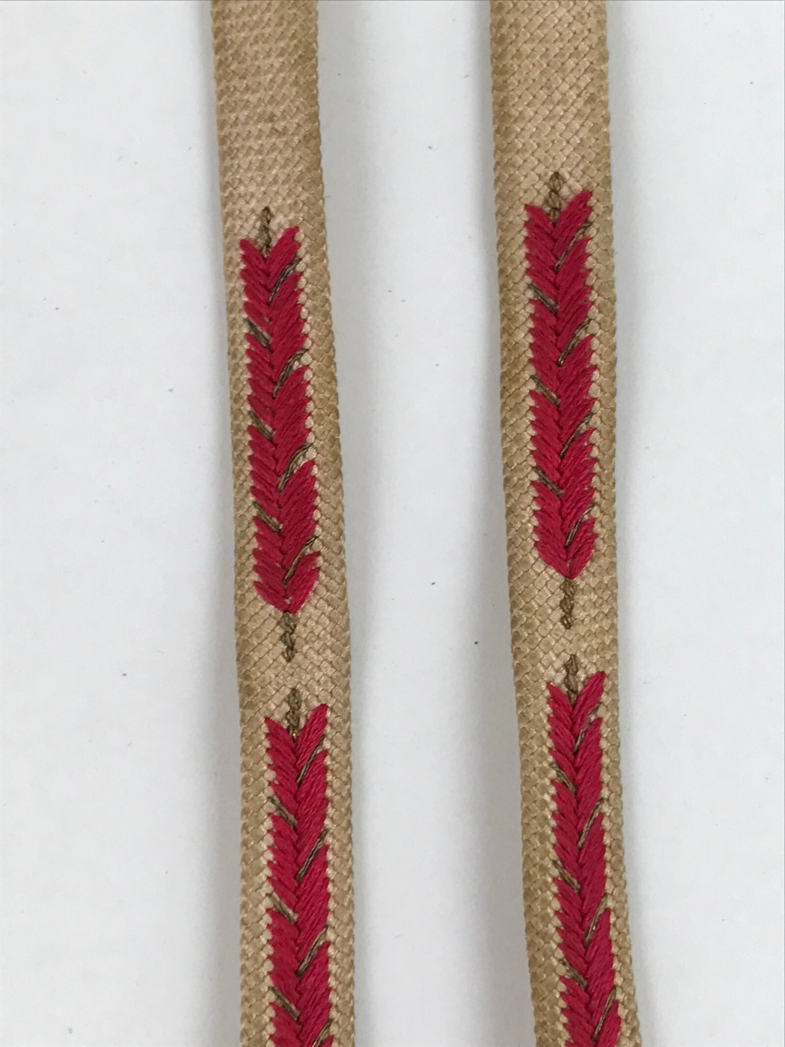 This is a Japanese vintage braided silk haori himo. One of many different styles of kumihimo cords, this pair of cords are mostly a soft tan/beige color with hot pink feathery designs mimicking fletching on arrows. These two pieces would be tied in a traditional-style knot for decorative appeal.