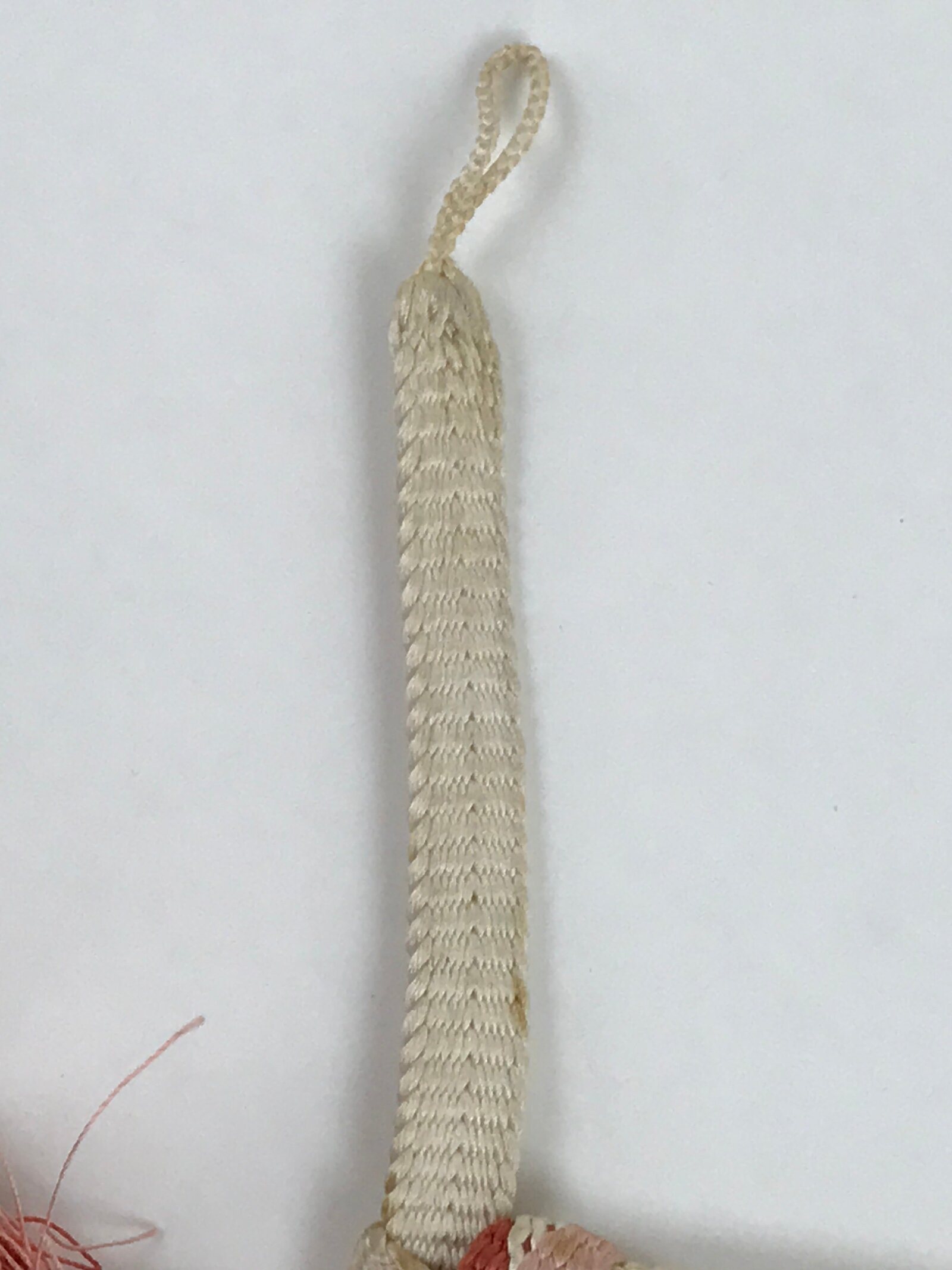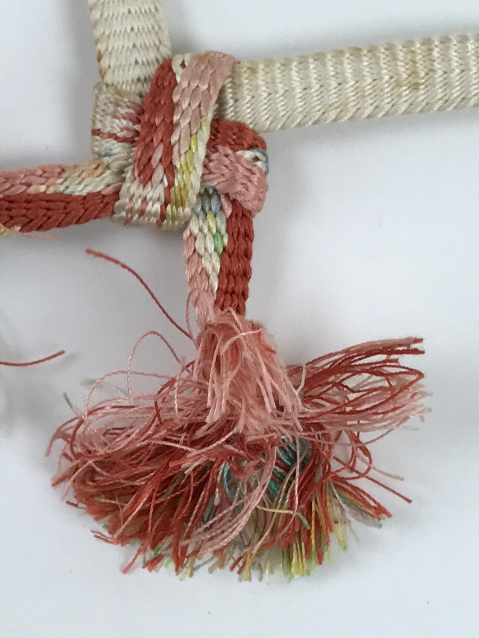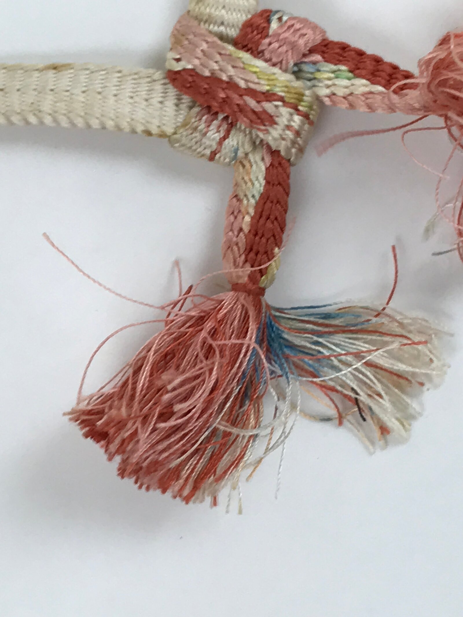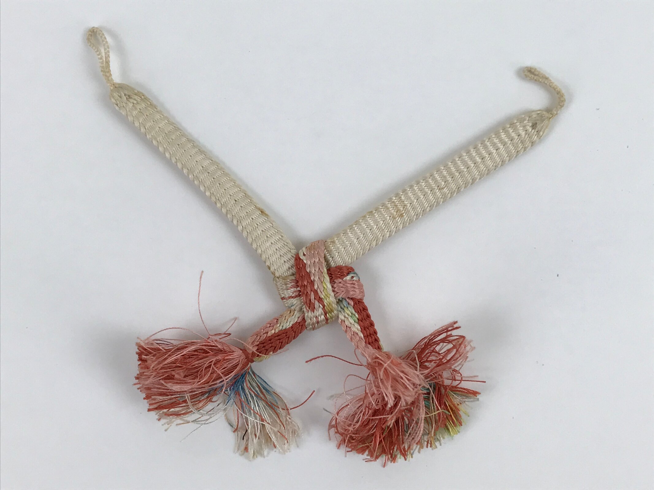 This is a Japanese vintage braided silk haori himo. One of many different styles of kumihimo cords, it is white on the top ends with a colorful bottom and tassel in pink, red, and a light blue. This haori himo is made of two separate pieces that comes already knotted together in a square pattern that showcases all the colors.
