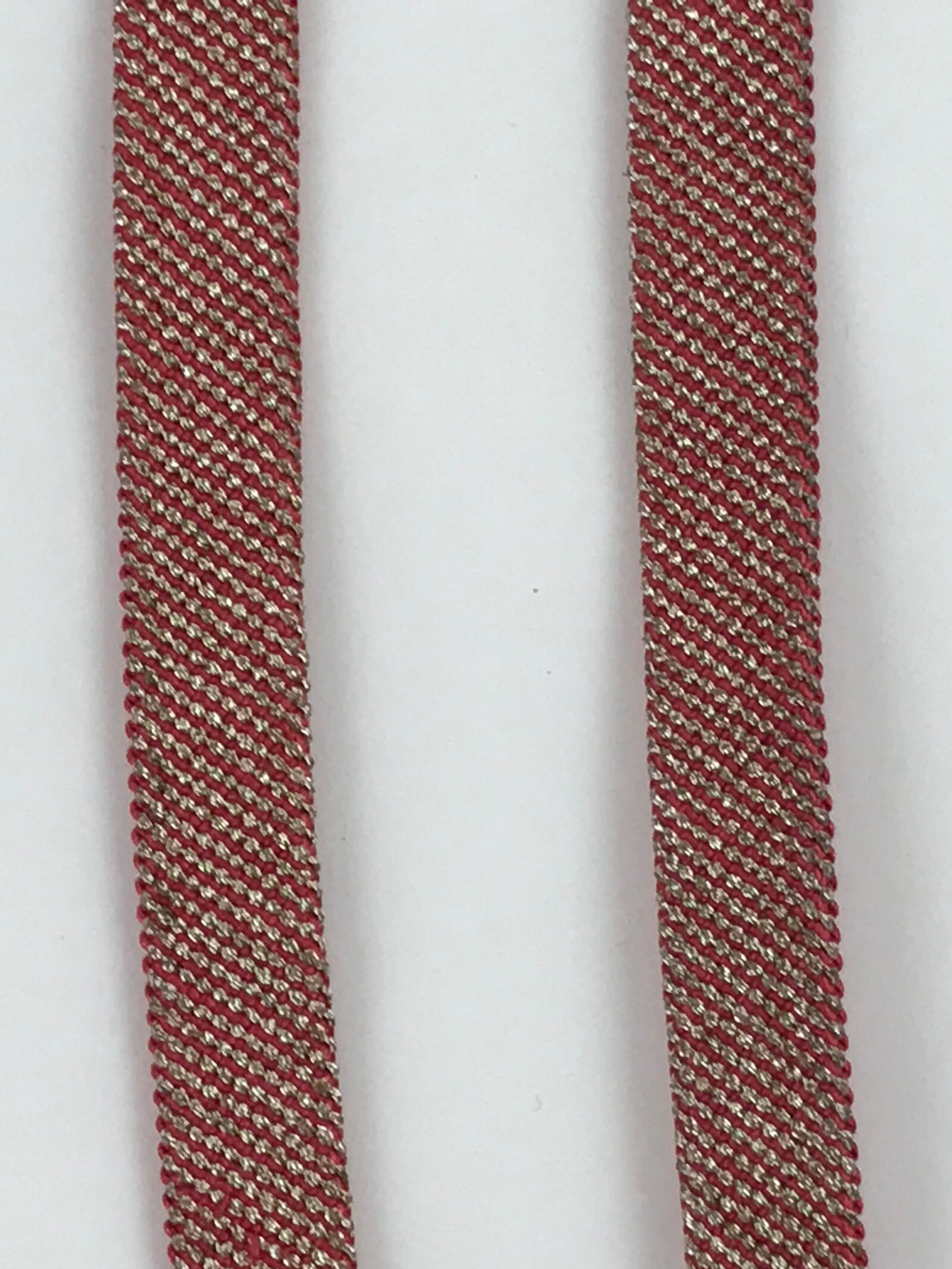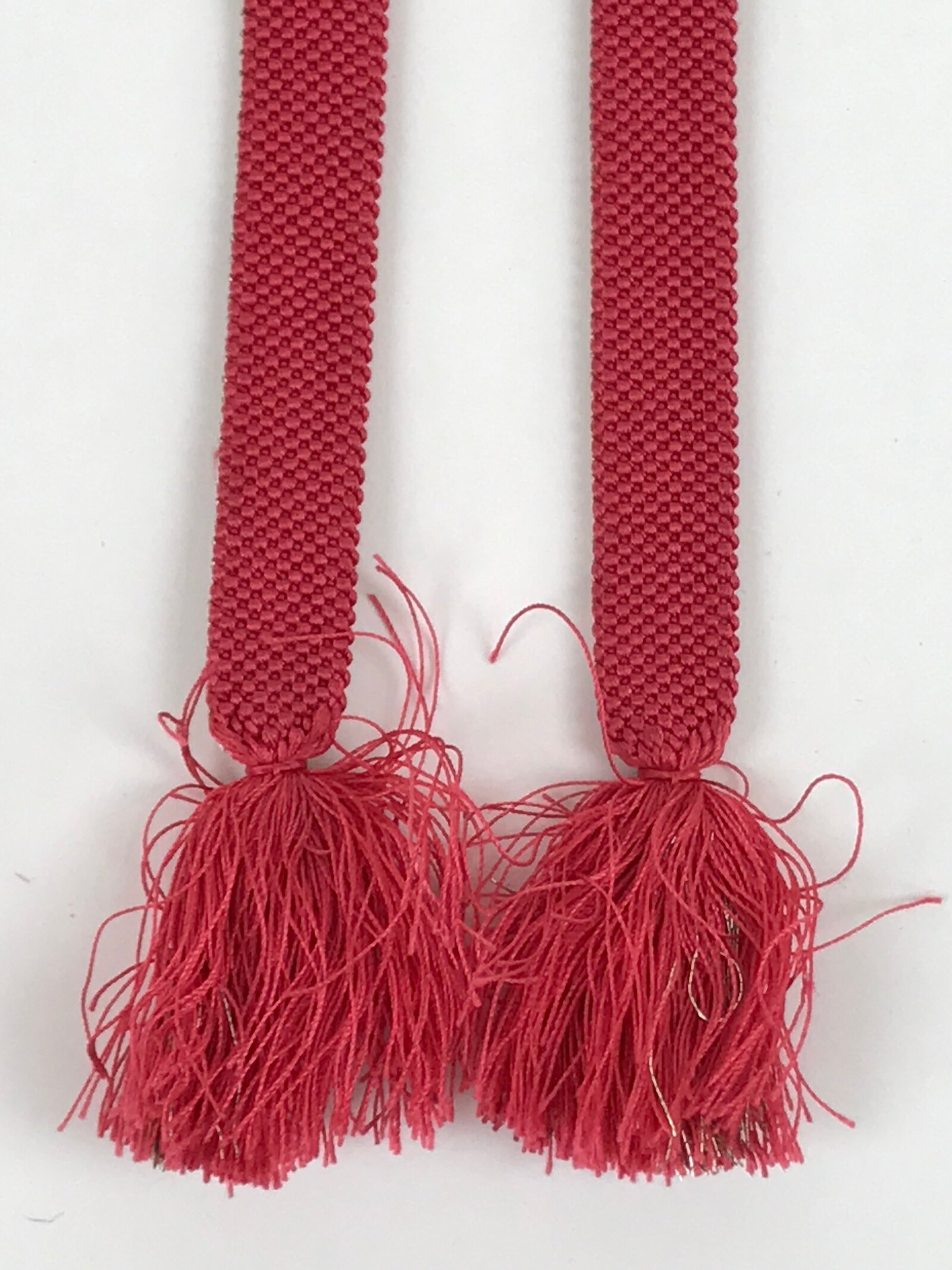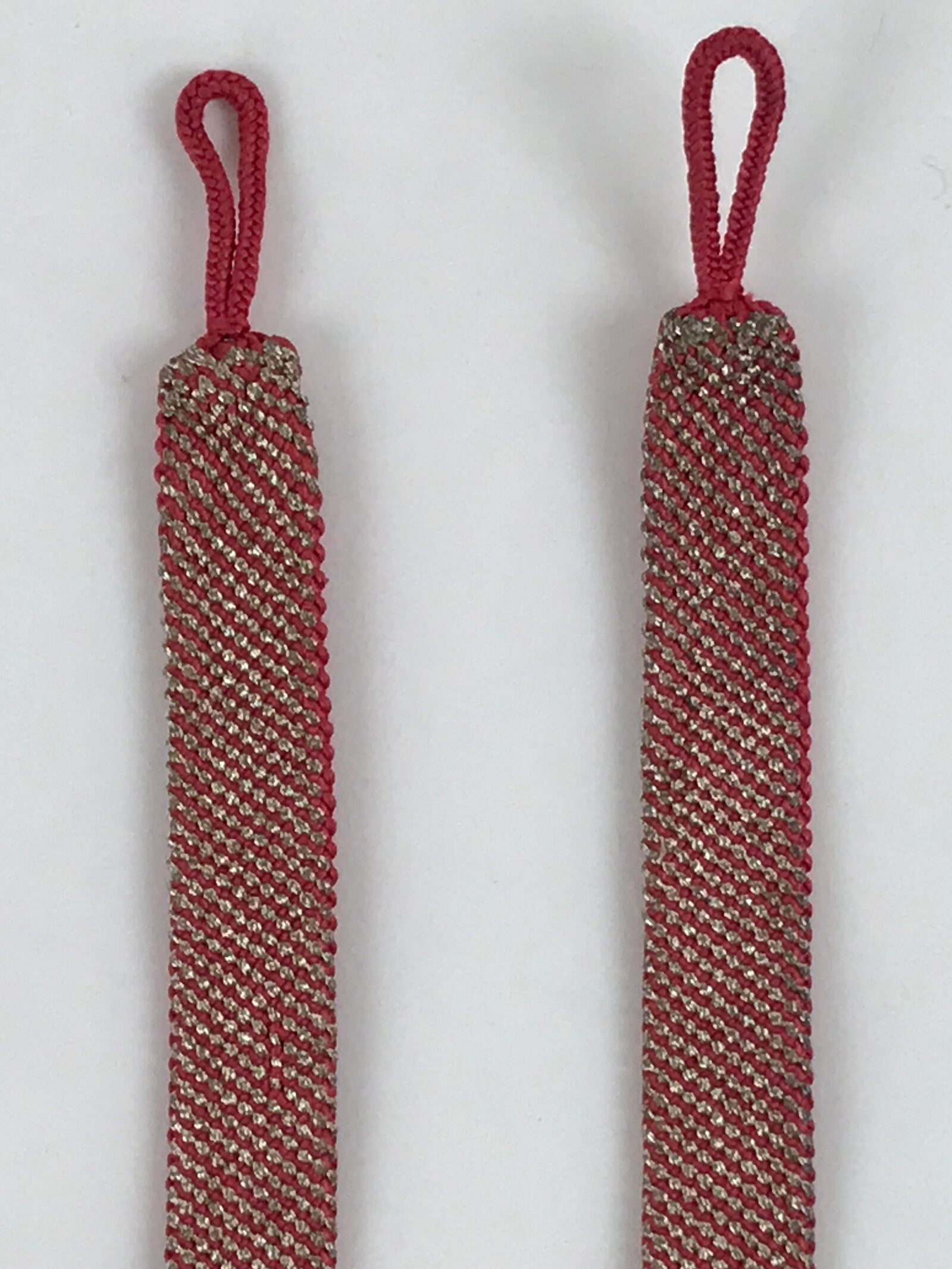 This is a Japanese vintage braided silk haori himo. One of many different styles of kumihimo cords, this pair of flat cords are a bright hot pink on one side and silver on the other with pink tassels. These two pieces would be tied in a traditional-style knot for decorative appeal.