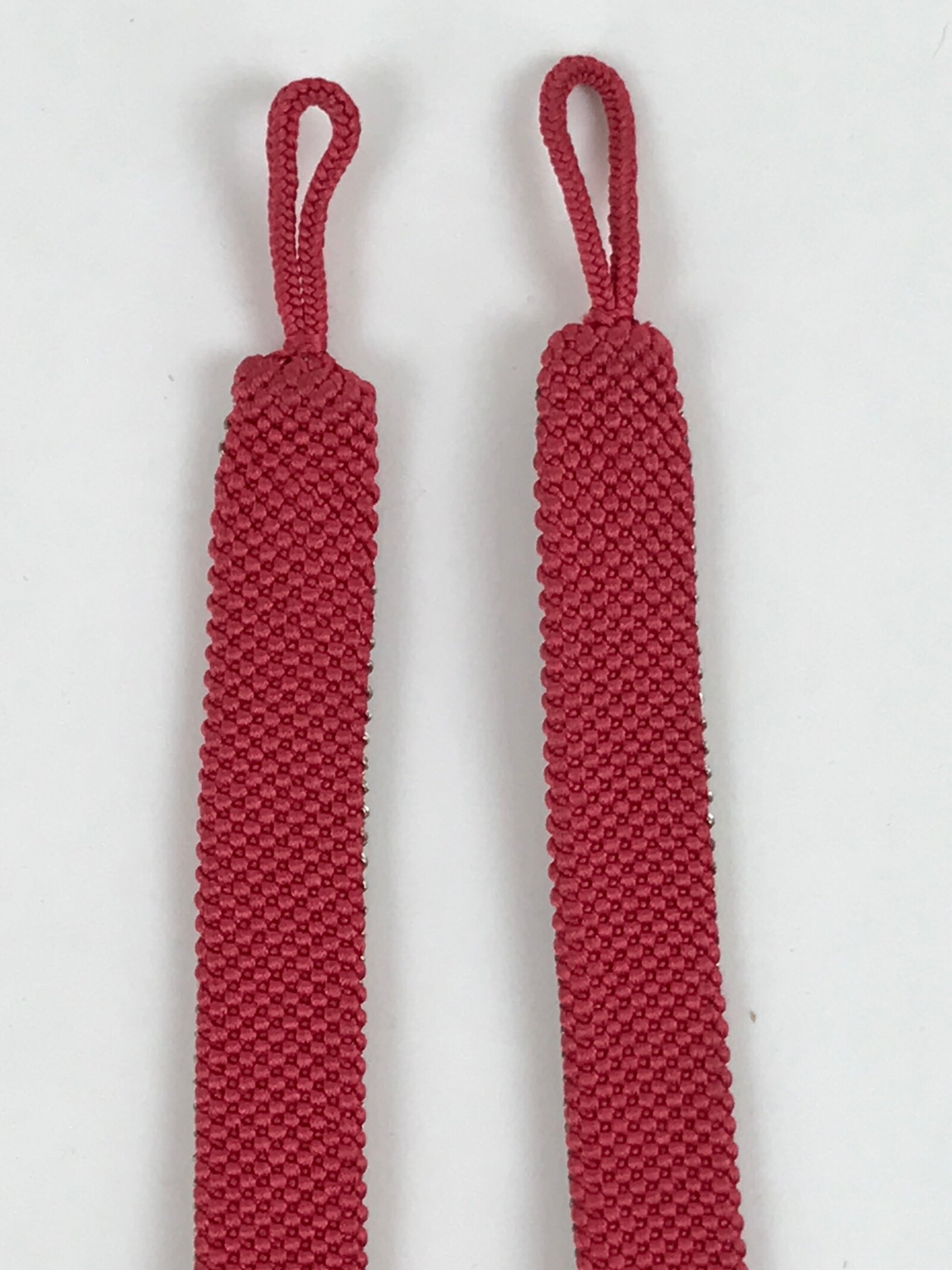 A haori himo is a decorative cord, chain, or string that holds the kimono’s haori (jacket) closed and in position. There is a string cord tie type, a type of glass ball passed through a braided cord, and recently a magnetic type. They attach to the haori via loops at on the jacket’s collar using small clasps or hooks.