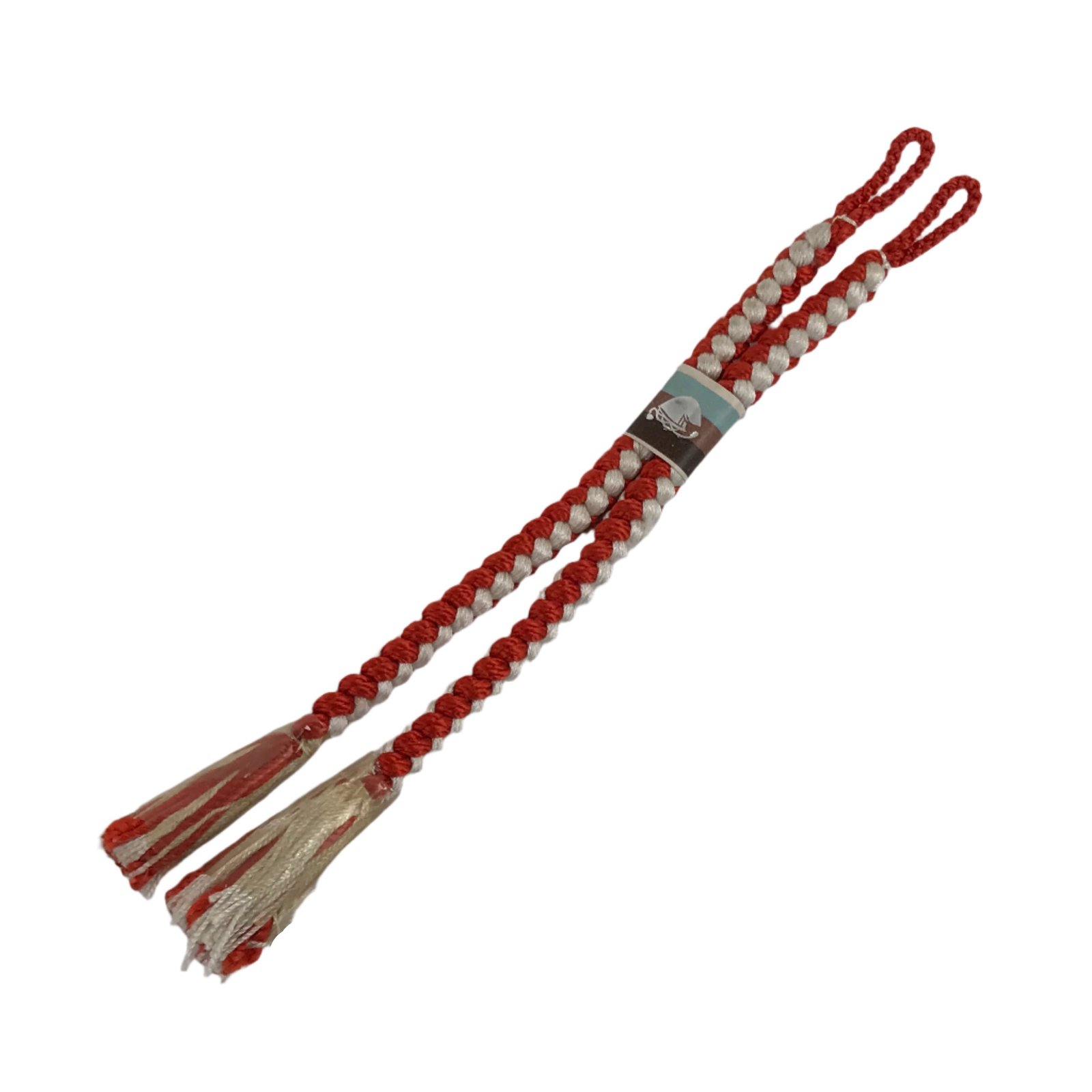 This is a Japanese vintage braided silk haori himo. One of many different styles of kumihimo cords, this pair of round cords (marugumi) features red and white vertical stripes. These two pieces would be tied in a traditional-style knot for decorative appeal. There are plastic protectors around the tassels.