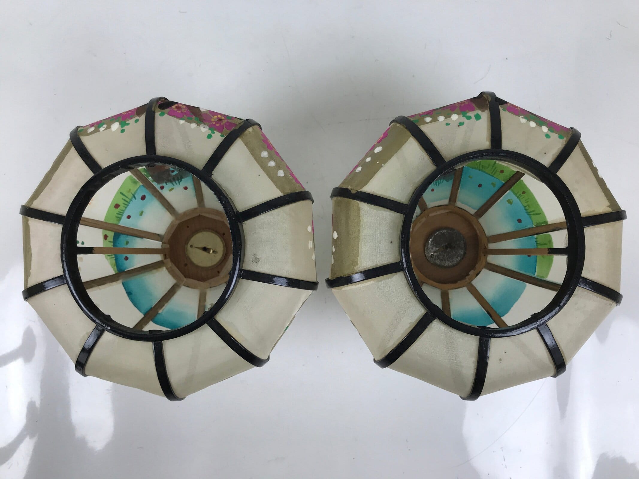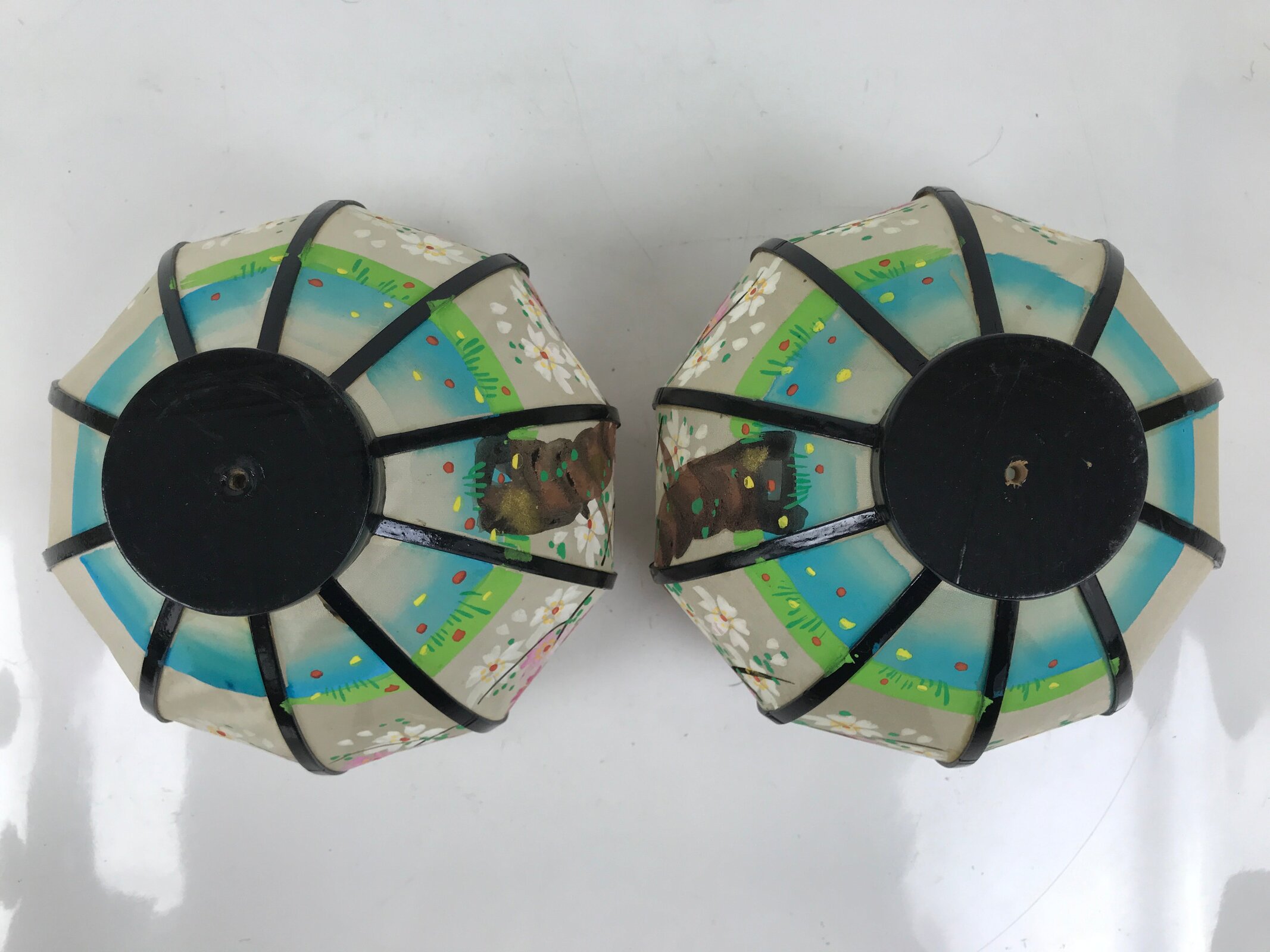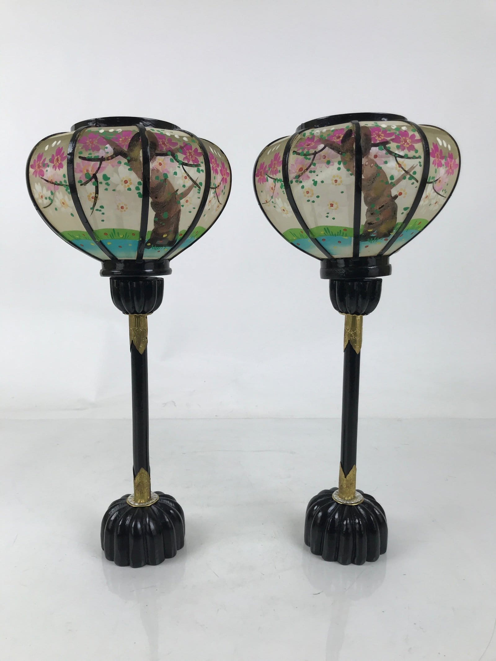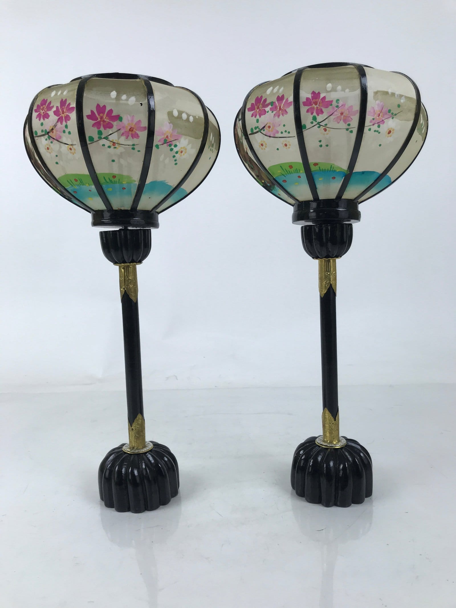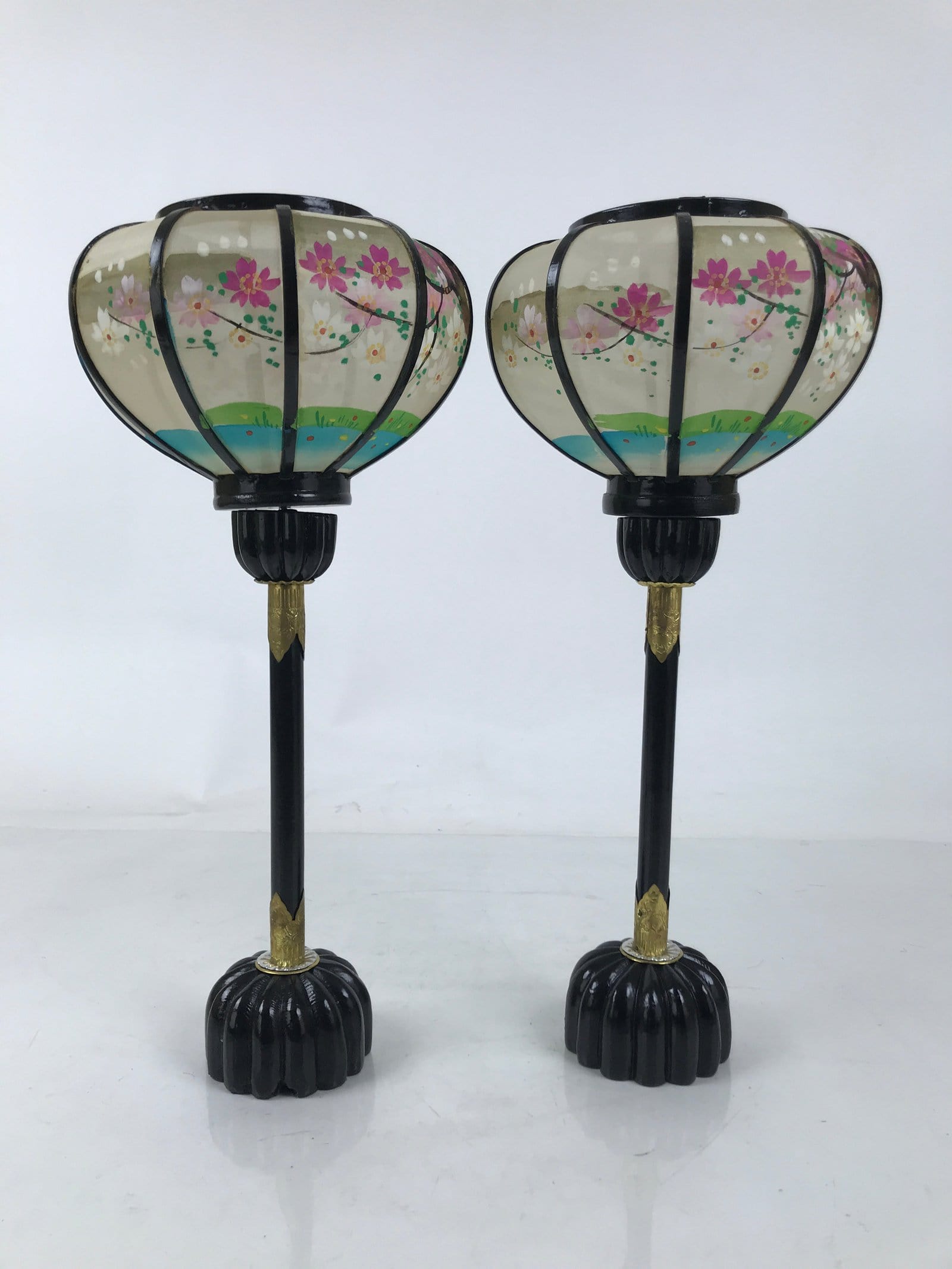 This is a vintage Hina doll furniture lantern set. A bonbori is a portable lamp traditionally used to light spaces during times without electricity (a lantern more decorative than a common brazier). This large pair of lanterns sit at the very top of a hina display at the ends. The frame and post are made of wood lacquered black with metal accents. The lantern top is made of translucent white silk and has pink cherry blossom trees hand-painted on it. The two pieces connect via a screw at the top of the post. It comes with the original paper box.