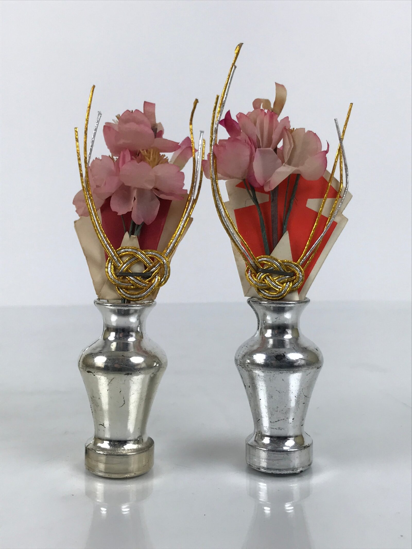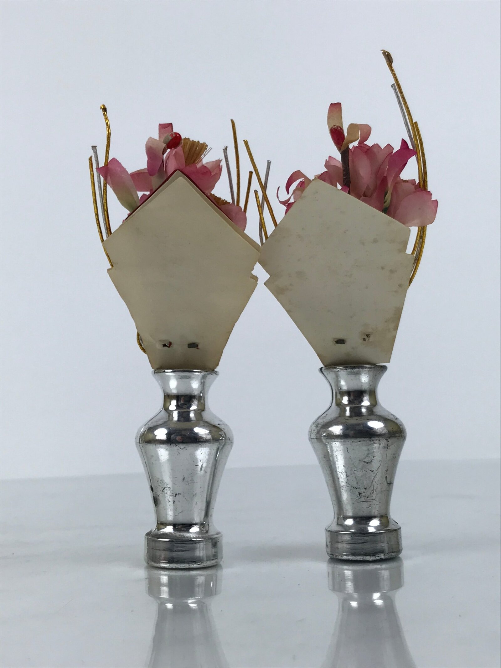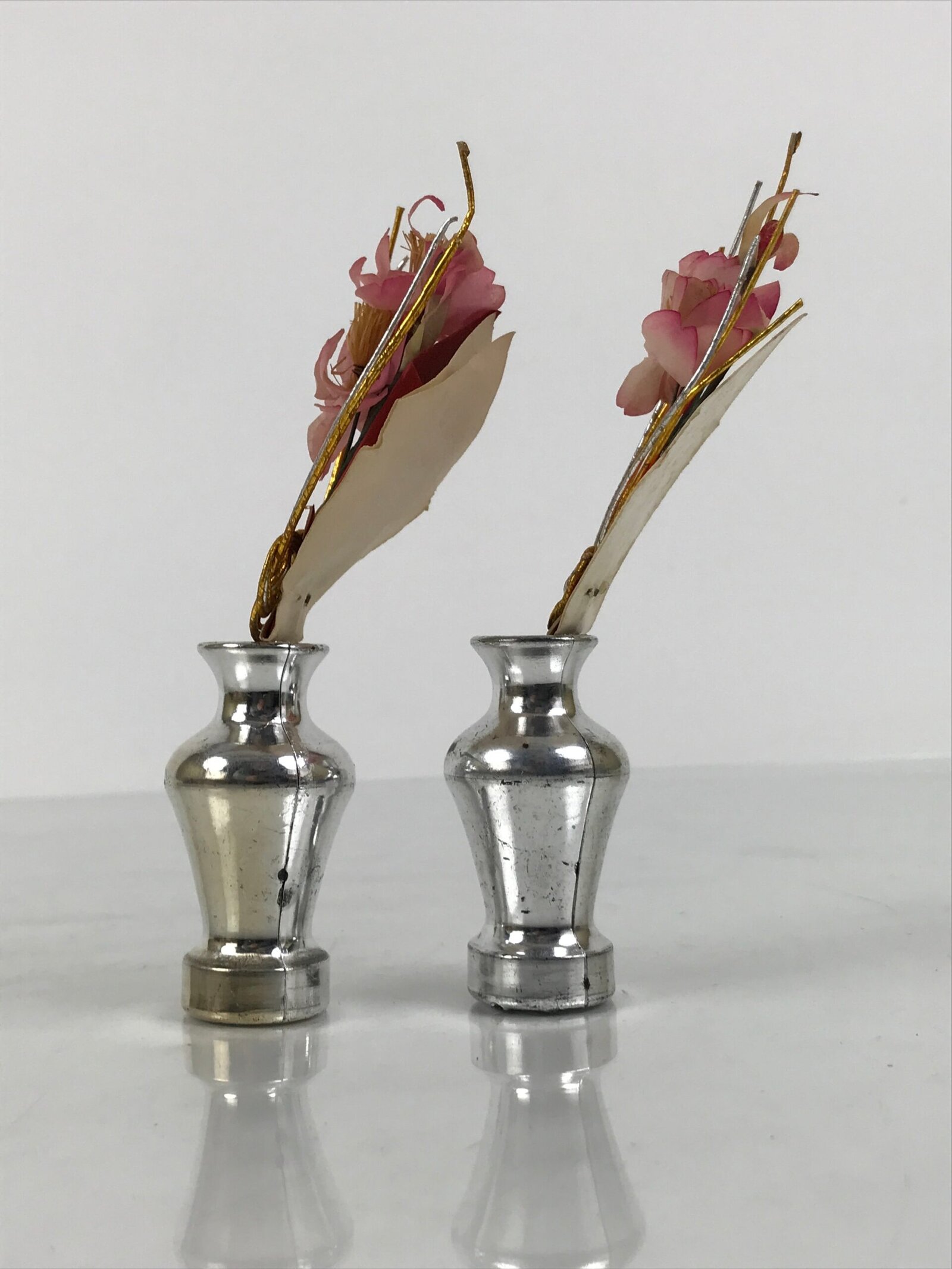 This Japanese vintage ohinasama doll accessory set of two vases with flowers is the perfect addition to any existing hina set or adds gorgeous Eastern flair to any home decor. These vases are typically placed on the hinadan, the doll shelf, as decoration. Both silver vases are resin, and the pink sakura flowers are paper. Please note: the papers behind the flowers have slightly different colors.