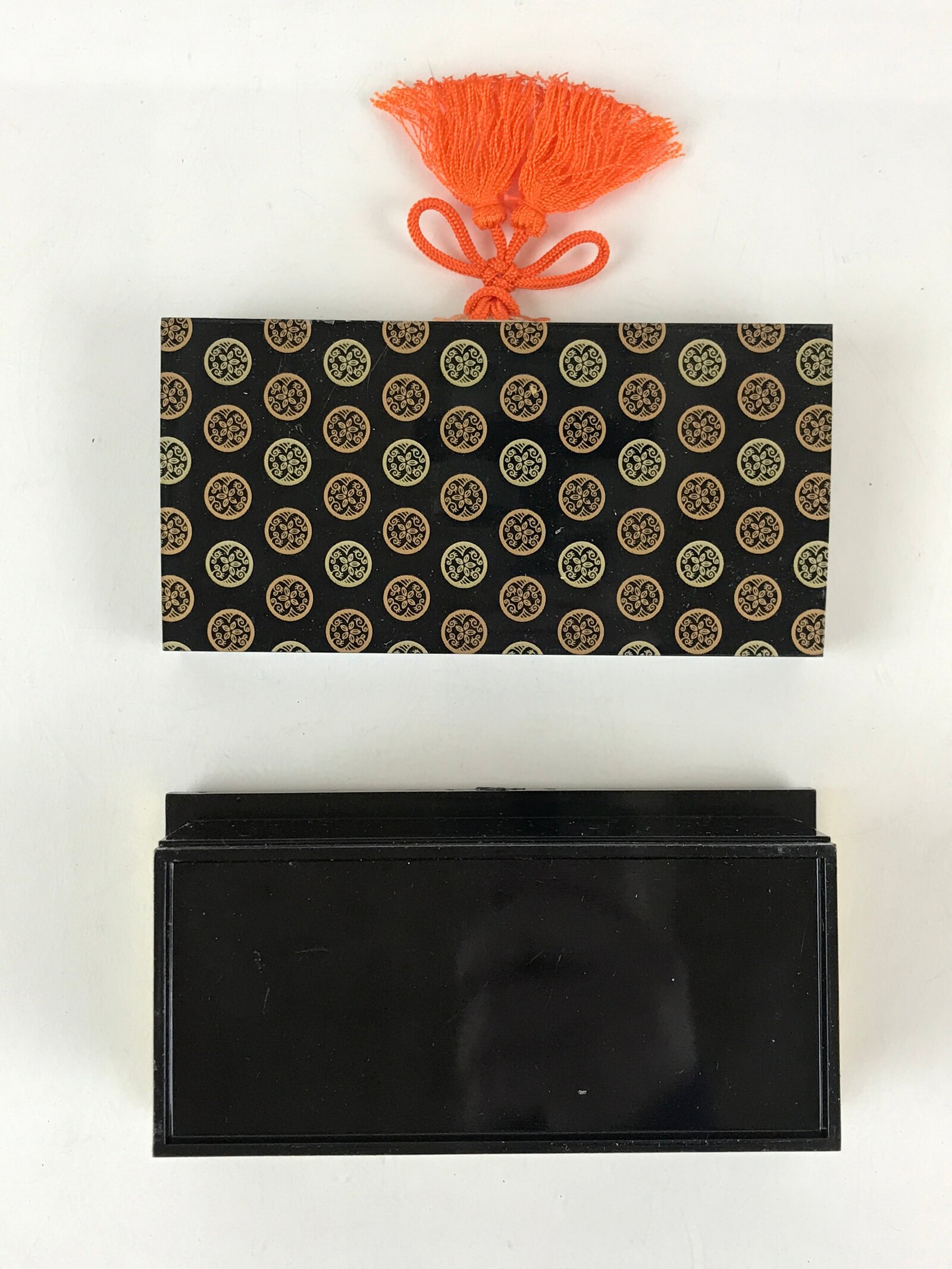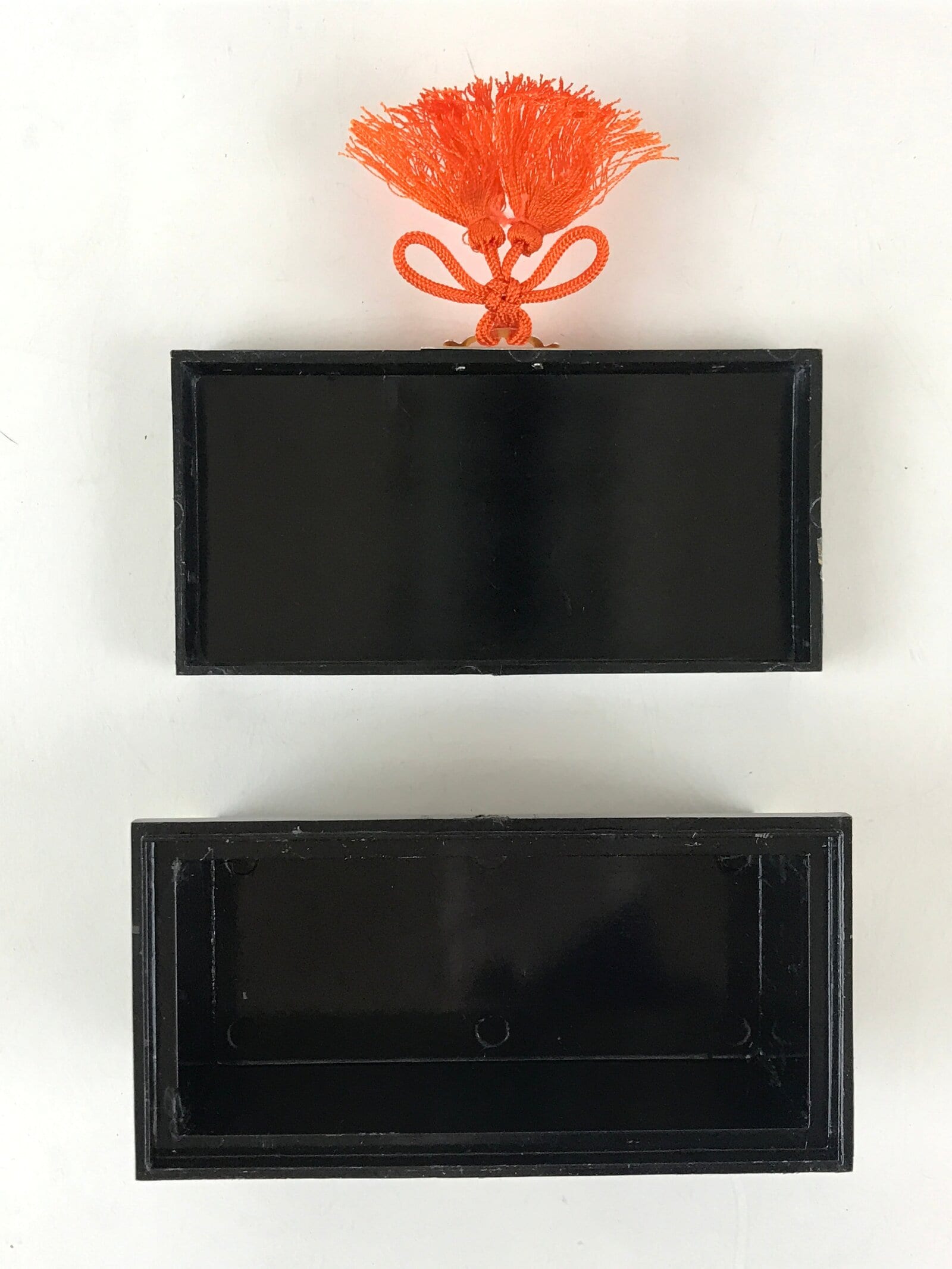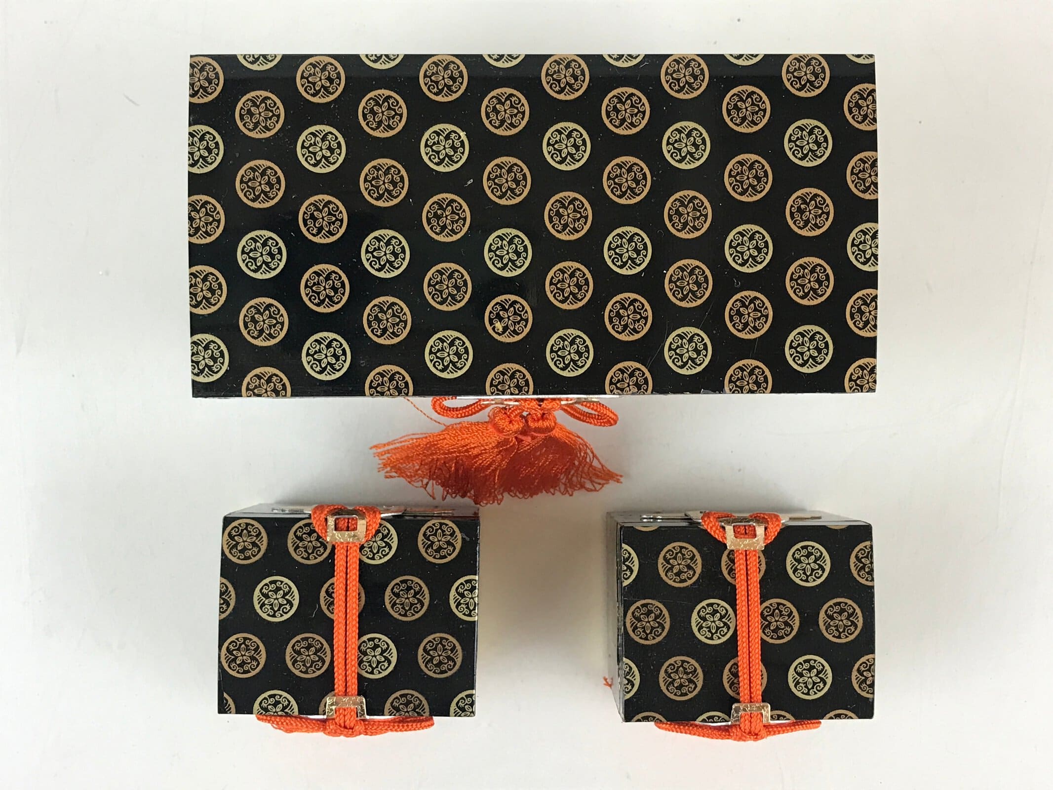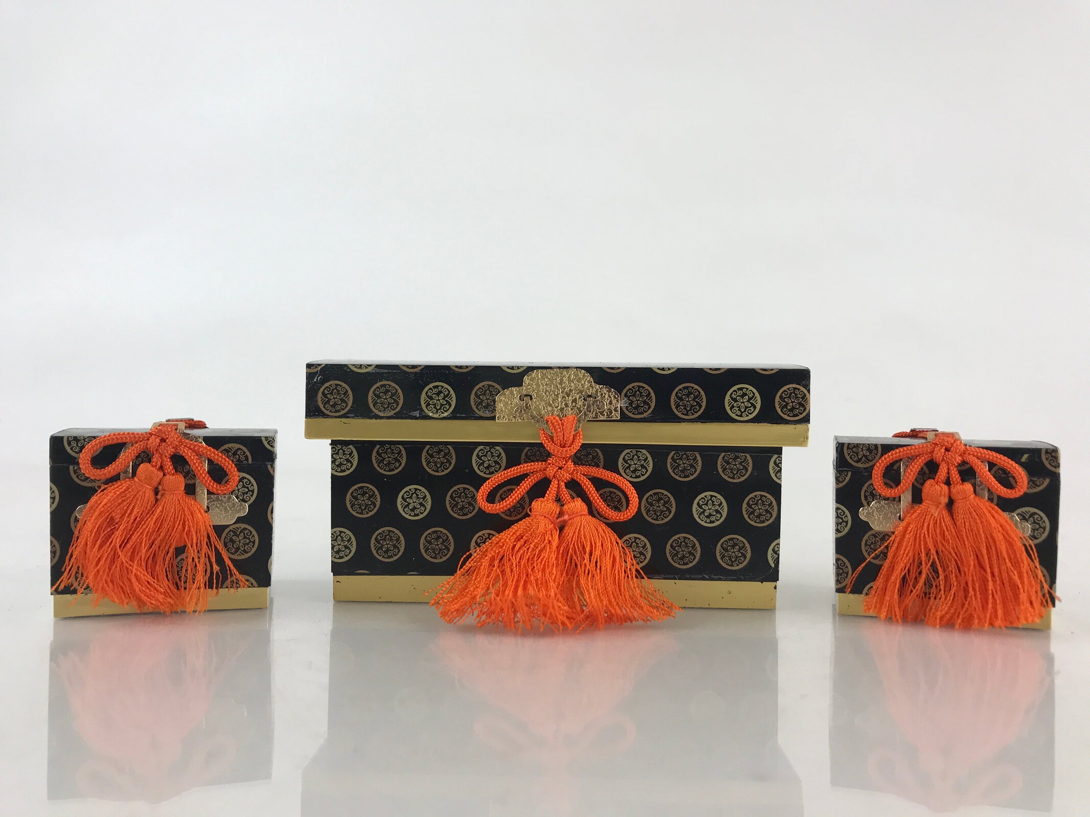 This is a vintage Japanese traditional festival Hinamatsuri’s Hina doll decoration. It is a 3pc set of long chests for kimono storage boxes (Nagamochi). Hinamatsuri (Doll’s or Girls’ Day) is a religious (Shinto) holiday in Japan, celebrated on 3 March yearly. Platforms covered with a red carpet–the material is used to display a set of ornamental dolls (Hina-ningyō) representing the Emperor, Empress, attendants, and musicians in traditional court dress of the Heian period.