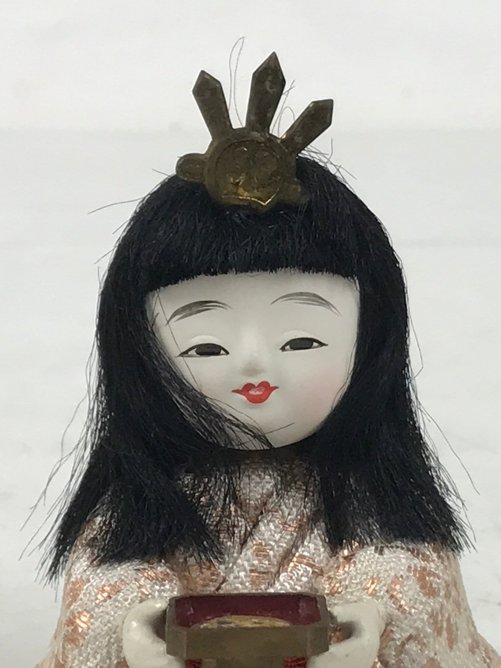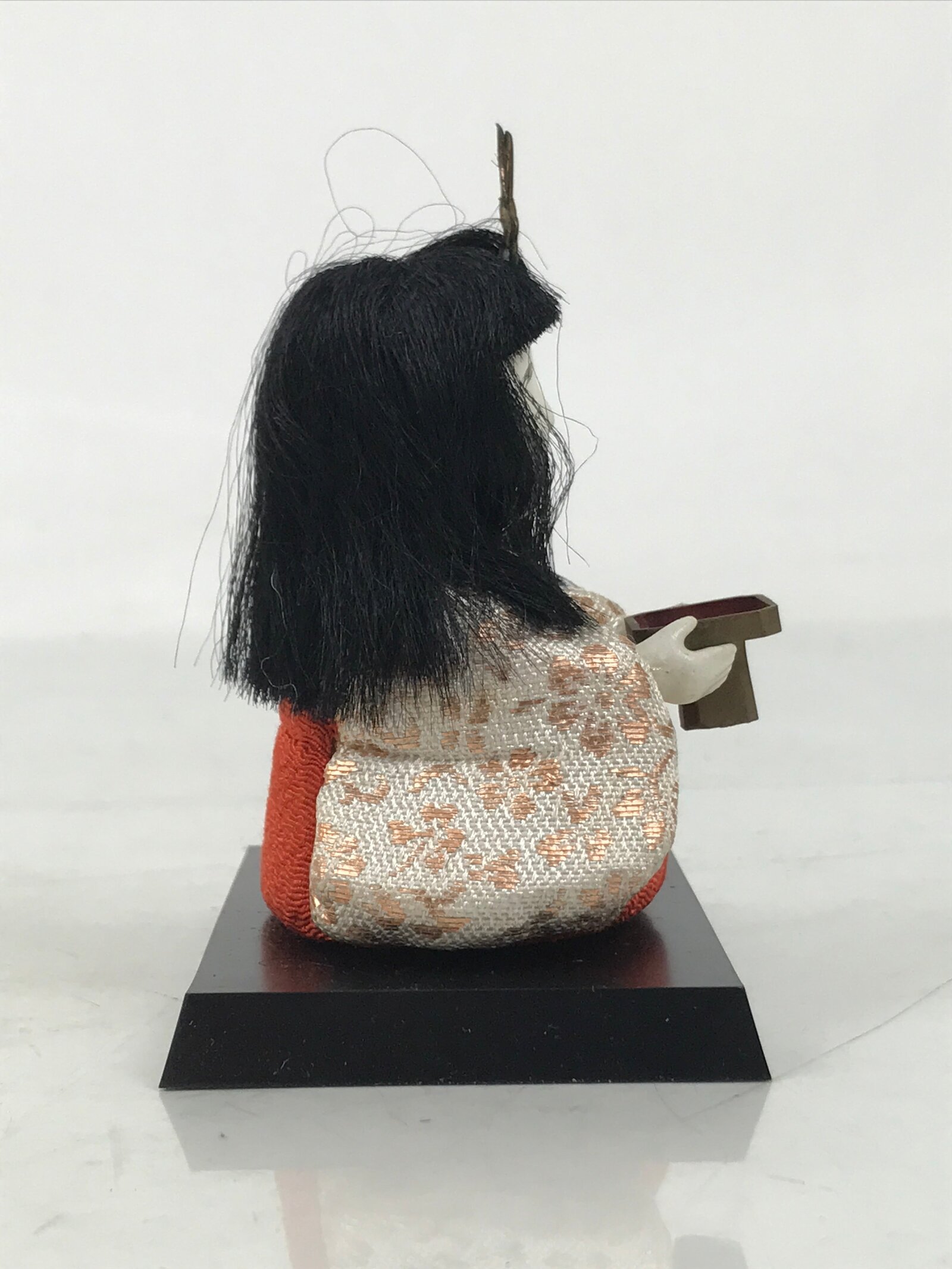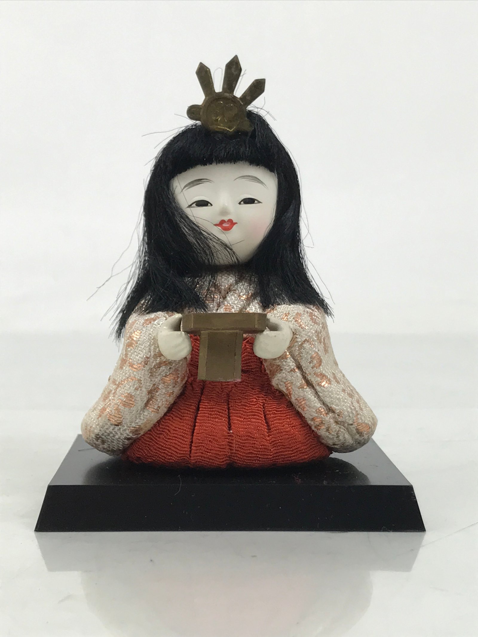 This adorable vintage court lady ohinasama doll dressed in a red-orange, gold, and cream kimono is the perfect addition to any existing hina set or adds gorgeous Eastern flair to any home decor. She holds a sanpo accessory, a small wooden offering stand often associated with Shinto, and wears a metal headpiece. This doll comes with a simple black resin stand. The doll is made in the kimekomi style, which is crafted by adhering and pressing silk fabric onto a carved wooden, resin, or clay base.