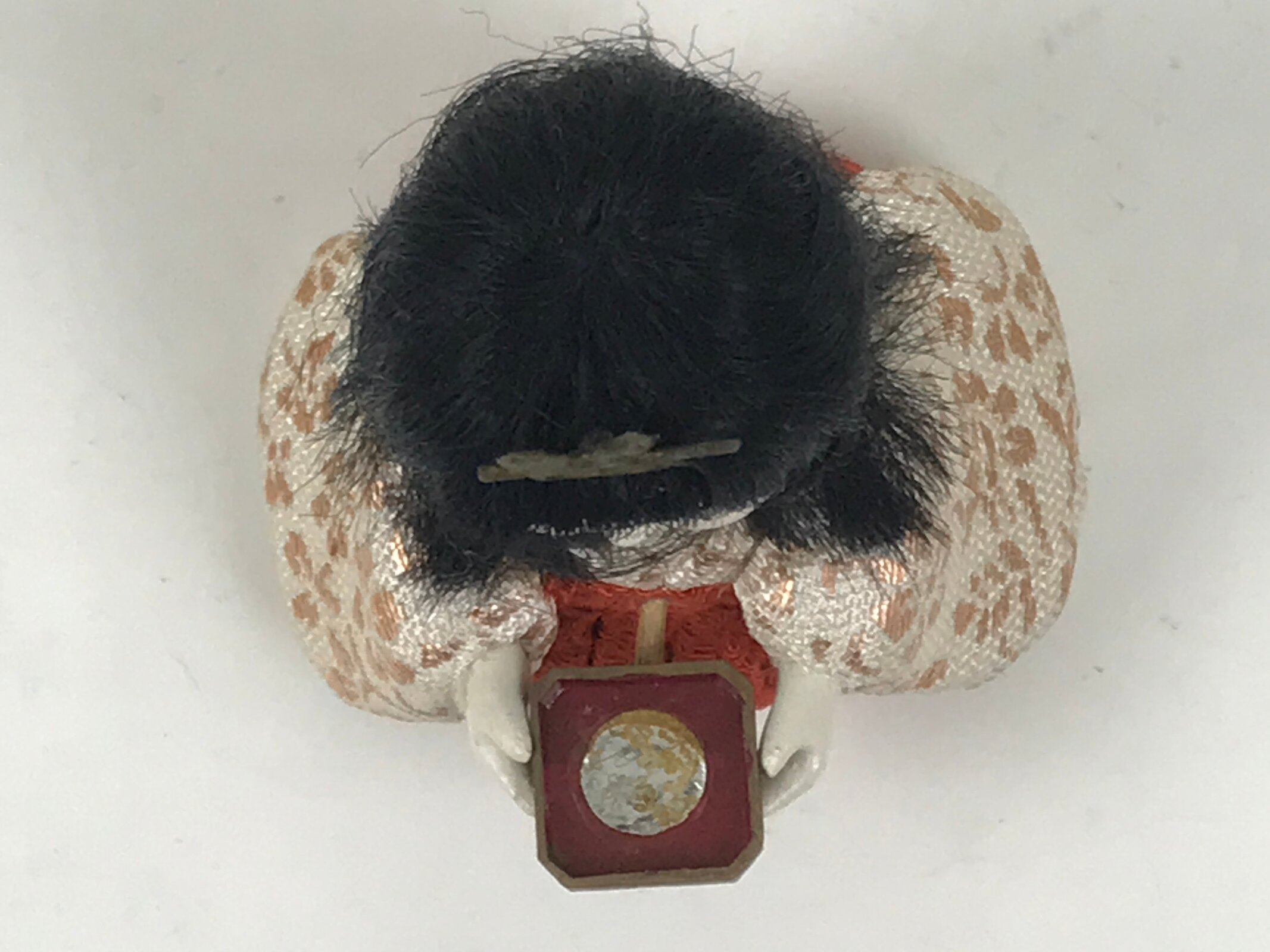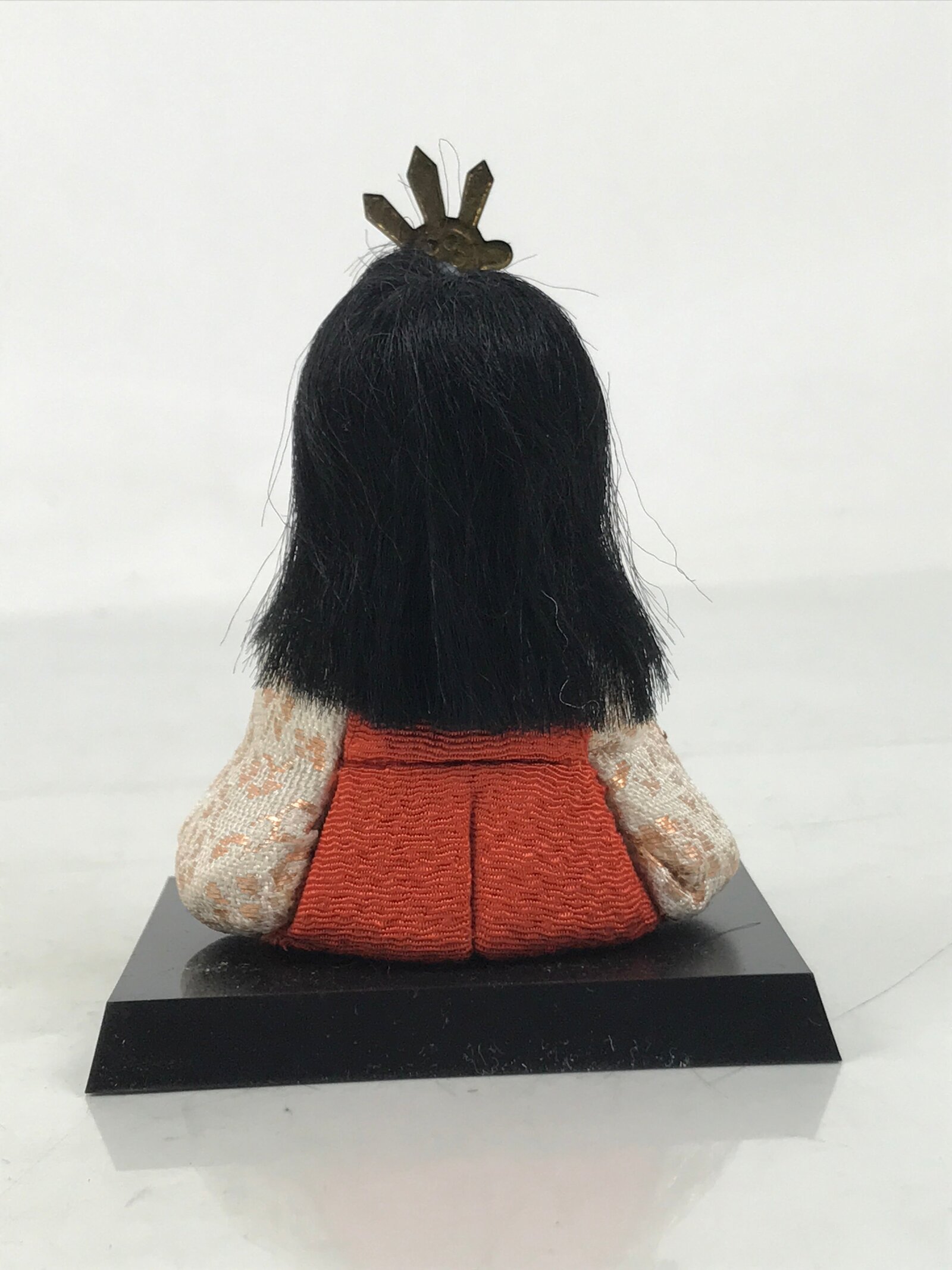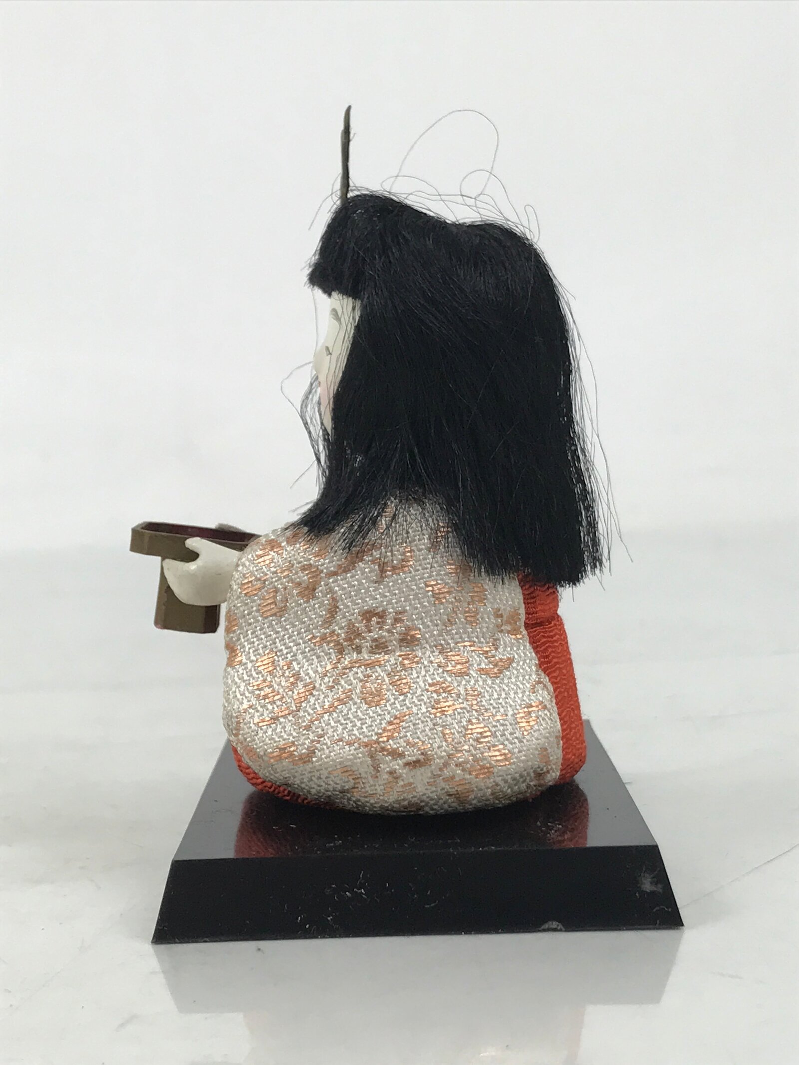 This adorable vintage court lady ohinasama doll dressed in a red-orange, gold, and cream kimono is the perfect addition to any existing hina set or adds gorgeous Eastern flair to any home decor. She holds a sanpo accessory, a small wooden offering stand often associated with Shinto, and wears a metal headpiece. This doll comes with a simple black resin stand. The doll is made in the kimekomi style, which is crafted by adhering and pressing silk fabric onto a carved wooden, resin, or clay base.