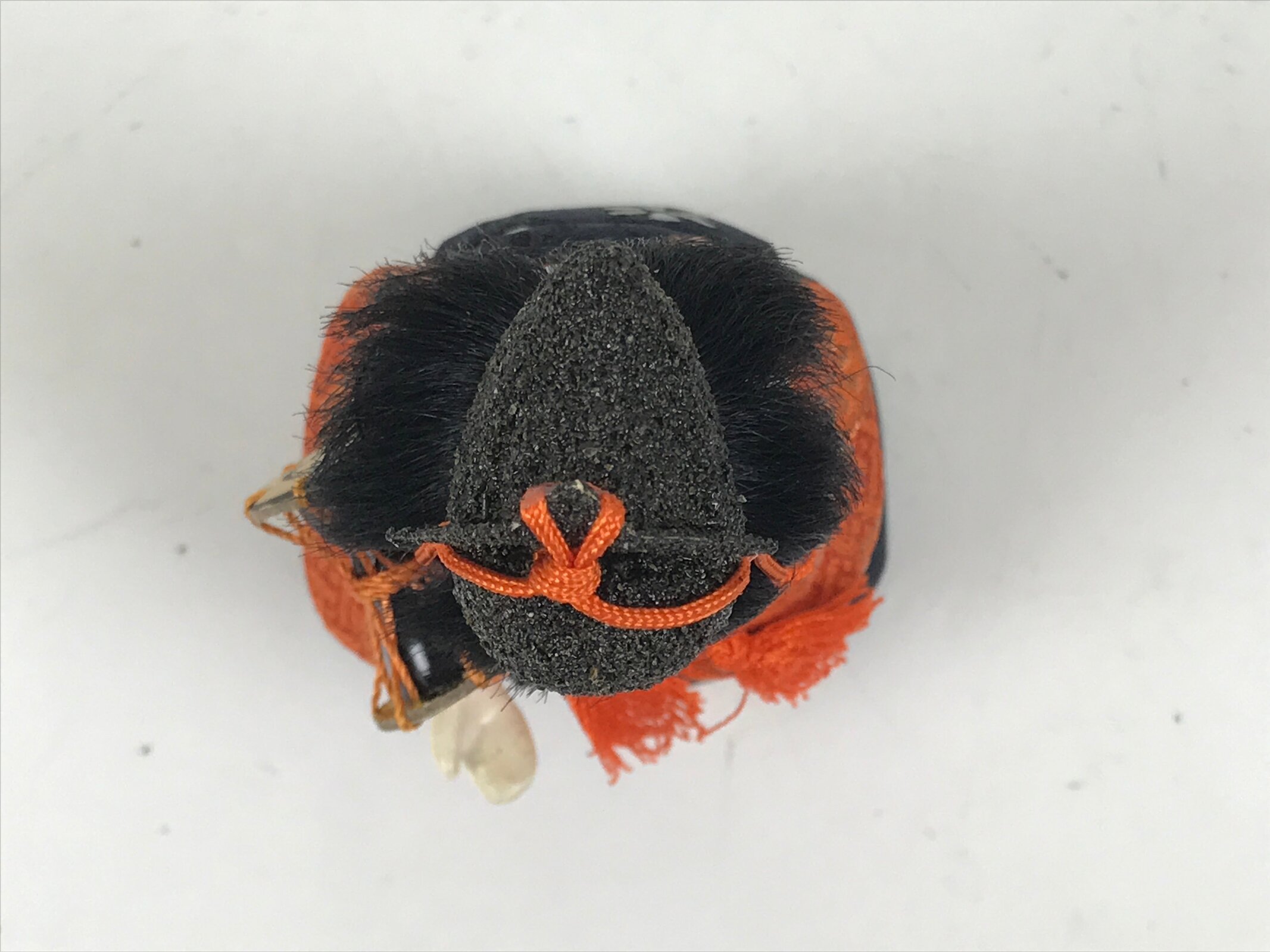 This Japanese vintage court musician hina ningyo doll dressed in an orange, navy blue, and gold kimono is the perfect addition to any existing hina set or adds gorgeous Eastern flair to any home decor. This doll is one of five court musician dolls called goninbayashi. They hold a kotsuzumi, a small hand drum worn on the shoulder. This doll wears a black hat tied with an orange string and comes with a simple black resin stand. The doll is made in the kimekomi style, which is crafted by adhering and pressing silk fabric onto a carved wooden, resin, or clay base.