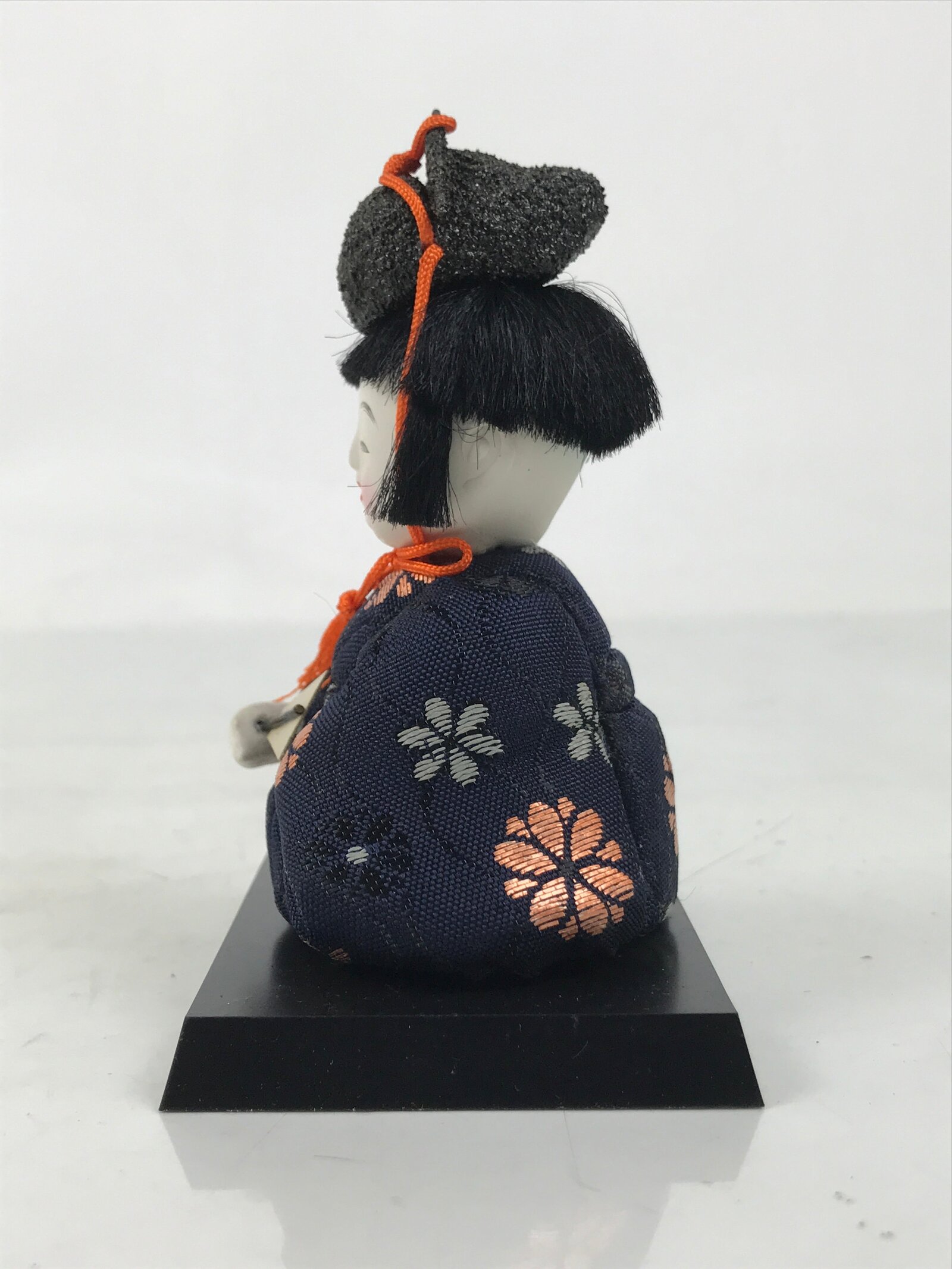 This Japanese vintage court musician hina ningyo doll dressed in an orange, navy blue, and gold kimono is the perfect addition to any existing hina set or adds gorgeous Eastern flair to any home decor. This doll is one of five court musician dolls called goninbayashi. They hold an ougi, a sensu, or a folding fan. This character can be interpreted as a conductor and potentially a singer for the court. This doll wears a black hat tied with an orange string and comes with a simple black resin stand. The doll is made in the kimekomi style, which is crafted by adhering and pressing silk fabric onto a carved wooden, resin, or clay base.