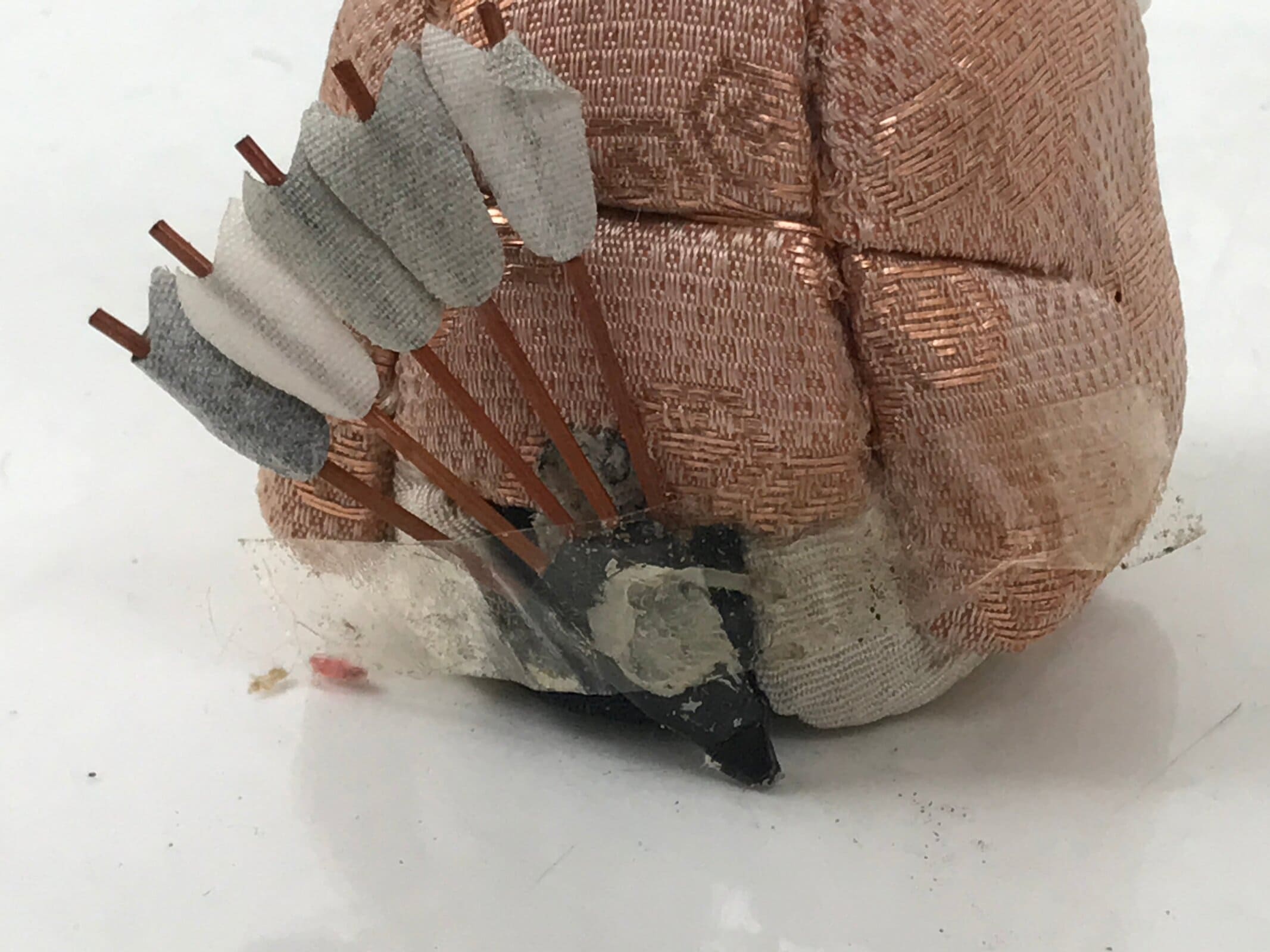 This Japanese vintage guard ohinasama doll dressed in a peachy pink, gold, and white kimono is the perfect addition to any existing hina set or adds gorgeous Eastern flair to any home decor. He typically holds a bundle of arrows or a bow, but this piece is missing. This doll wears a black hat tied with a purple string and comes with a simple black resin stand. The doll is made in the kimekomi style, which is crafted by adhering and pressing silk fabric onto a carved wooden, resin, or clay base.