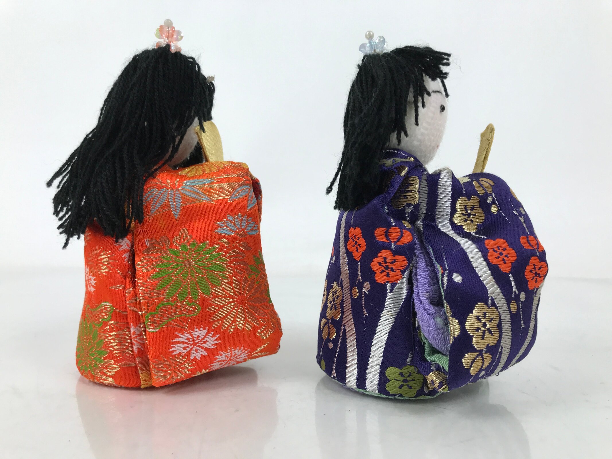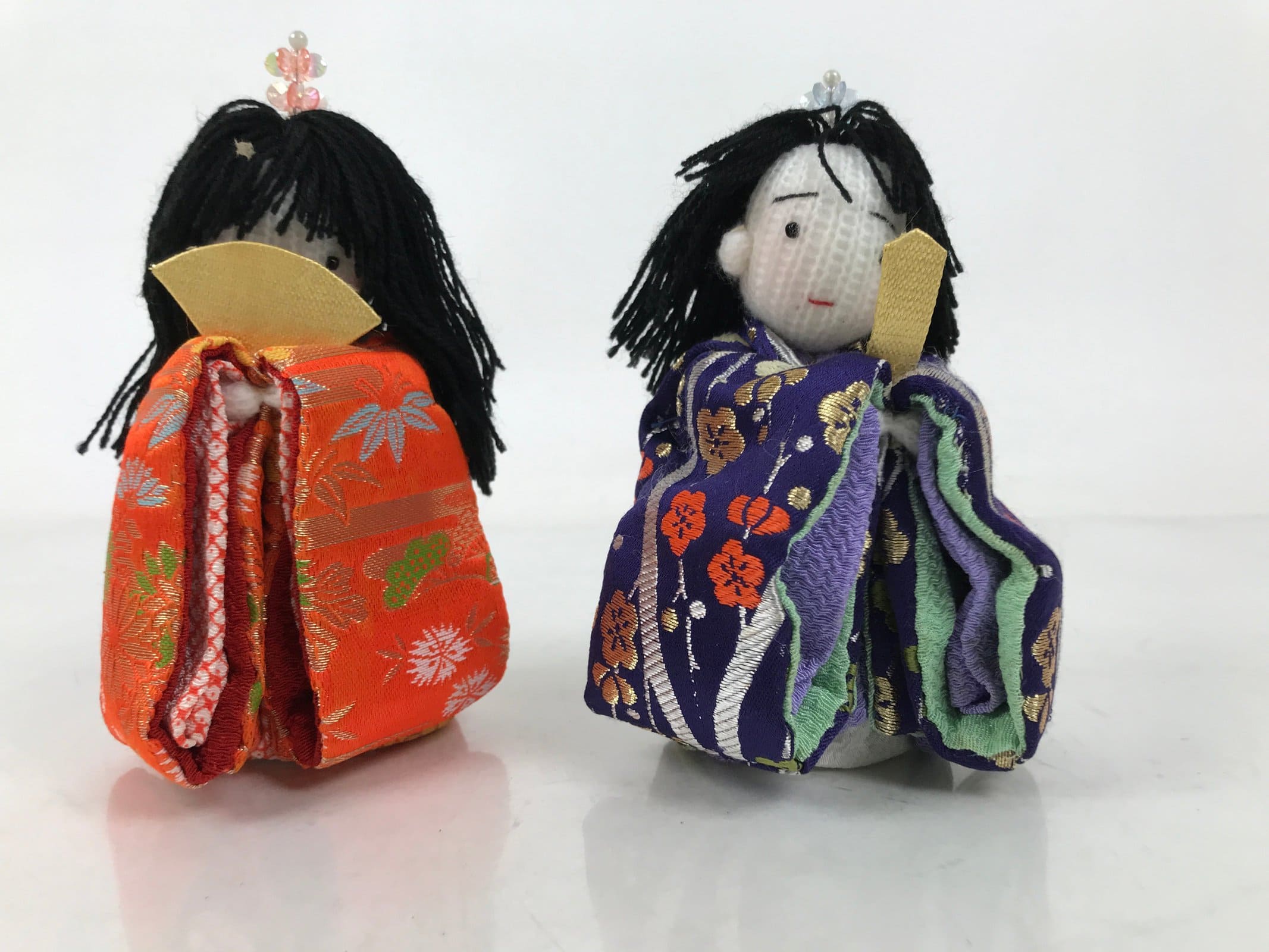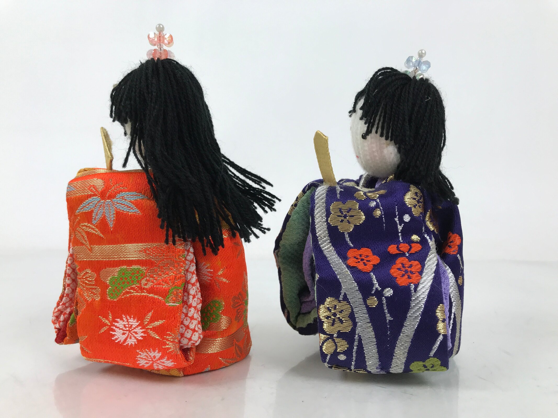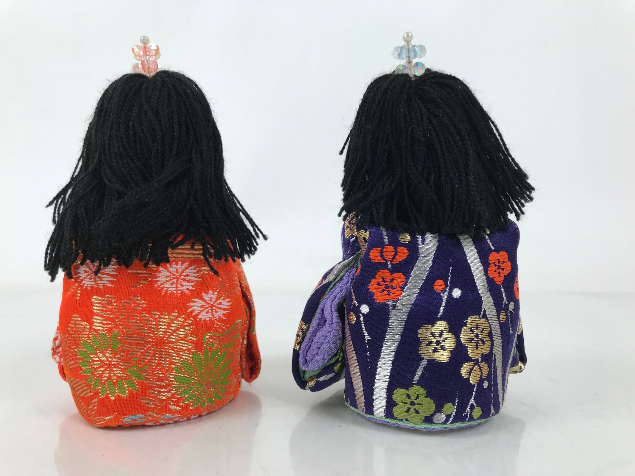 These handsome vintage princess and prince ohinasama dolls, dressed in a gorgeous kimono with a Japanese lucky charm plant design, are the perfect addition to any existing hina set or to add gorgeous Eastern flair to any home decor. They have a knit head, yarn hair, and a paper-made body filled with beads.