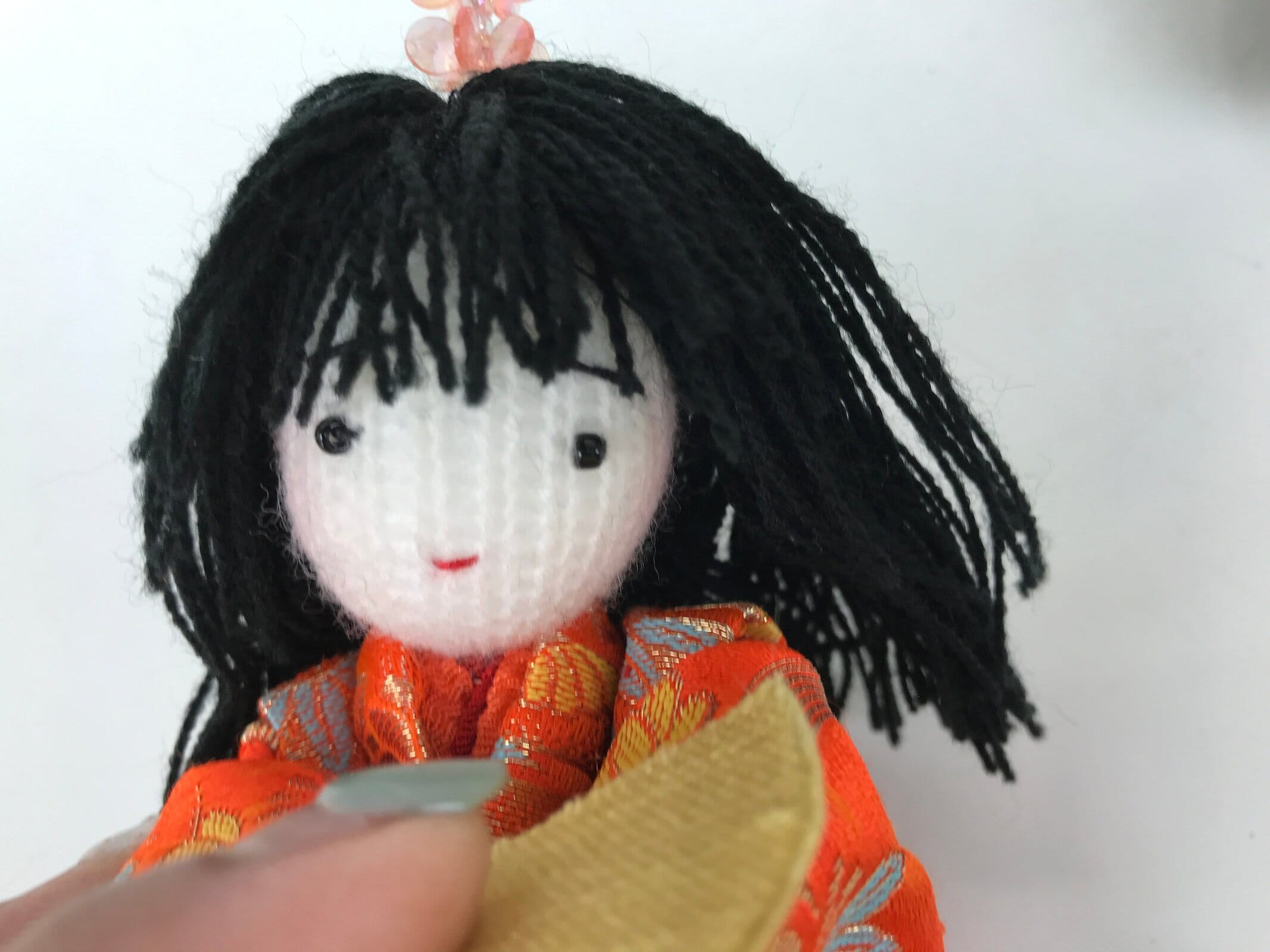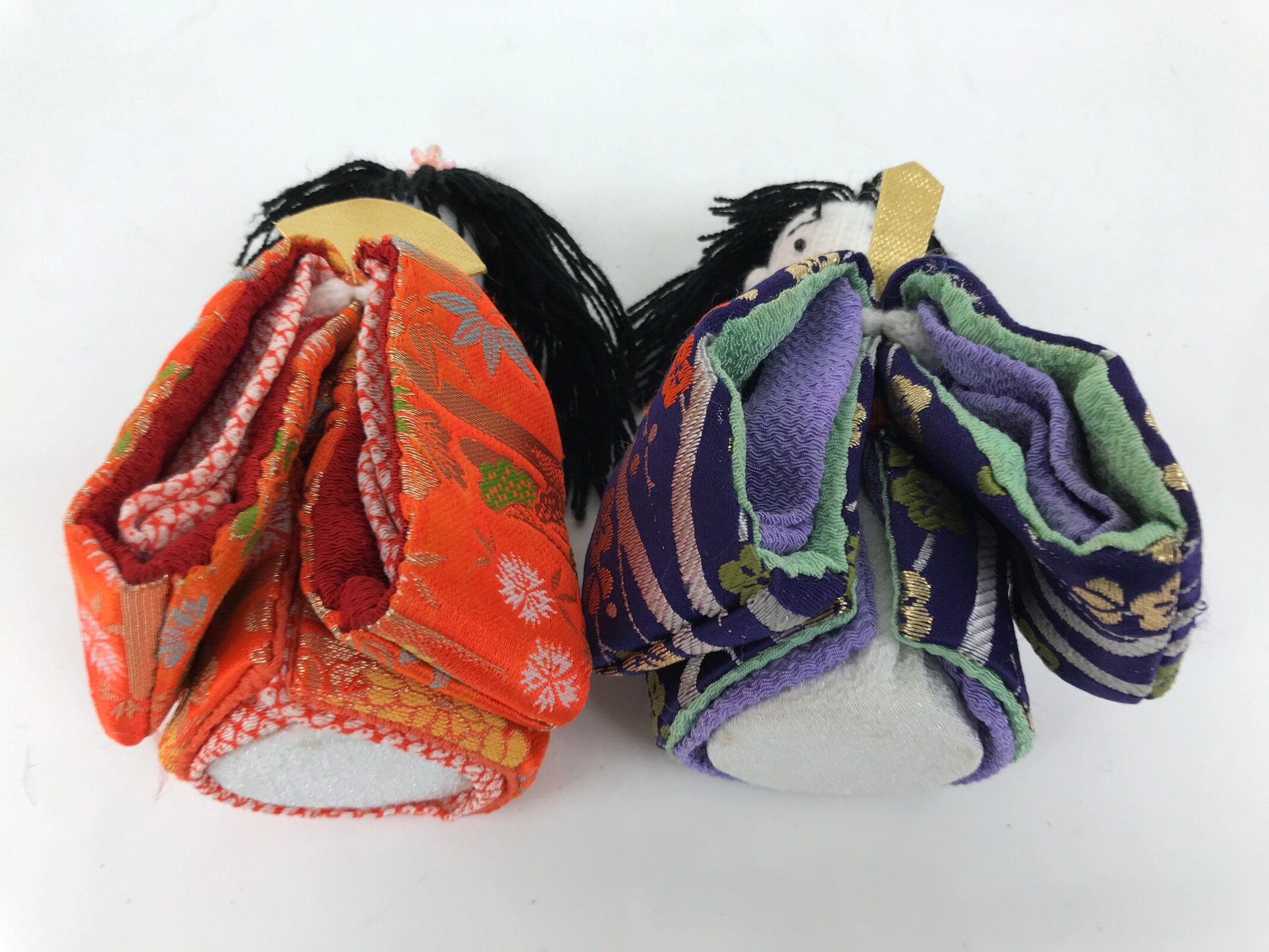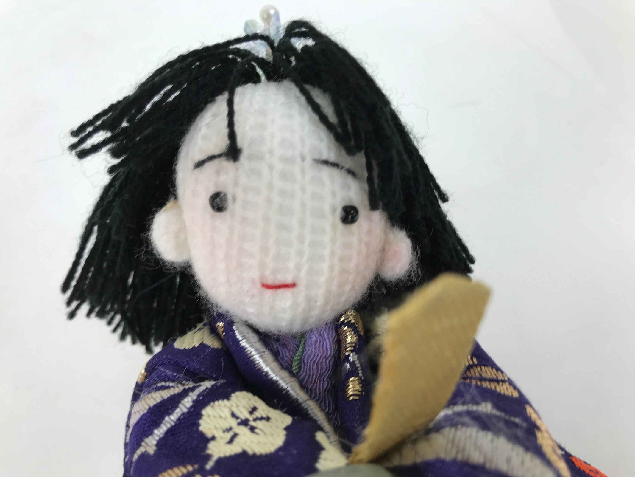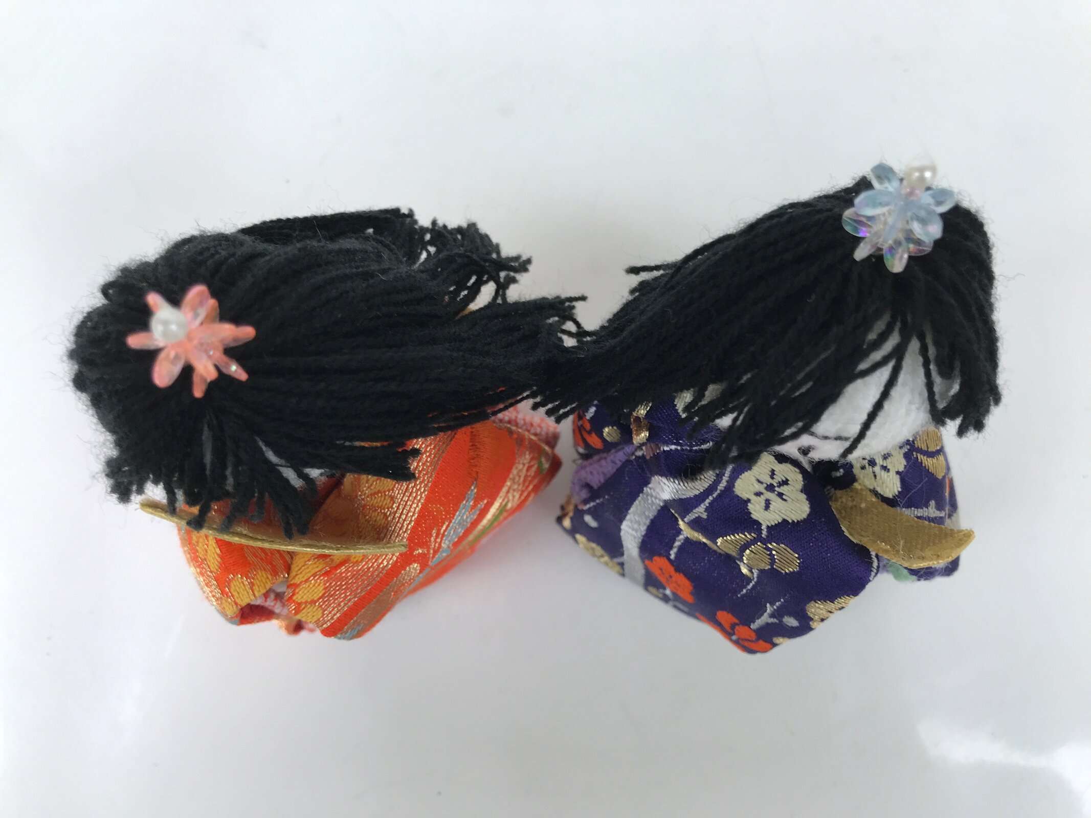 These handsome vintage princess and prince ohinasama dolls, dressed in a gorgeous kimono with a Japanese lucky charm plant design, are the perfect addition to any existing hina set or to add gorgeous Eastern flair to any home decor. They have a knit head, yarn hair, and a paper-made body filled with beads.