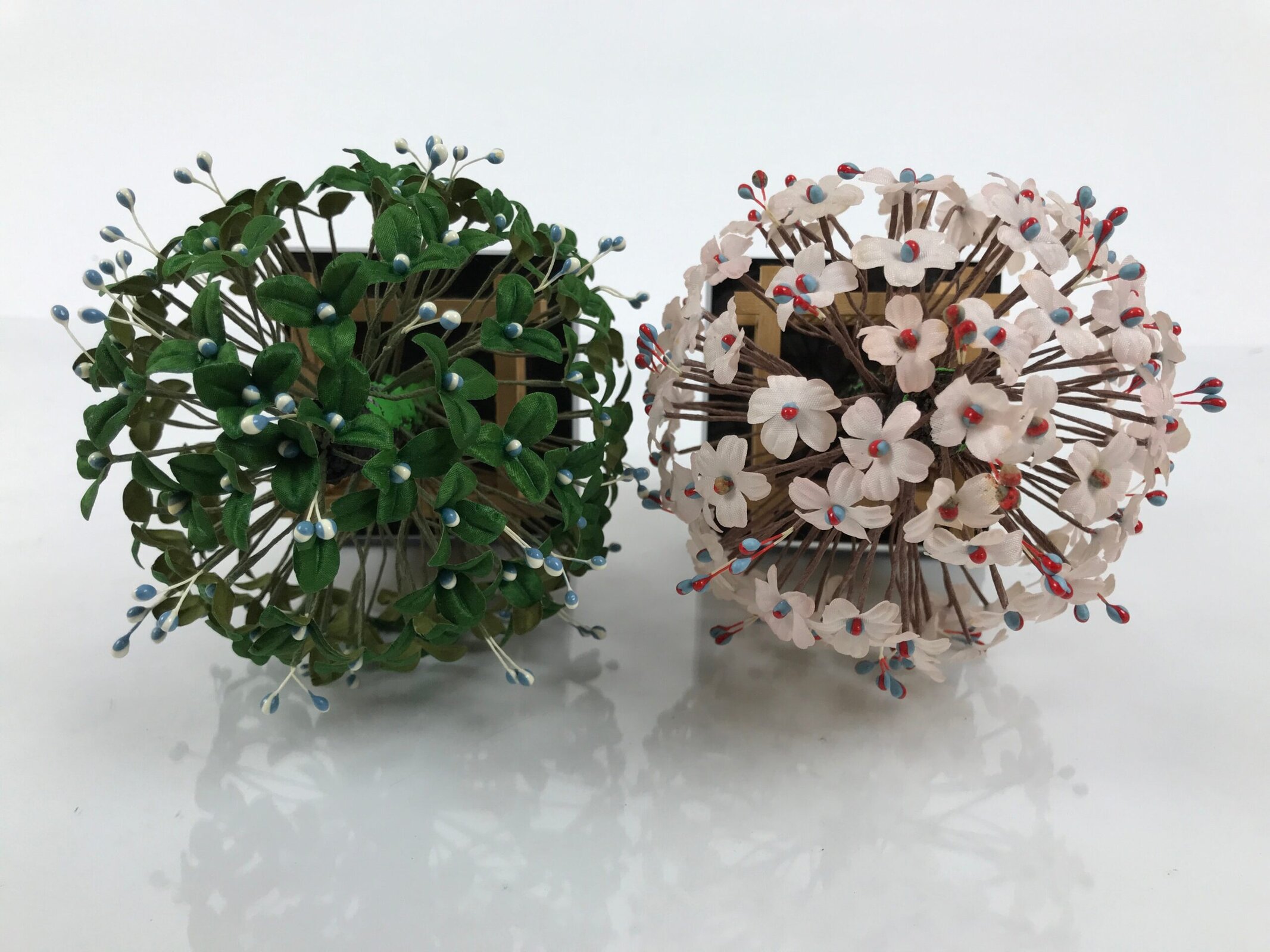 This Japanese vintage ohinasama doll accessory set of two trees is the perfect addition to any existing hina set. These trees are typically placed on the hinadan, the doll shelf, as decoration. The green tree is a tachibana orange tree, and the pink one is a sakura cherry tree with cherry blossoms. They come in a storage box.