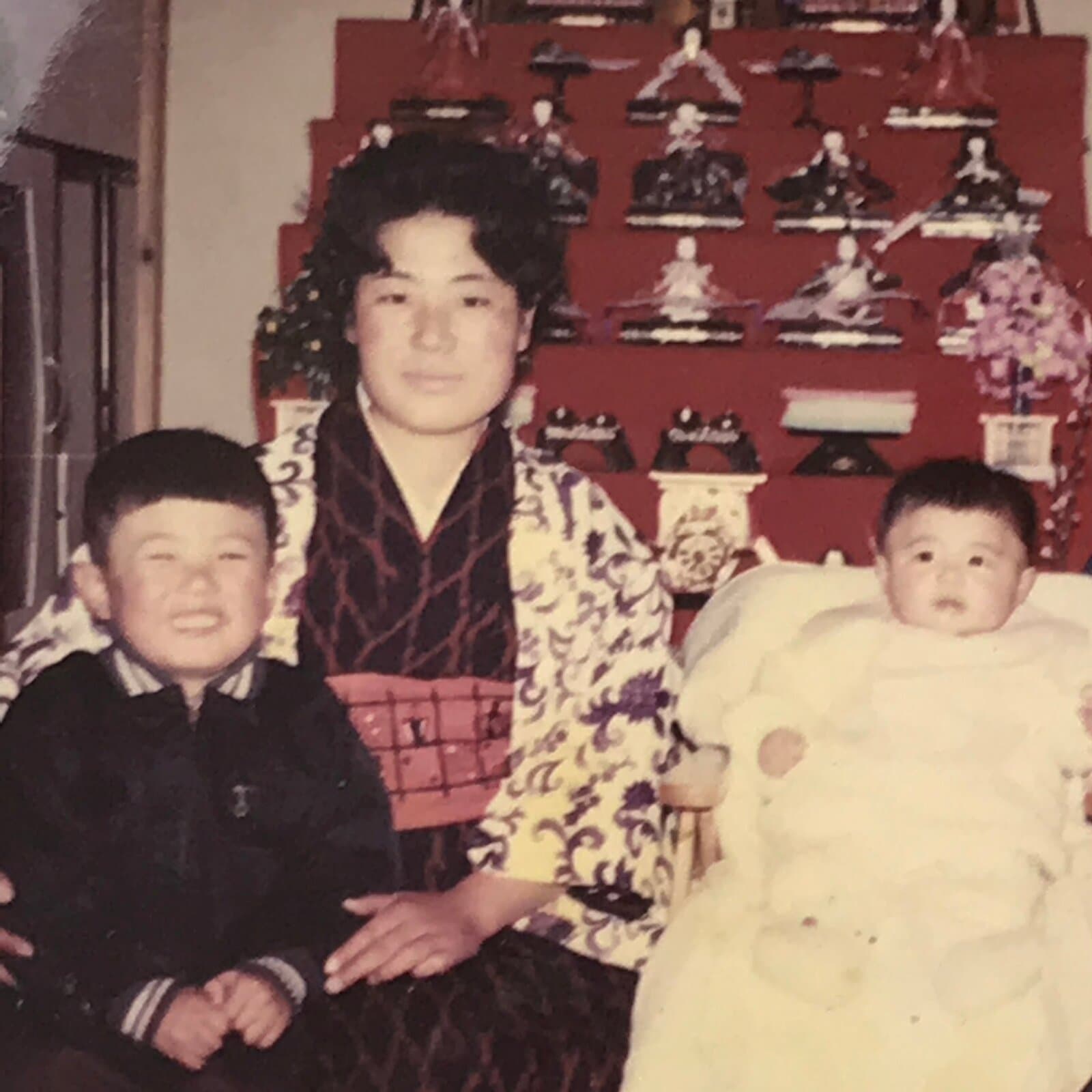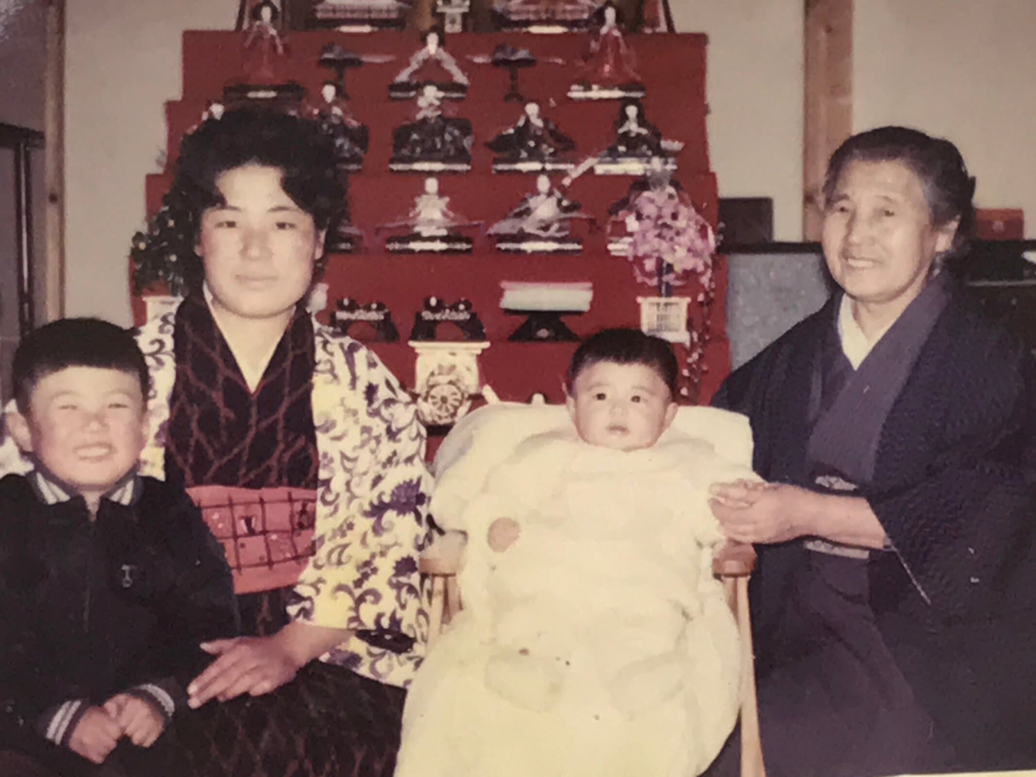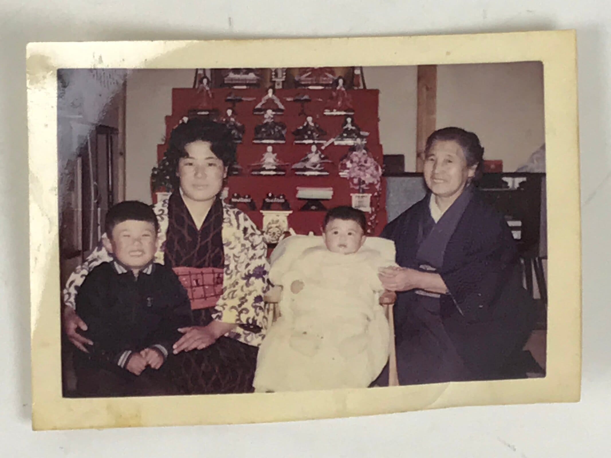 This is an original vintage color photograph of a small boy and a baby girl posed with their mother and grandmother in front of a Hina Matsuri doll display set up for the Girls’ Day holiday (March 3rd annually). The dolls and their accessories represent a royal court that includes a prince and princess at the top, their retainers, and various mochi and fruit offerings. More elaborate sets include the princess’s dowry (sewing box, chests, dresser, etc).