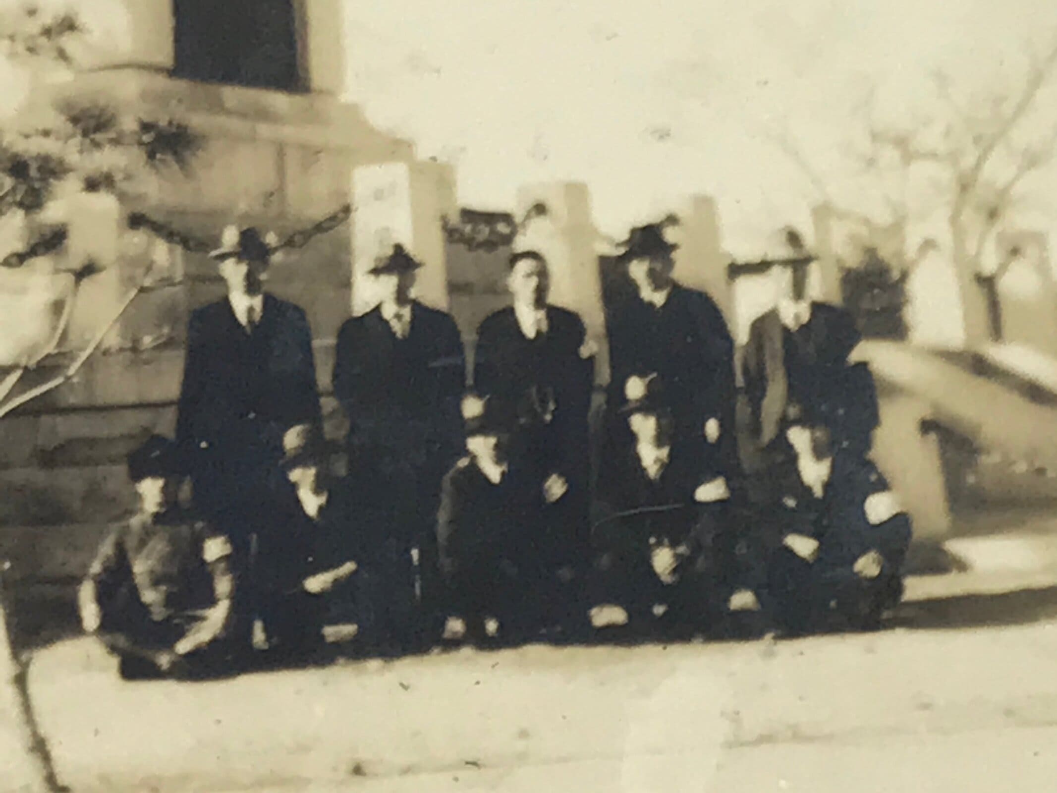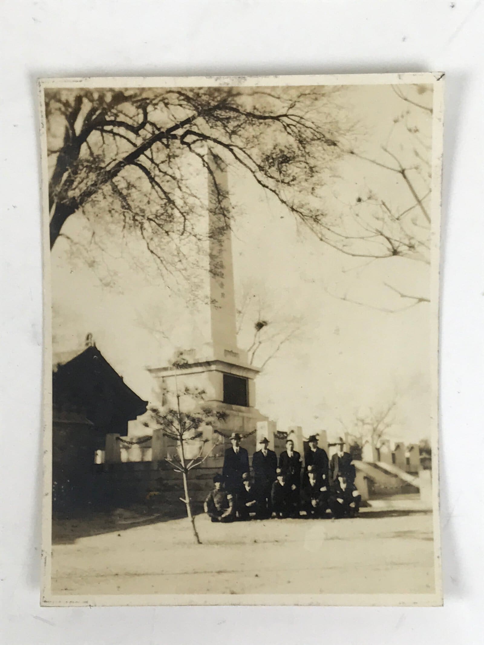 This is a vintage sepia-tone photograph of a Japanese monument in Hotan, China called the 6th Regiment Monument, a memorial for Japanese soldiers. There are a group of men posed in front, most of which wear a suit while one wears a military uniform.