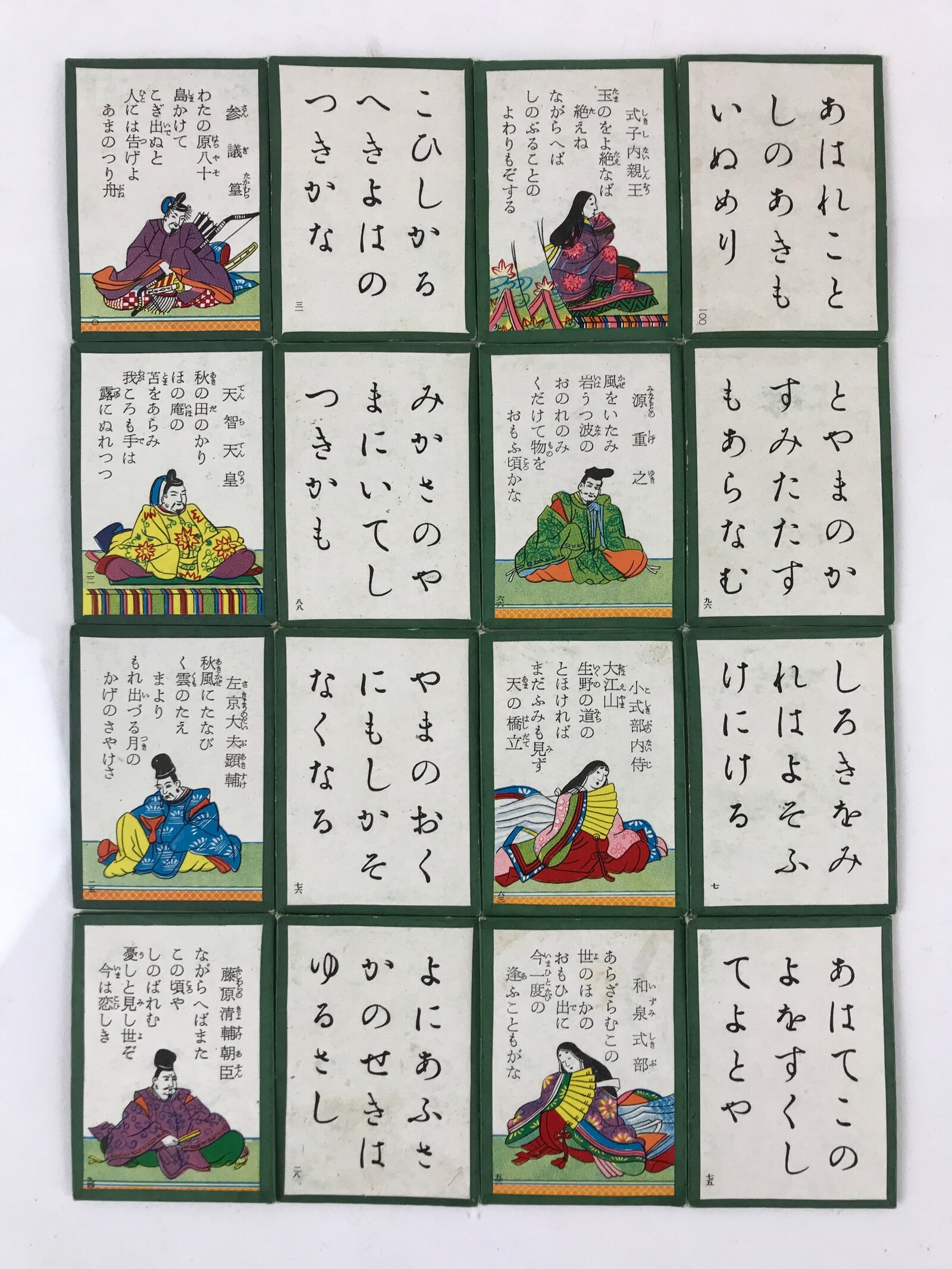 This is a vintage Japanese card game Hyakunin Isshu. Hyakunin Isshu is a classical Japanese anthology of one hundred Japanese waka by one hundred poets. Hyakunin isshu can be translated to “one hundred people, one poem [each]”; it can also refer to the card game of uta-garuta, which uses a deck composed of cards based on the Hyakunin Isshu.