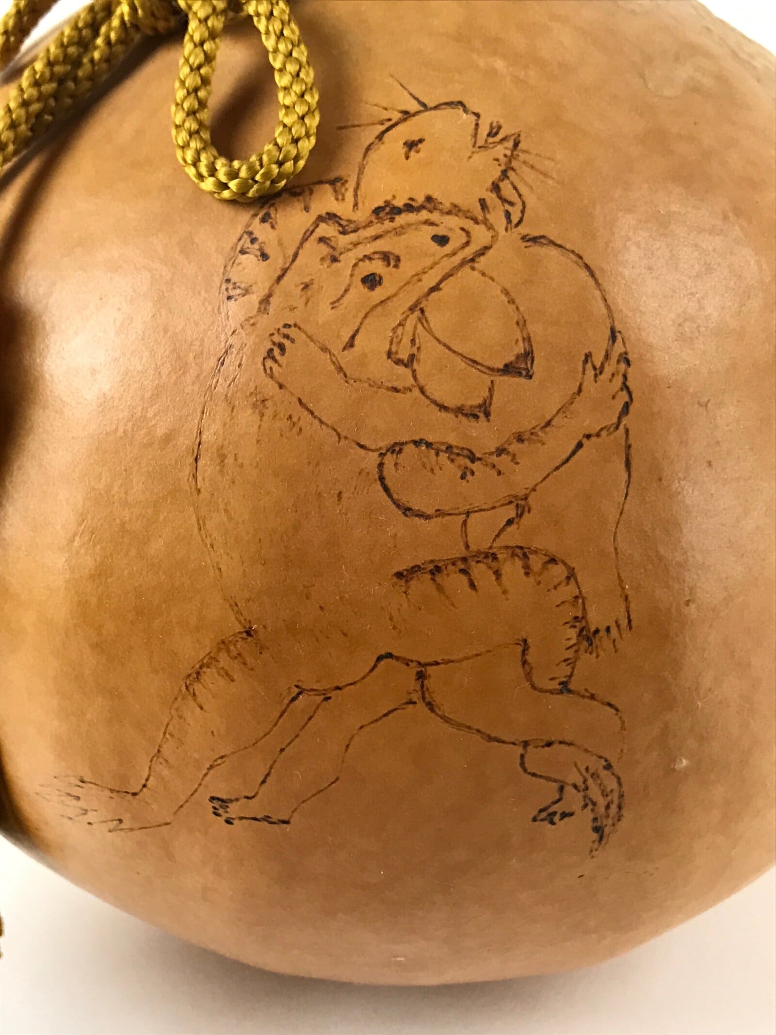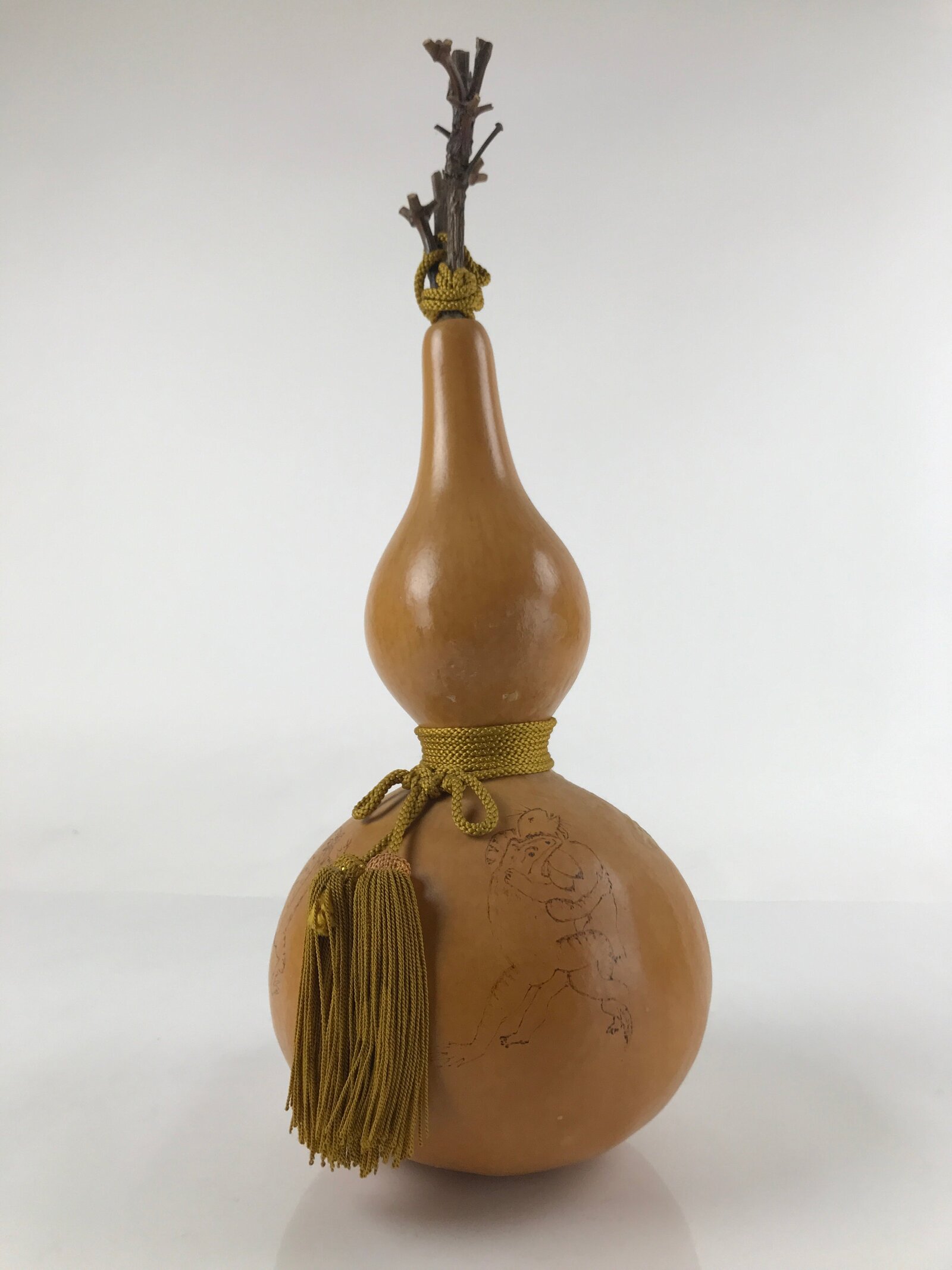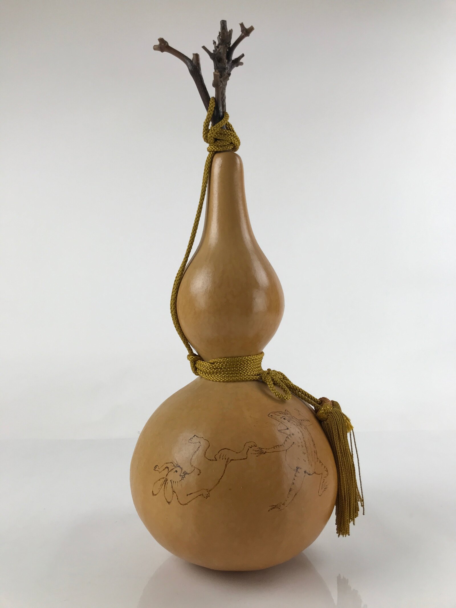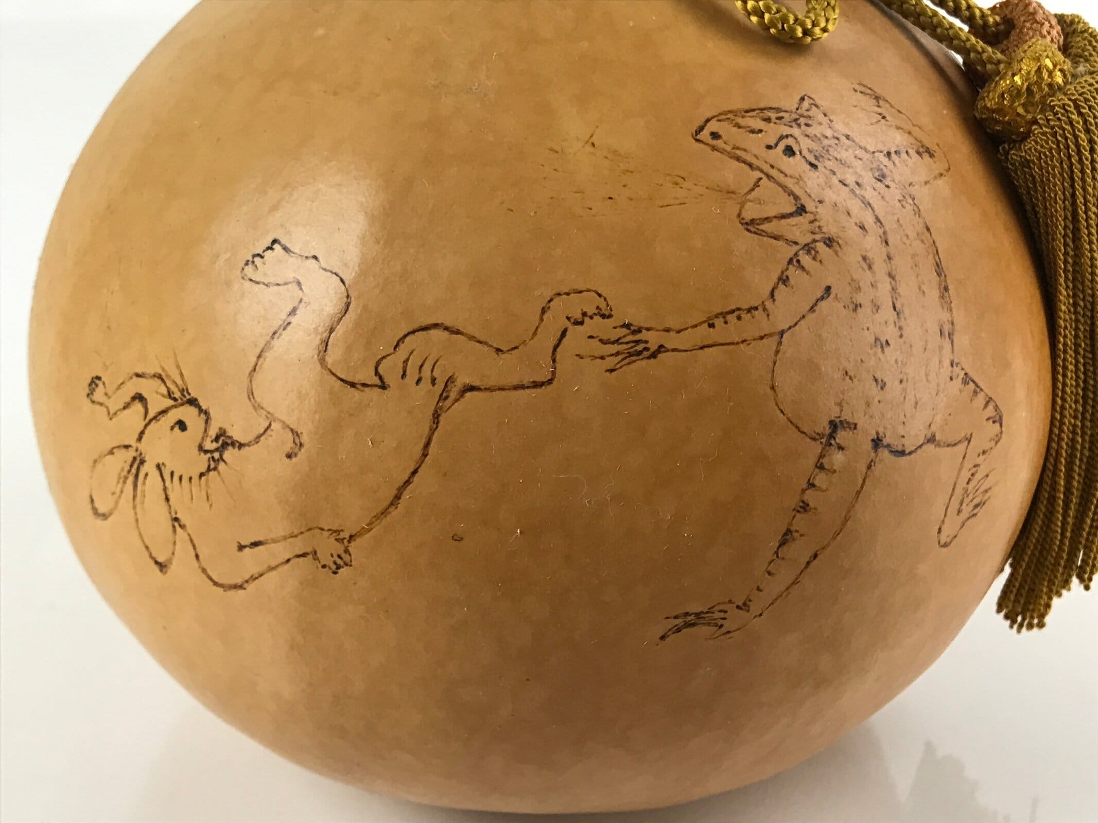 This Japanese naturally dried large hyotan gourd was not only made for storing and carrying sake and seeds but also as a good luck charm for display. It features a classic light brown color and individual curvy shape with an etched scene of a rabbit and frog wrestling. It has a gold silk braided cord with tassels tied around the center. It has a lid in the form of the end of a small tree branch that comes on and off. There are small stones inside to keep the gourd standing for display, however, they can be removed by request for cheaper shipping.