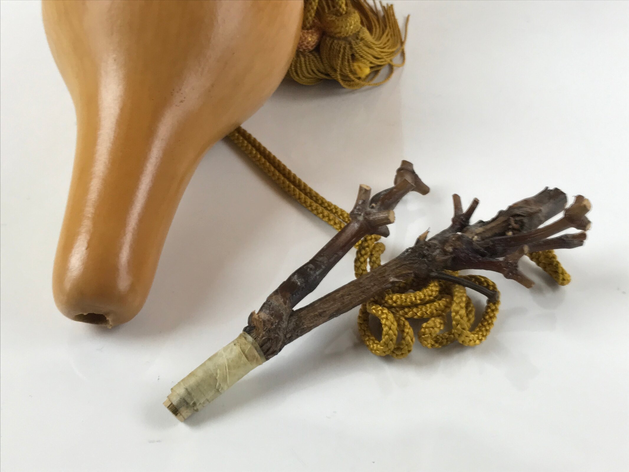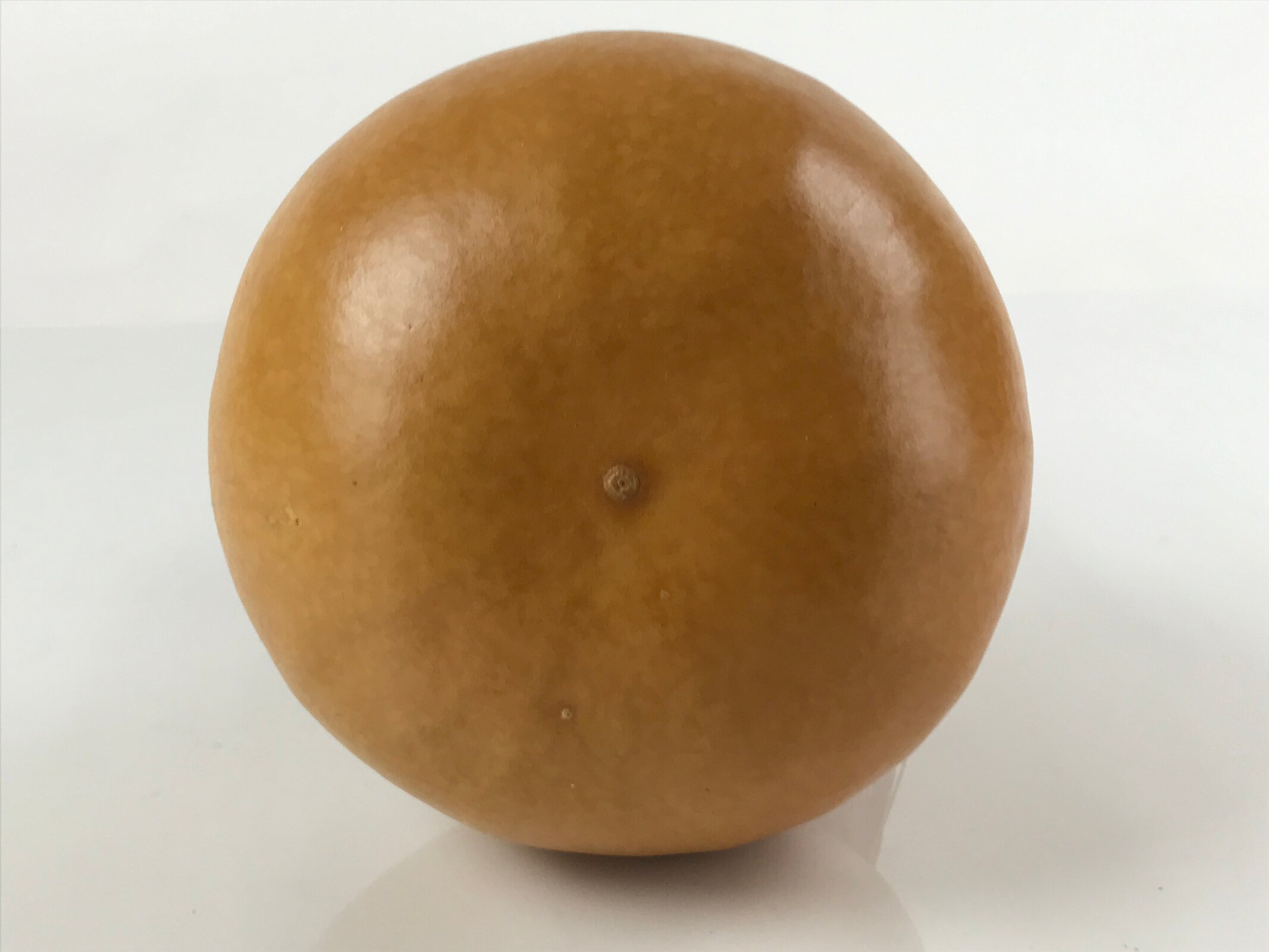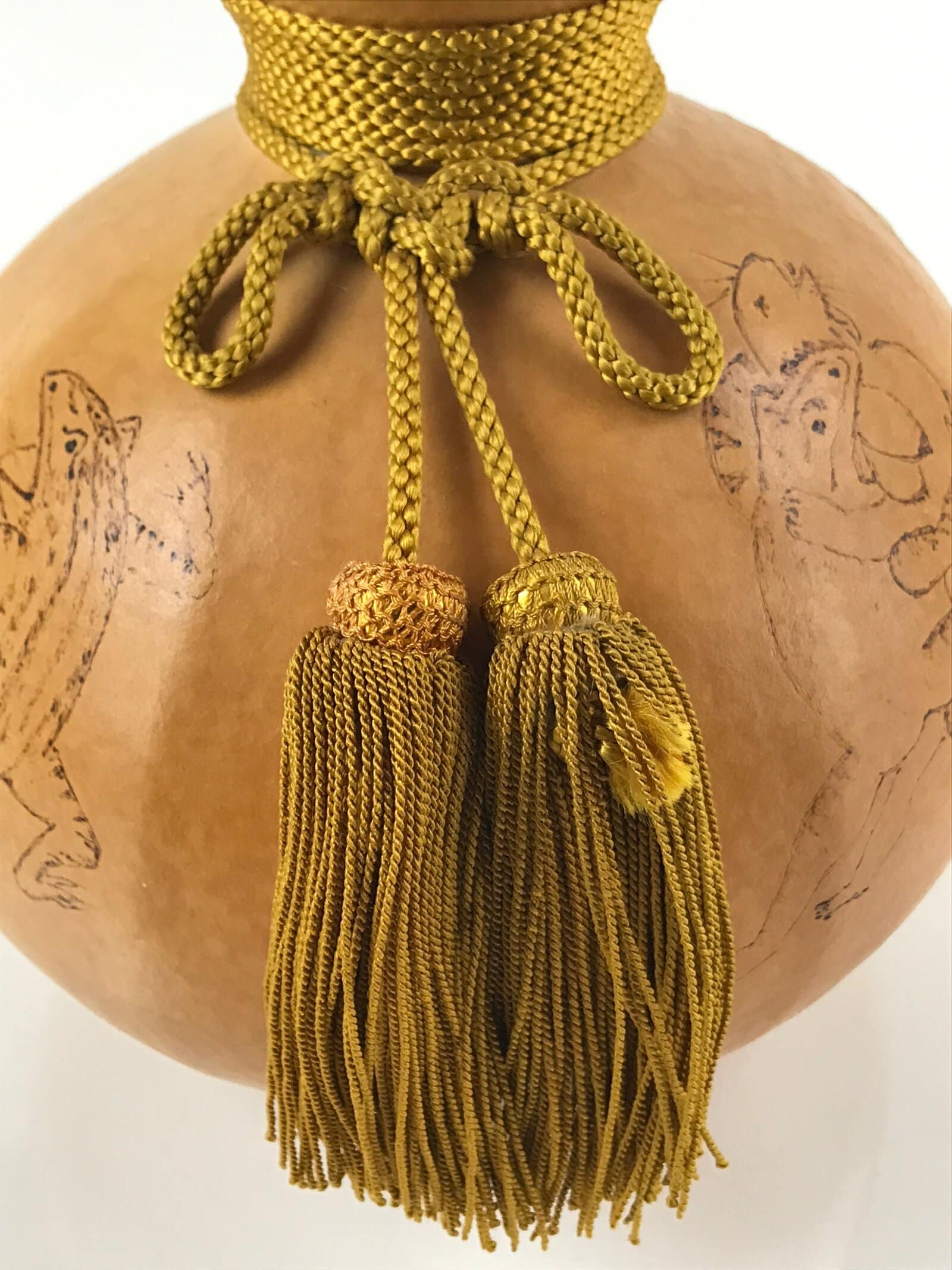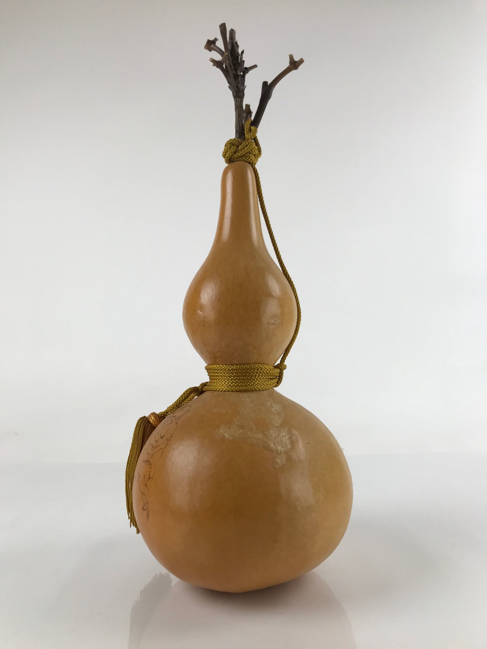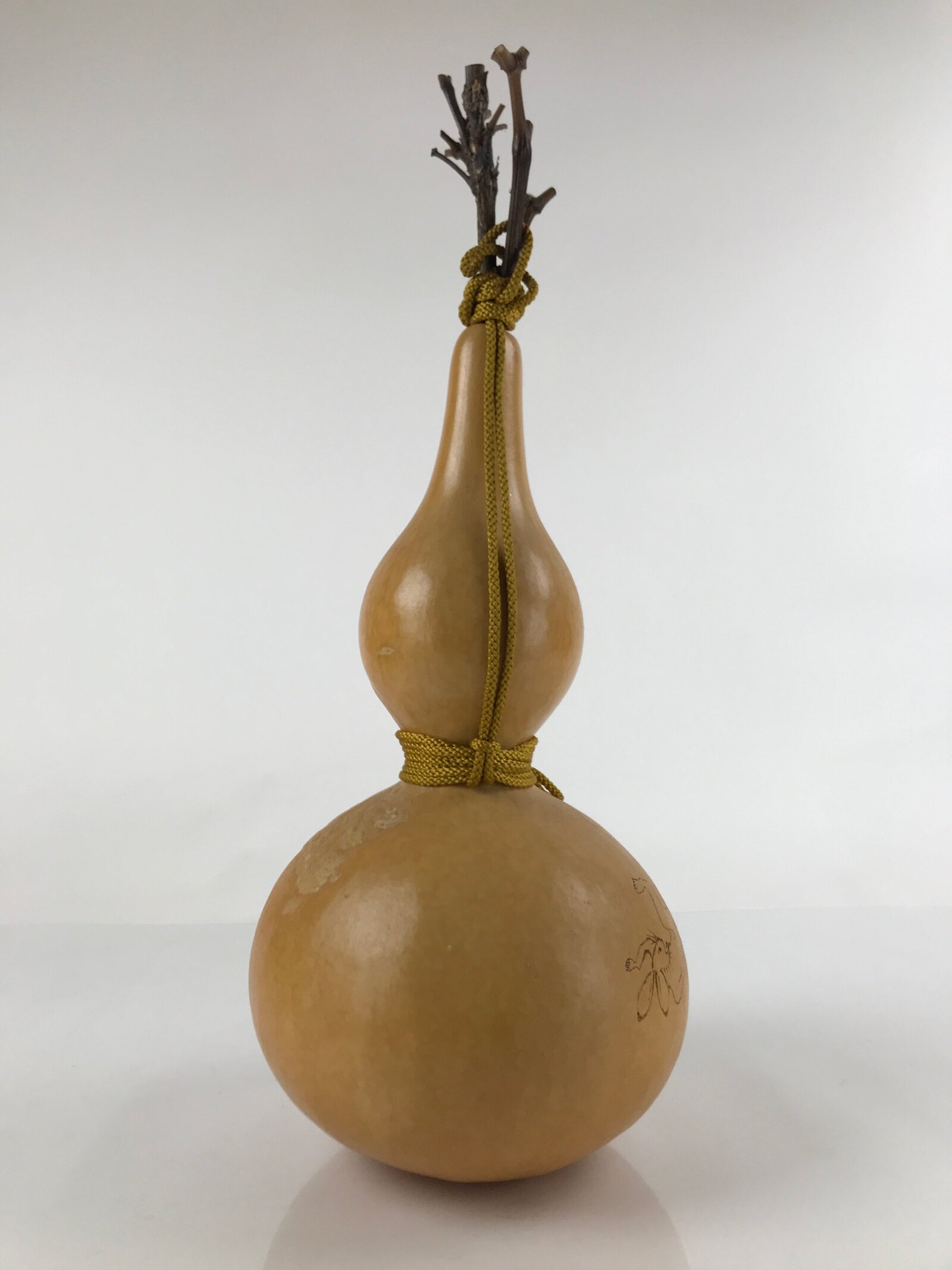 This Japanese naturally dried large hyotan gourd was not only made for storing and carrying sake and seeds but also as a good luck charm for display. It features a classic light brown color and individual curvy shape with an etched scene of a rabbit and frog wrestling. It has a gold silk braided cord with tassels tied around the center. It has a lid in the form of the end of a small tree branch that comes on and off. There are small stones inside to keep the gourd standing for display, however, they can be removed by request for cheaper shipping.
