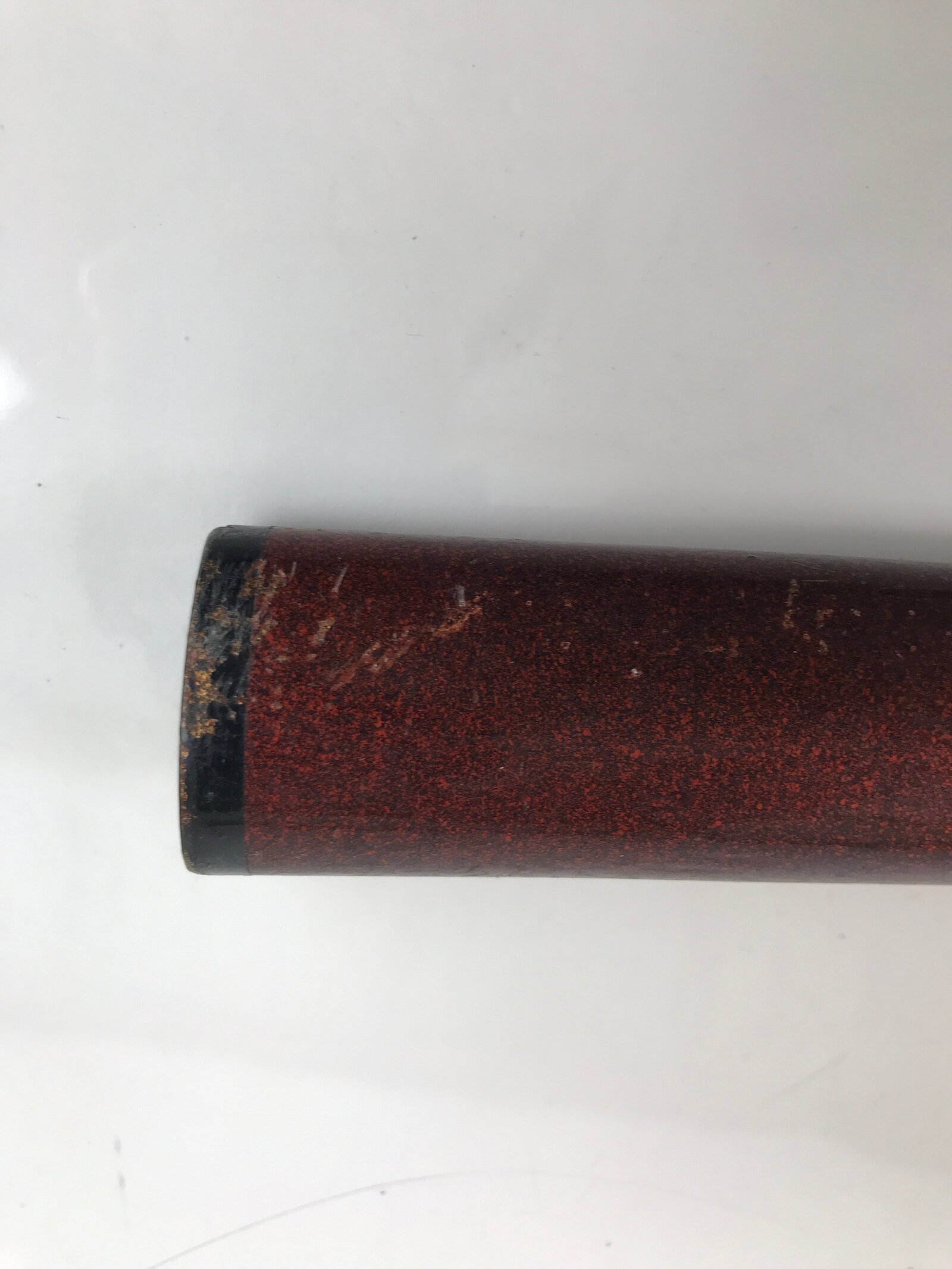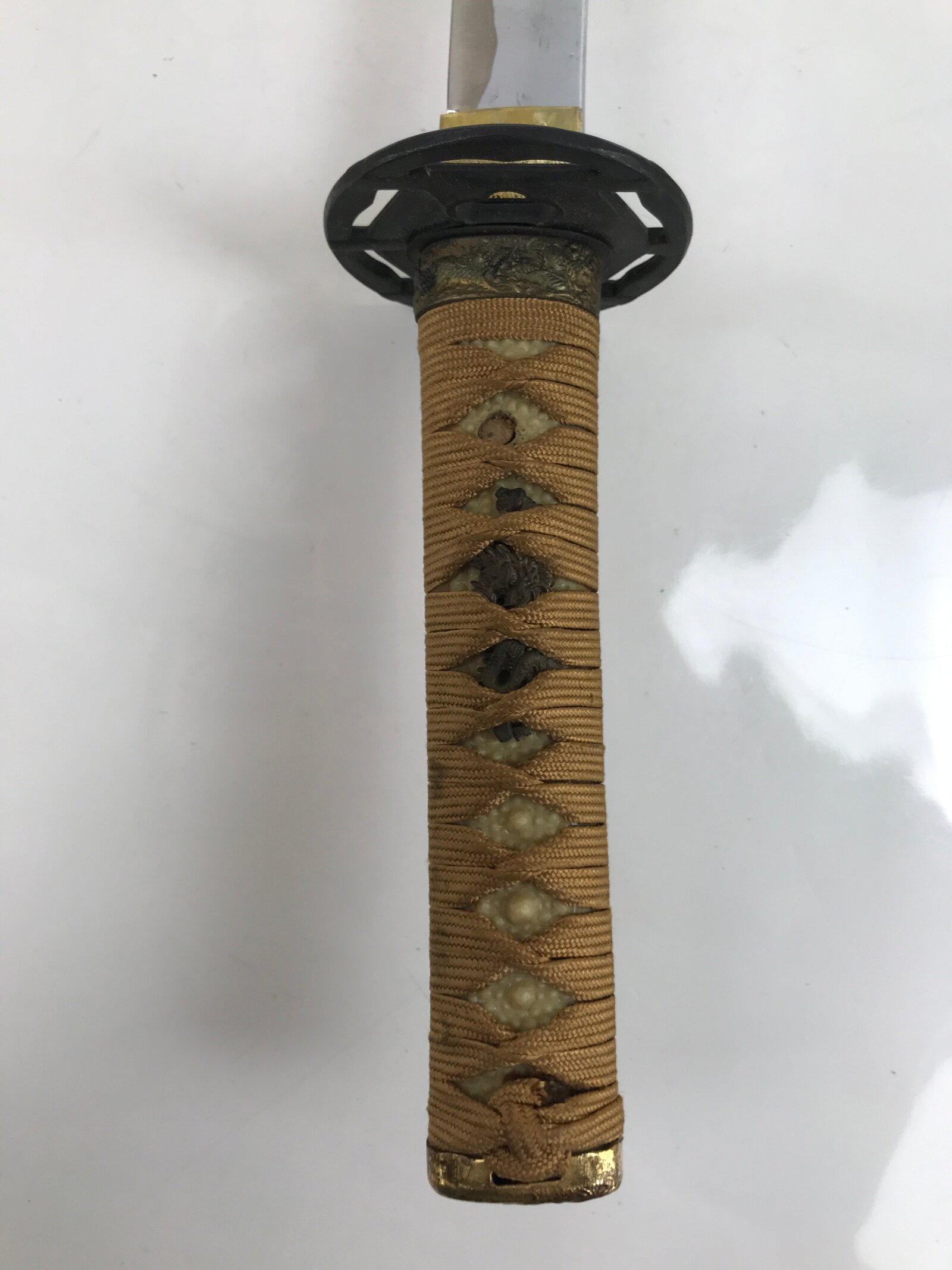 This is a vintage Japanese decorative imitation sword. The blade is made of metal crafted to look like a sharpened edge (not sharp) with a metal guard (tsuba) and a handle made of gold cord, wood, and textured plastic resin sheets. The guard is made or iron and features the traditional kikkou/kikkoumon hexagonal pattern the resembles a tortoise shell and symbolizes longevity. Woven into the handle are iron dragon charms called menuki. The sheath is wood coated with striking nashiji lacquer which is a gorgeous copper color that sparkles. There are other metal embellishments with the dragon motif such as at the top and base of the handle.