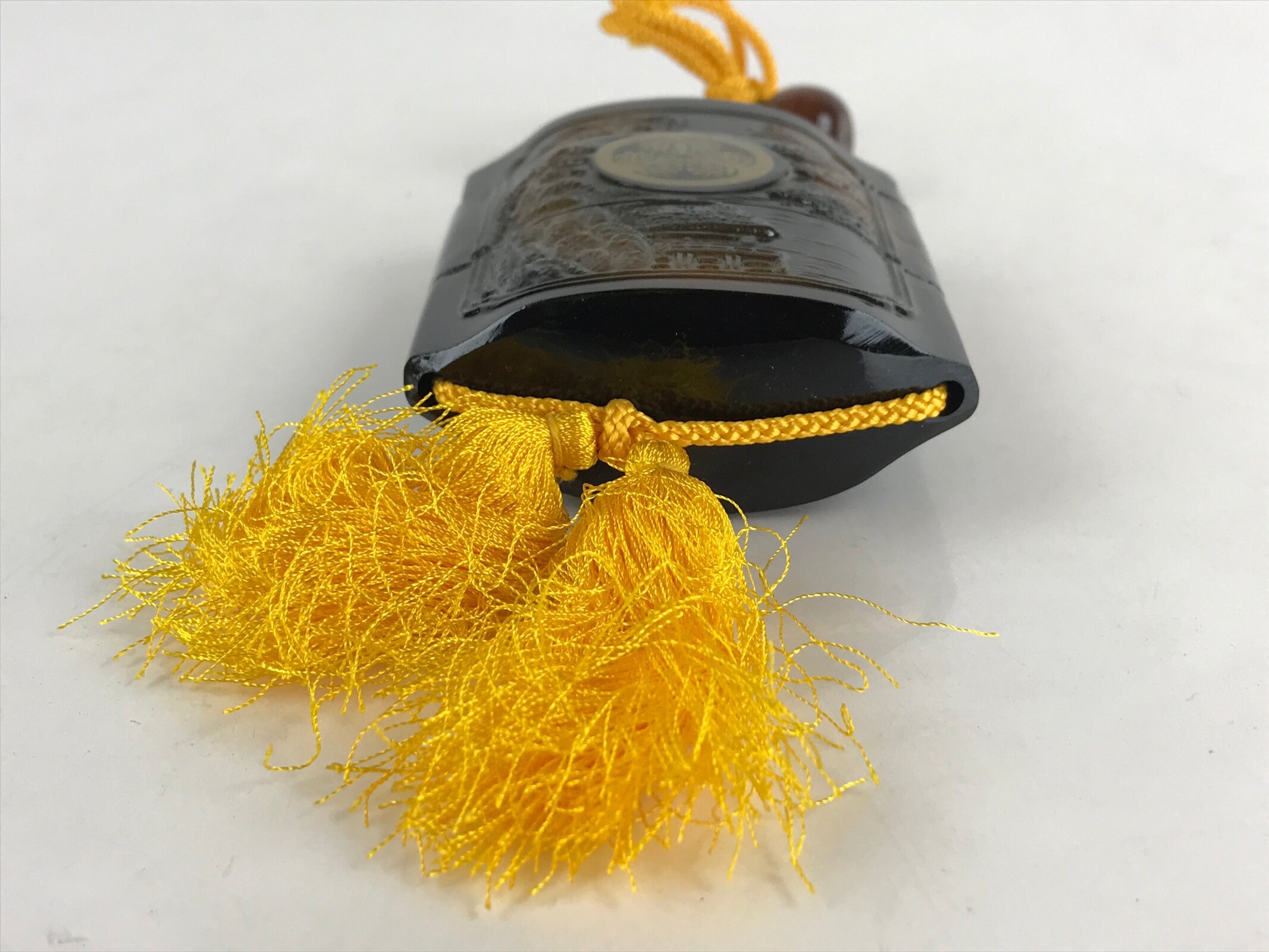 This is an imitation of the Japanese portable container, Inro. Inro is a small container for carrying medicines. At first, it was called Inro (In means seal) because it was used to put a seal in it. It was a practical tool used as a portable container for medicine, but later it was transformed into a work of art. It was used by hooking the netsuke on the obi of the kimono and hanging it. The design is a crane and Aoi crest with a pavilion. The netsuke is a wooden little gourd.