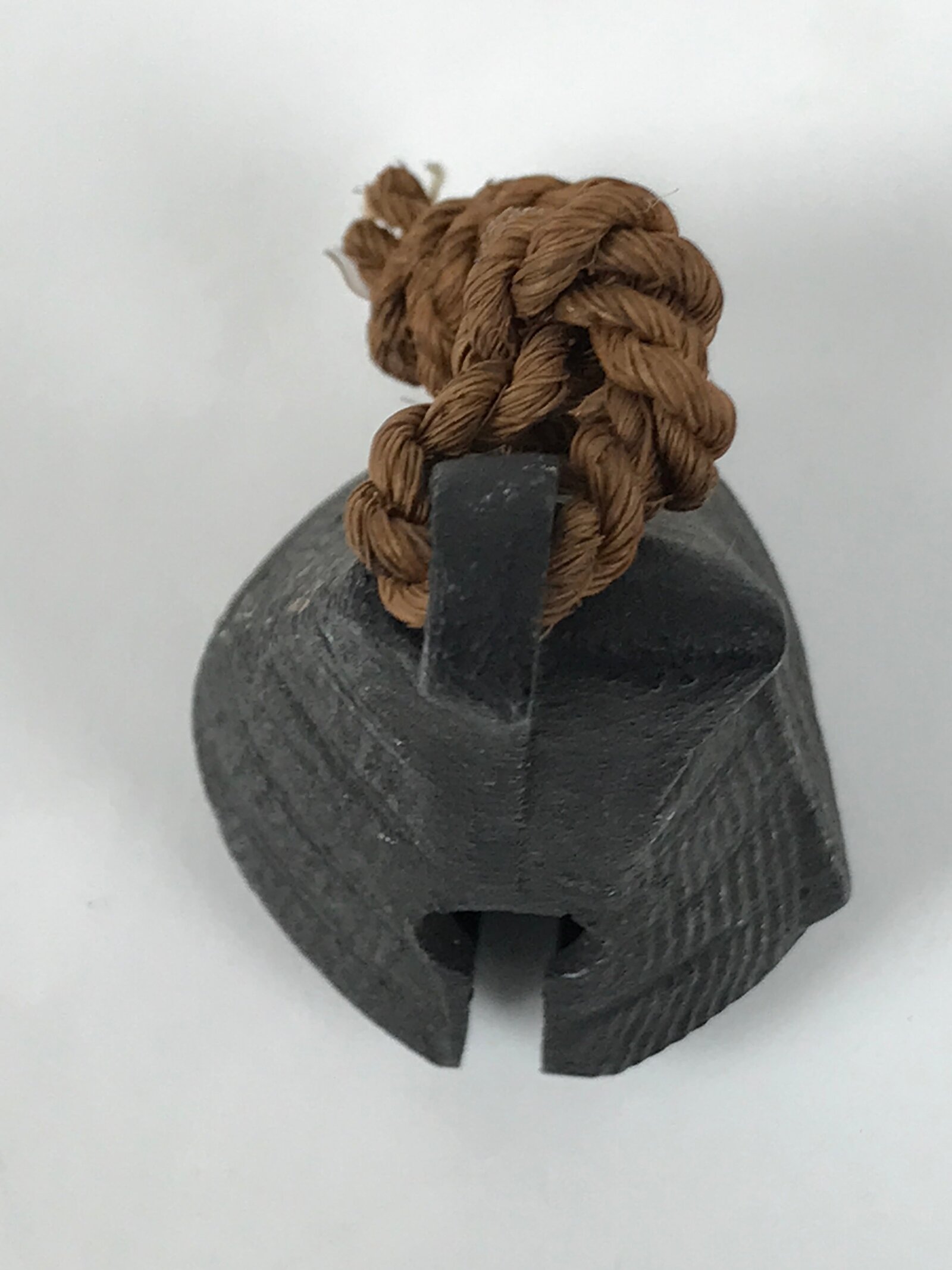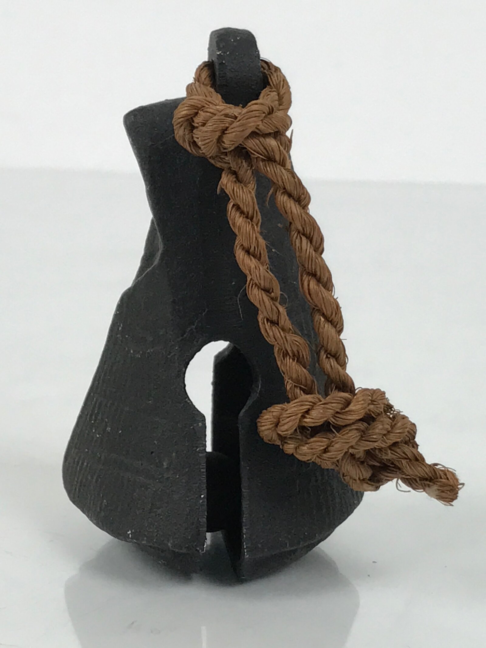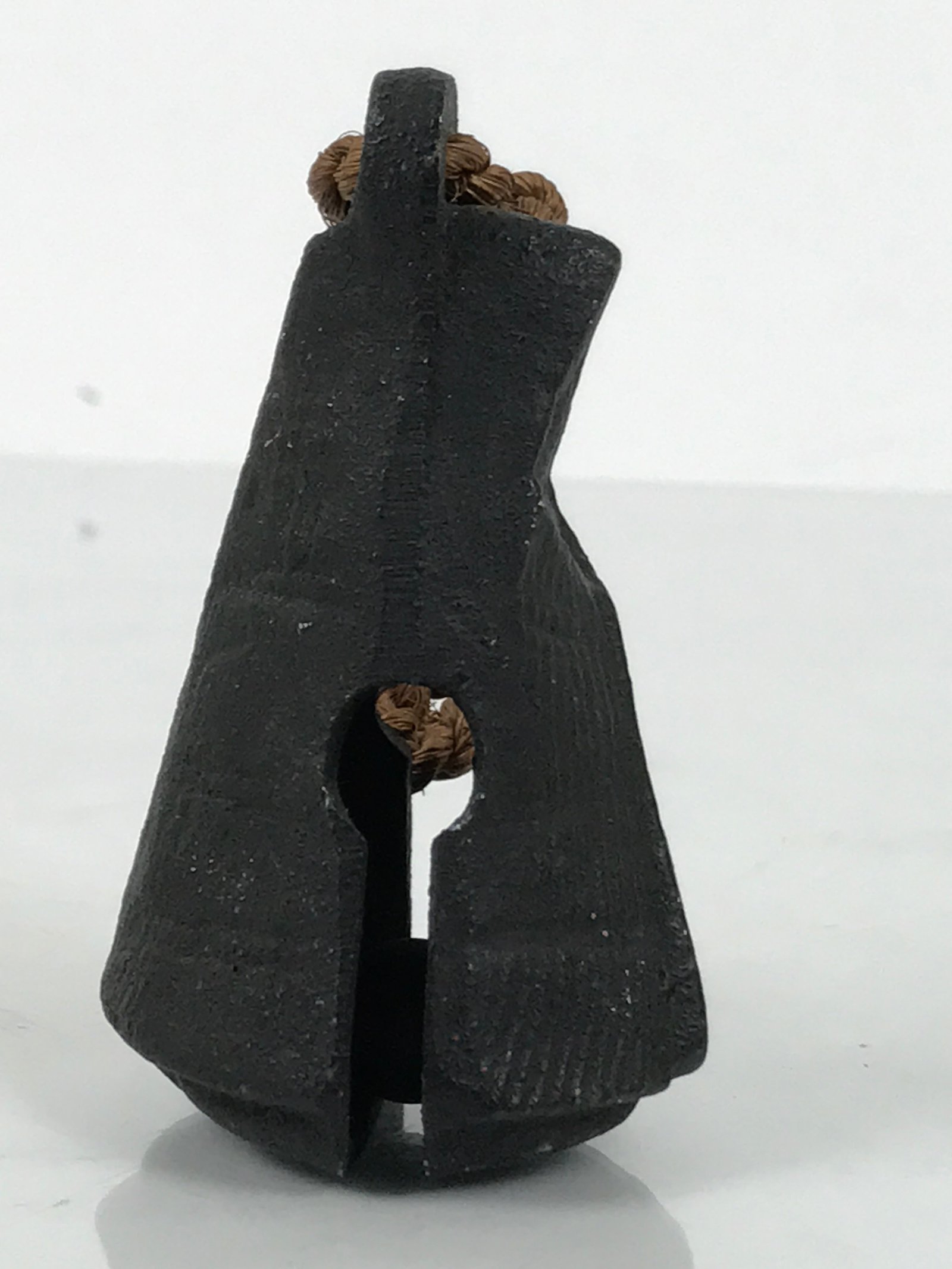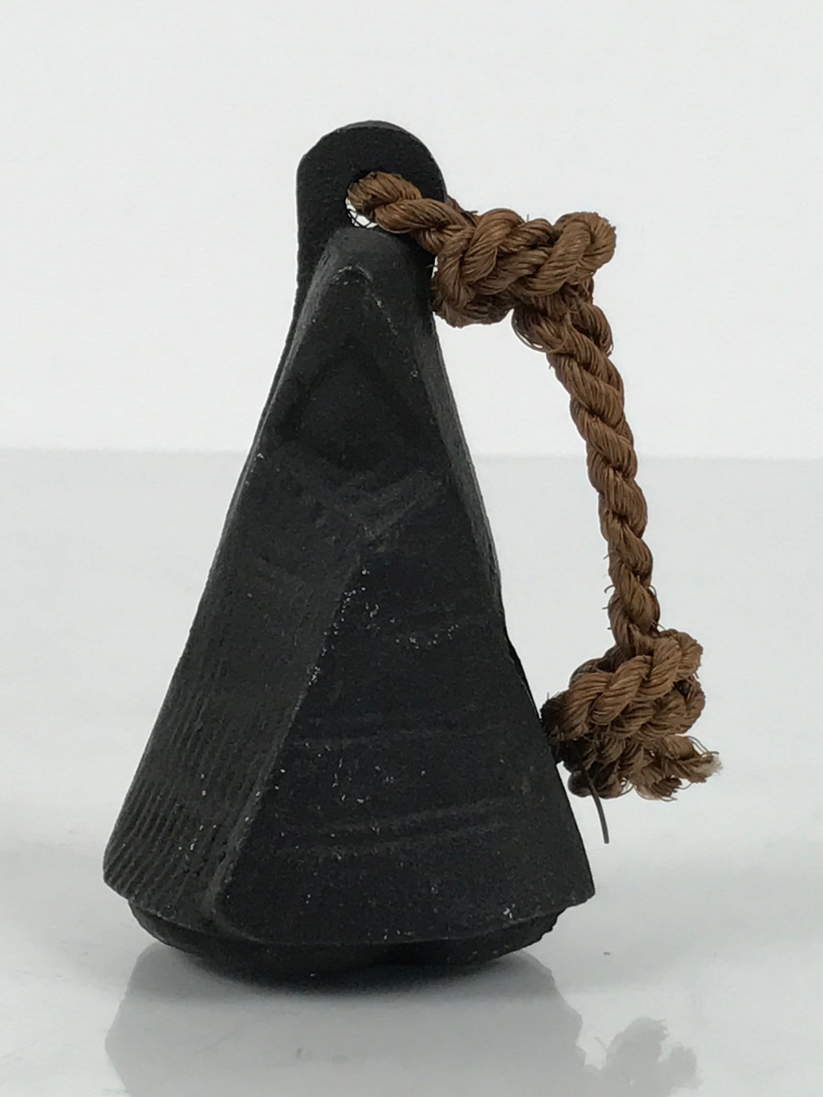 This is a vintage Japanese iron bell (tetsurin). It has a pyramid-like shape and appears to be in the shape of a person covering themselves with a traditional rain/snow coat called mino made from panels of straw. It has a twisted brown twine string at the top attached via a loop. There is an iron ball inside.