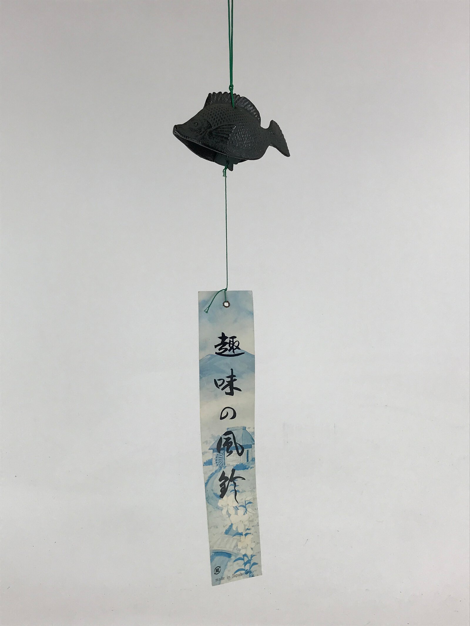 This is a vintage Japanese iron wind chime (Furin), Tetsurin. This piece is shaped like a fish. The Kanji characters say “My hobby, iron bell (趣味の風鈴)”. It can be used as a room decoration or an ornament.