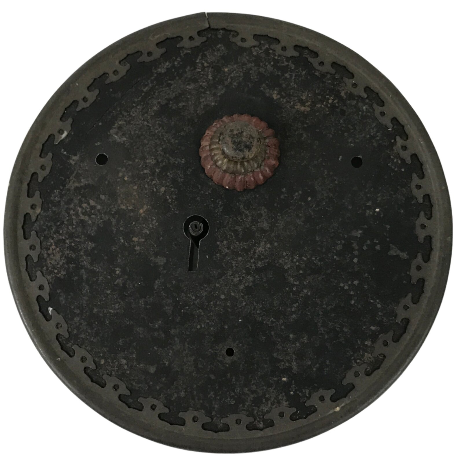 This is an antique Japanese metal lock. This piece of decorative hardware is used on drawers typically found on tansu chests and lockboxes. The base is made of iron while the decorations, knob, and border are made of other metals. It has a keyhole and a simple mechanism inside that is still functional/moveable. This item does not include a key and is in a “locked” position.