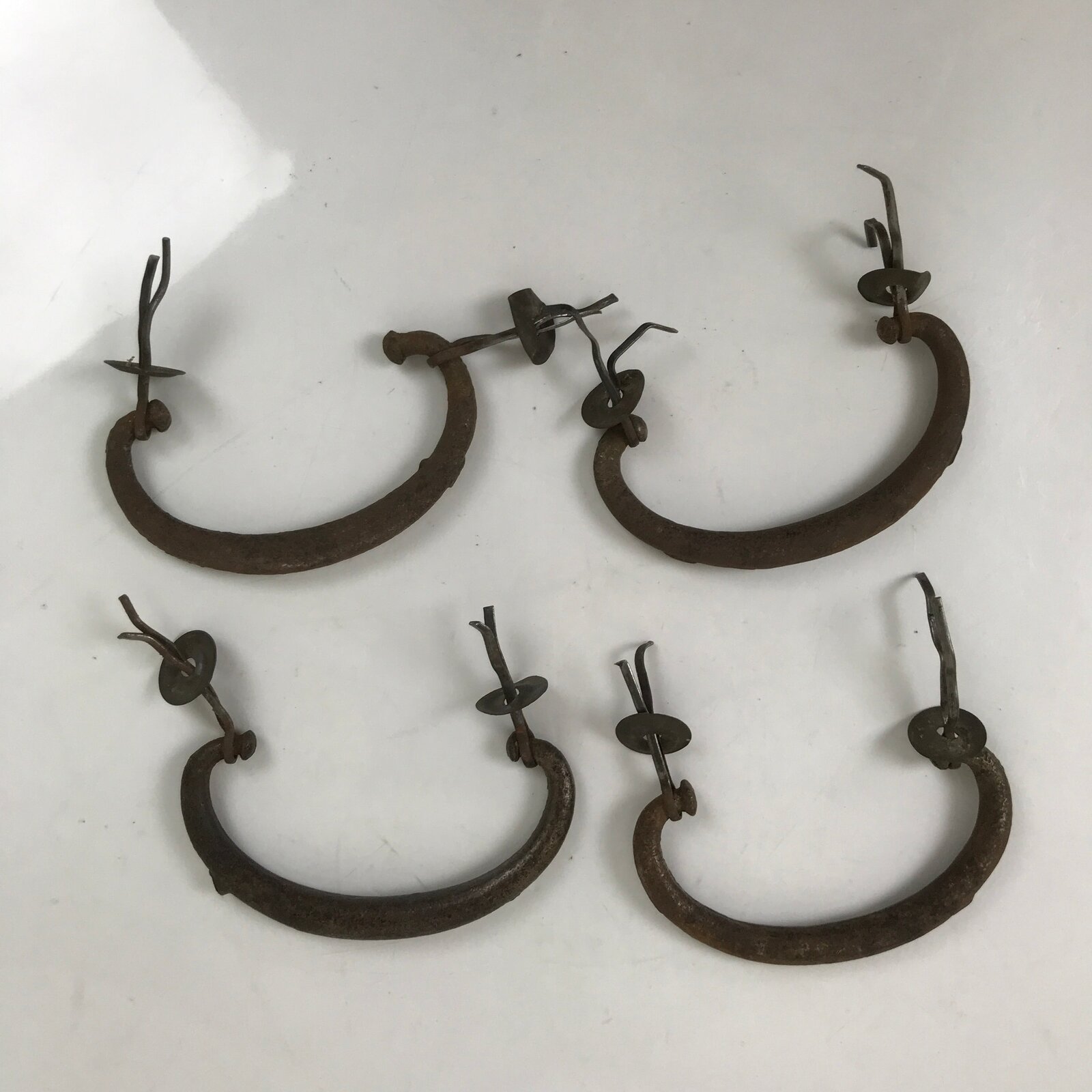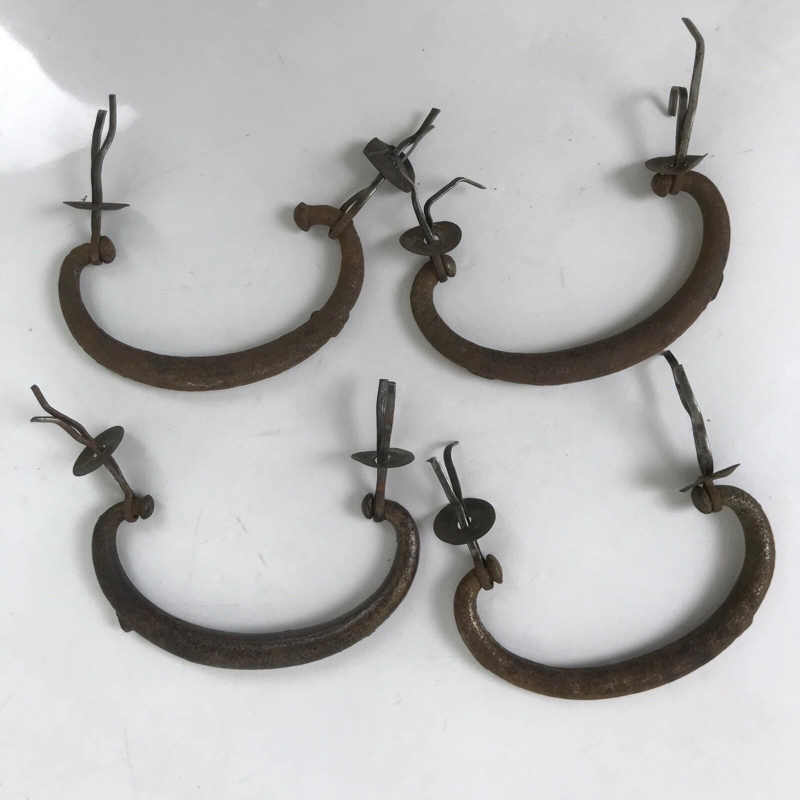 This is a set of four antique Japanese tansu chest handles. These drawer pulls have a very basic curved style with no other embellishments. They come attached to metal pins (with backplates to cover the hole) that are inserted in a hole in the wood and fanned out to hold the hardware in place.