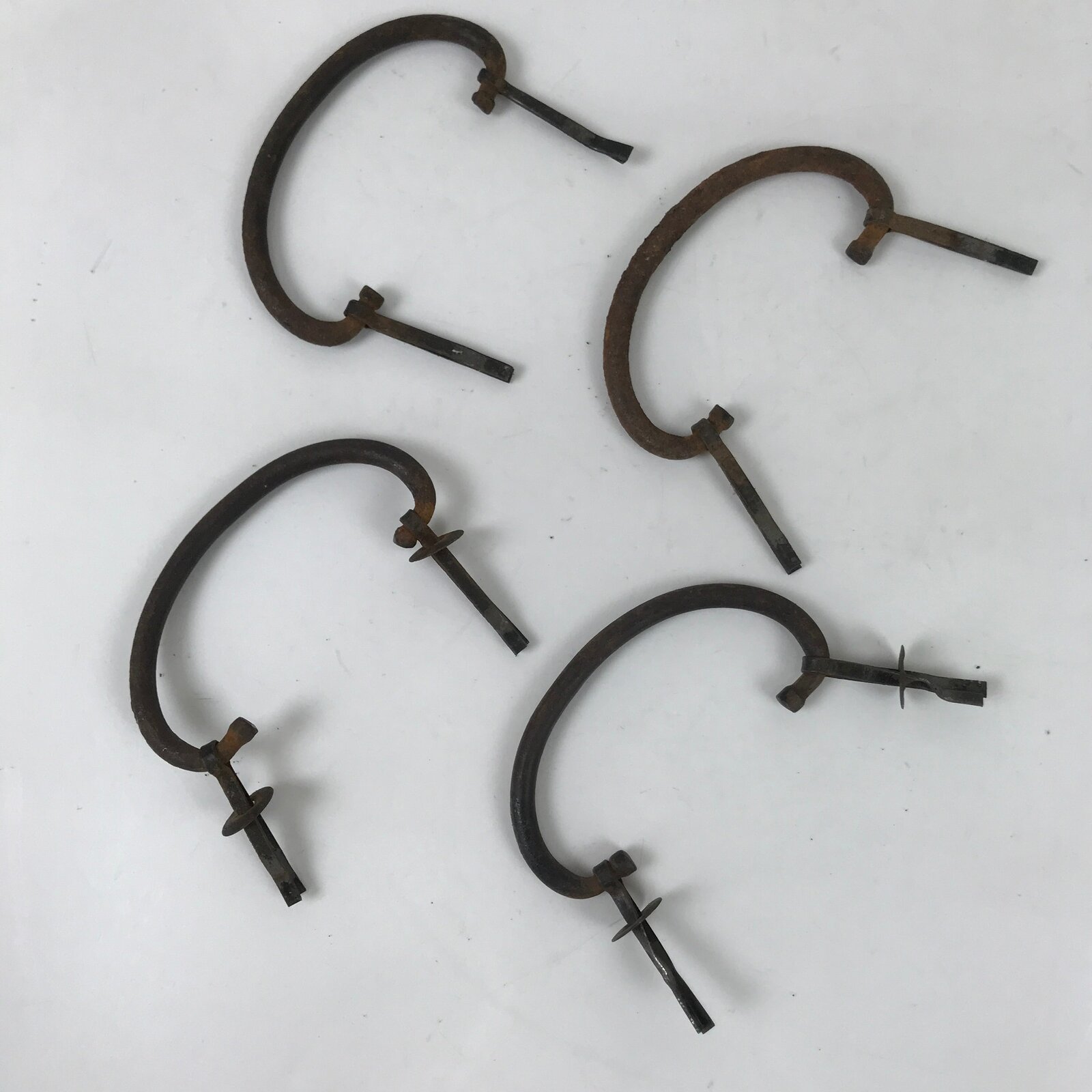 This is a set of four antique Japanese tansu chest handles. These drawer pulls have a very basic curved style with no other embellishments. They come attached to metal pins (two with backplates) that are inserted in a hole in the wood and fanned out to hold the hardware in place.