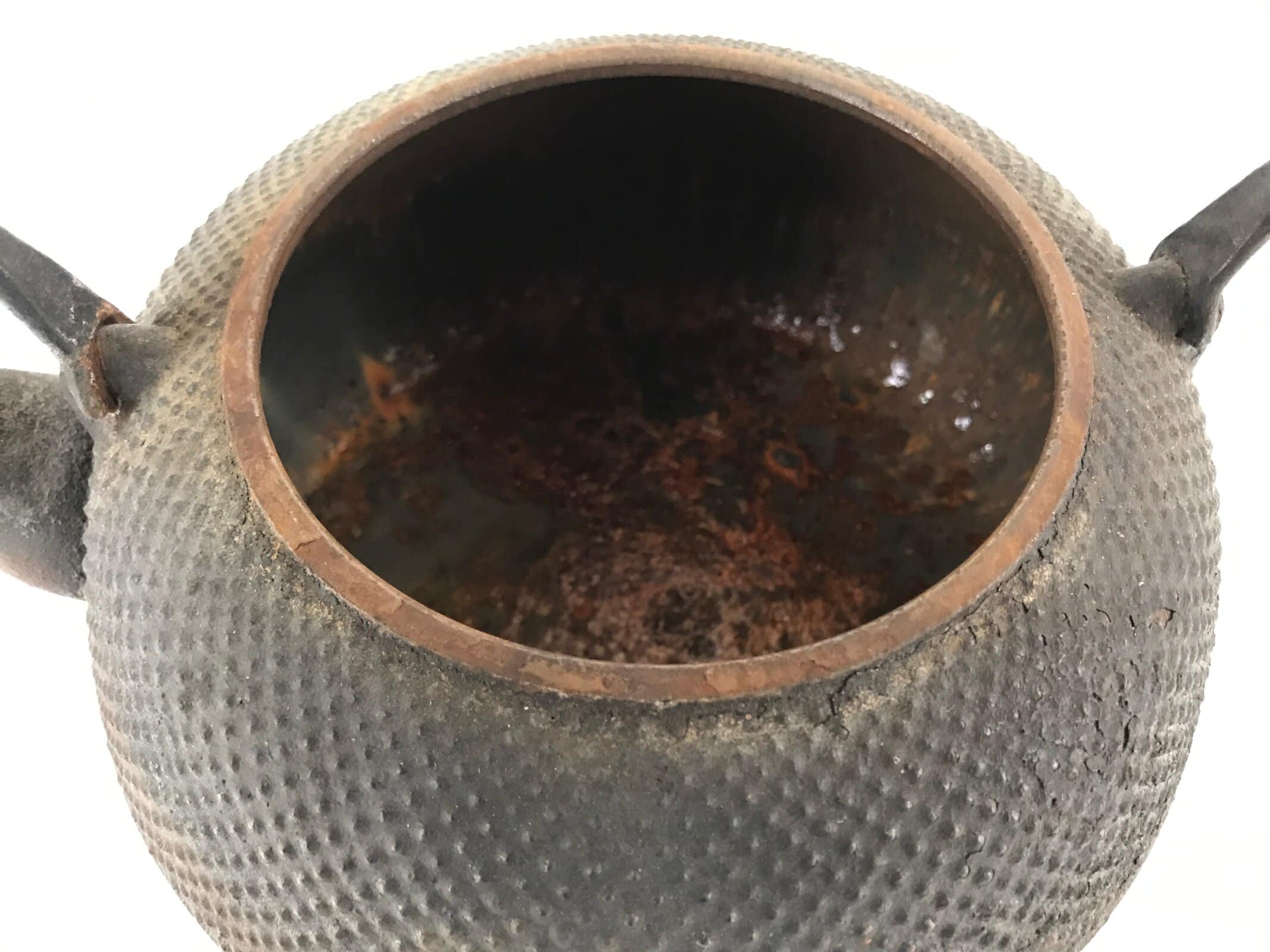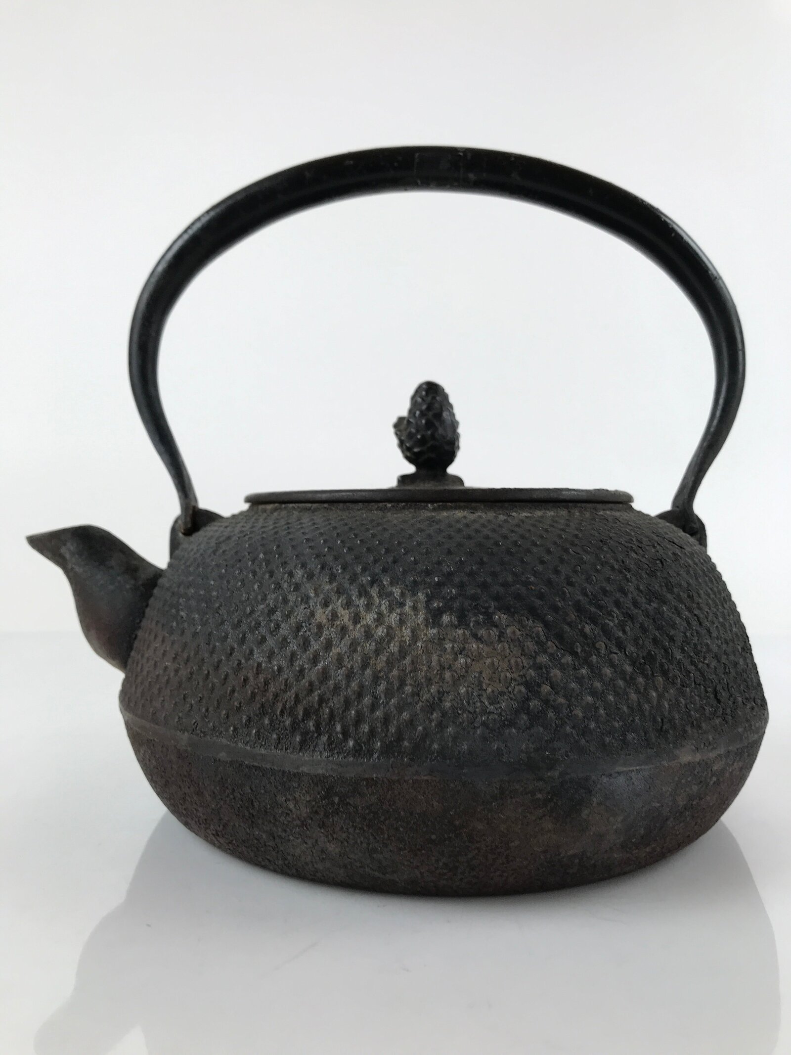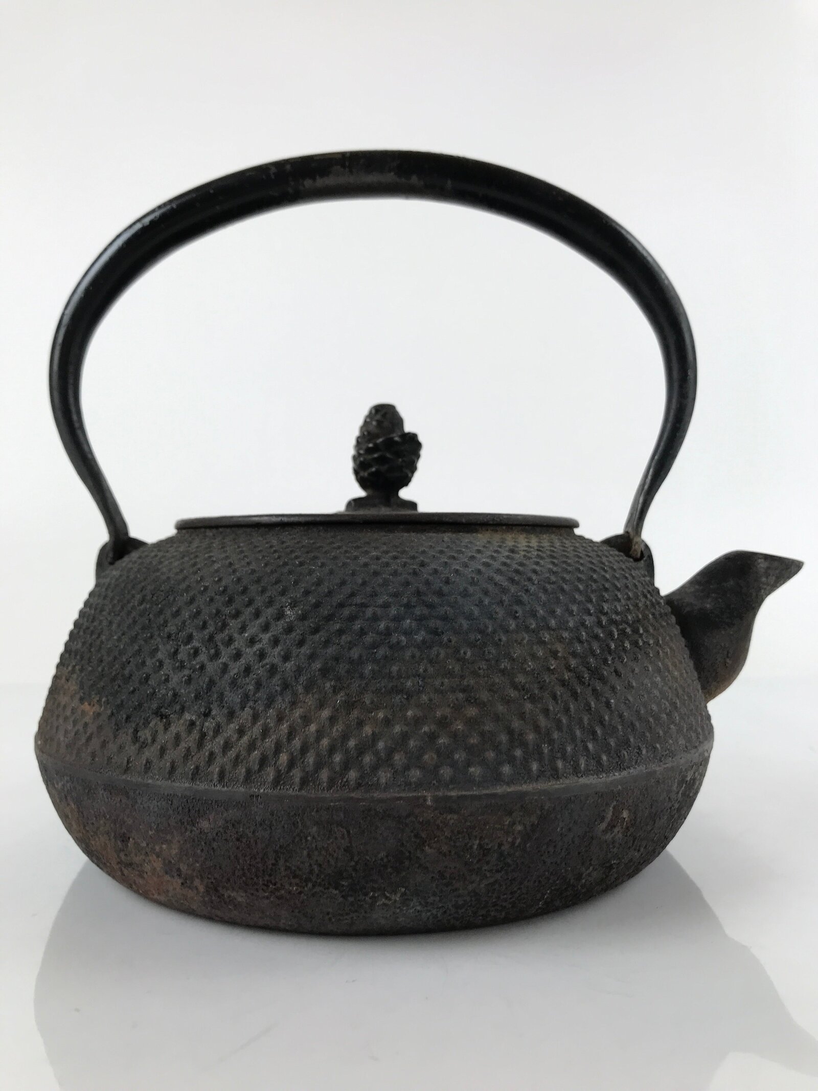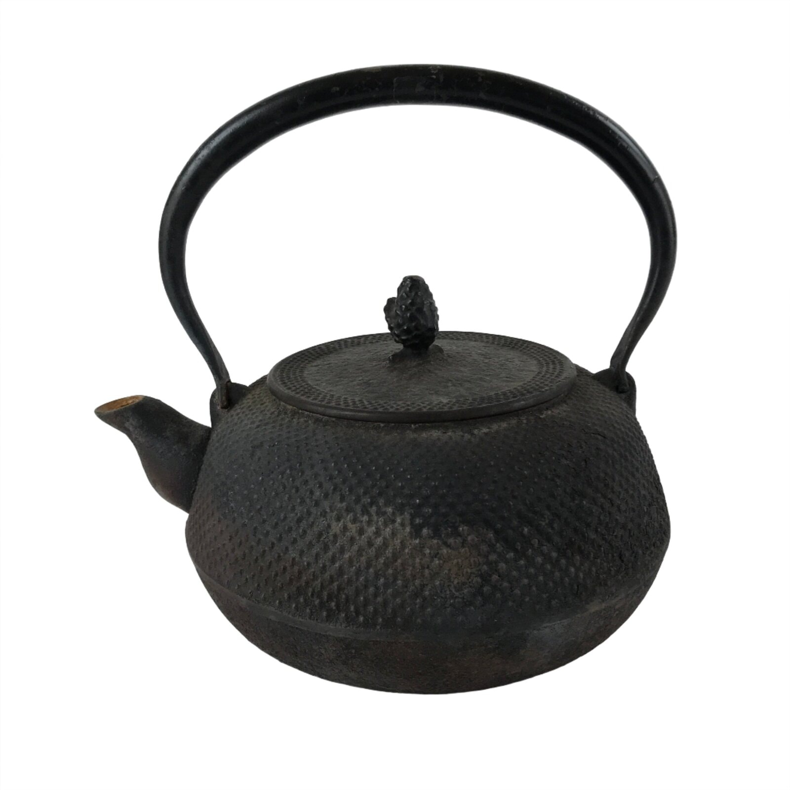This is a vintage Japanese Nambu tekki cast iron kettle, Tetsubin. It has a dotted “arare” pattern throughout as well as a pinecone handle on the lid. The handle is fixed to the body and cannot be folded. A kettle with a handle and a spout was used for medicinal purposes in the 13th century, but it is said that it was named ‘Tetsubin’ and began to be used in tea ceremonies in the late Edo period. Efficacy: Boiling water in an iron kettle (Tetsubin) makes the water milder and tastier and provides iron.