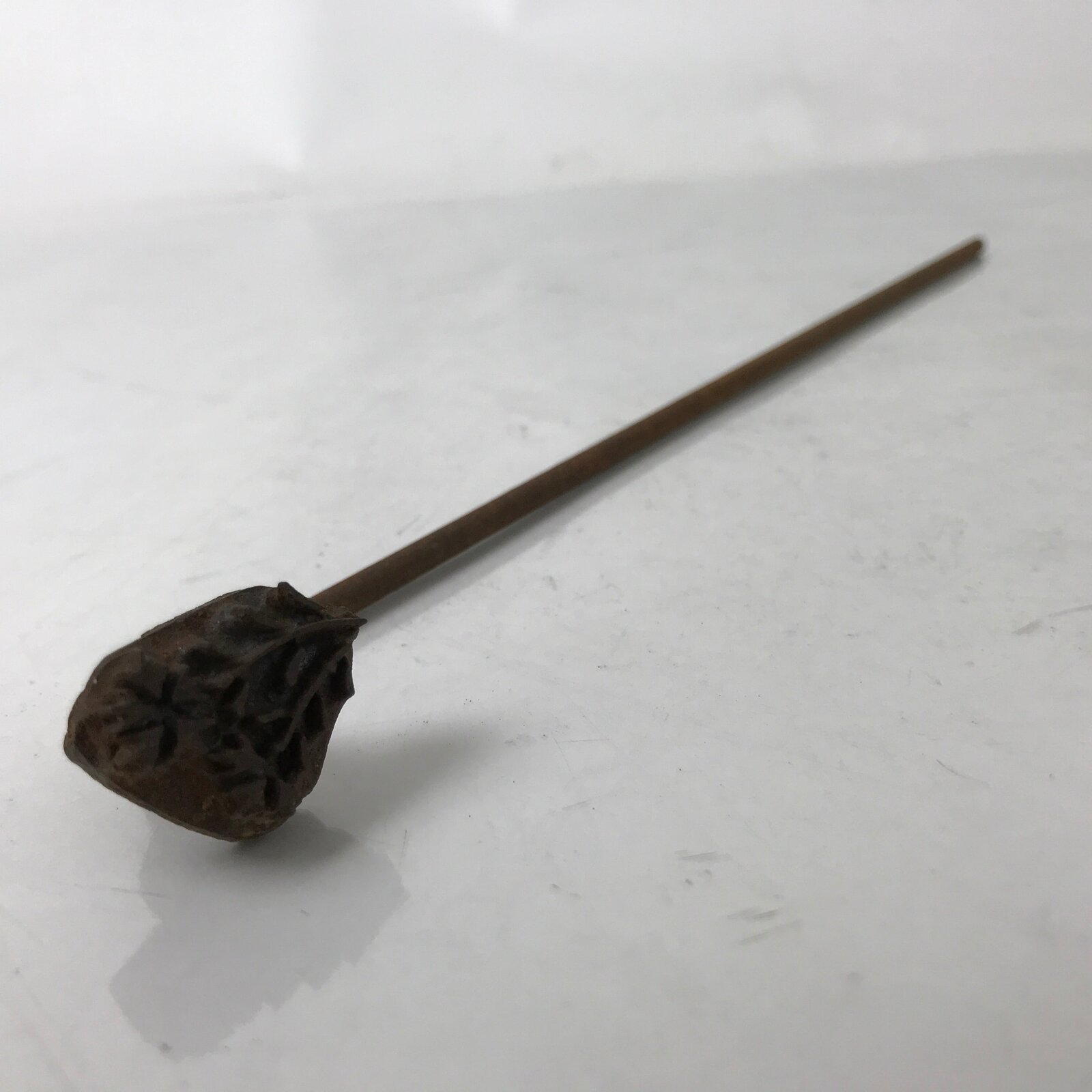 This is a vintage cast iron branding stamp called yaki-in. This piece is meant to be placed over fire or coals and is used to mark wood, leather, fabrics, and most famously Japanese sweets such as manju. It has the image of a small bunch of carnation flowers (nadeshiko).