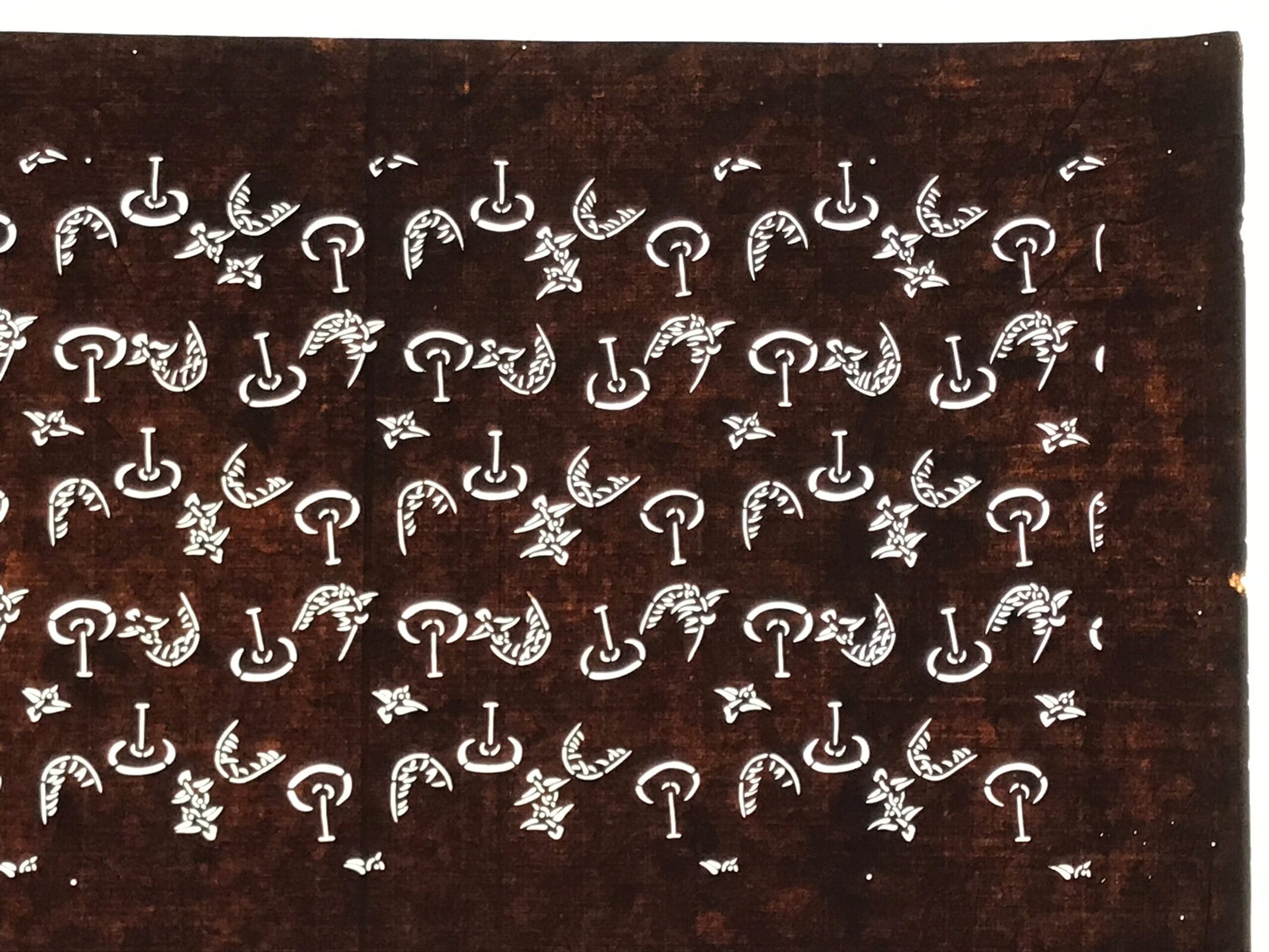 This antique Katagami was designed during the mid or late Edo period (1860) to early Meiji (1900) in Central Japan. It is made of two or more layers of handmade mulberry washi paper laminated together and waterproofed with persimmon tannin. Katagami printing uses a technique called resist dye where a paste is applied to the fabric with the katagami before dipping in ink. The open space on the katagami will be a negative space in the printed design.