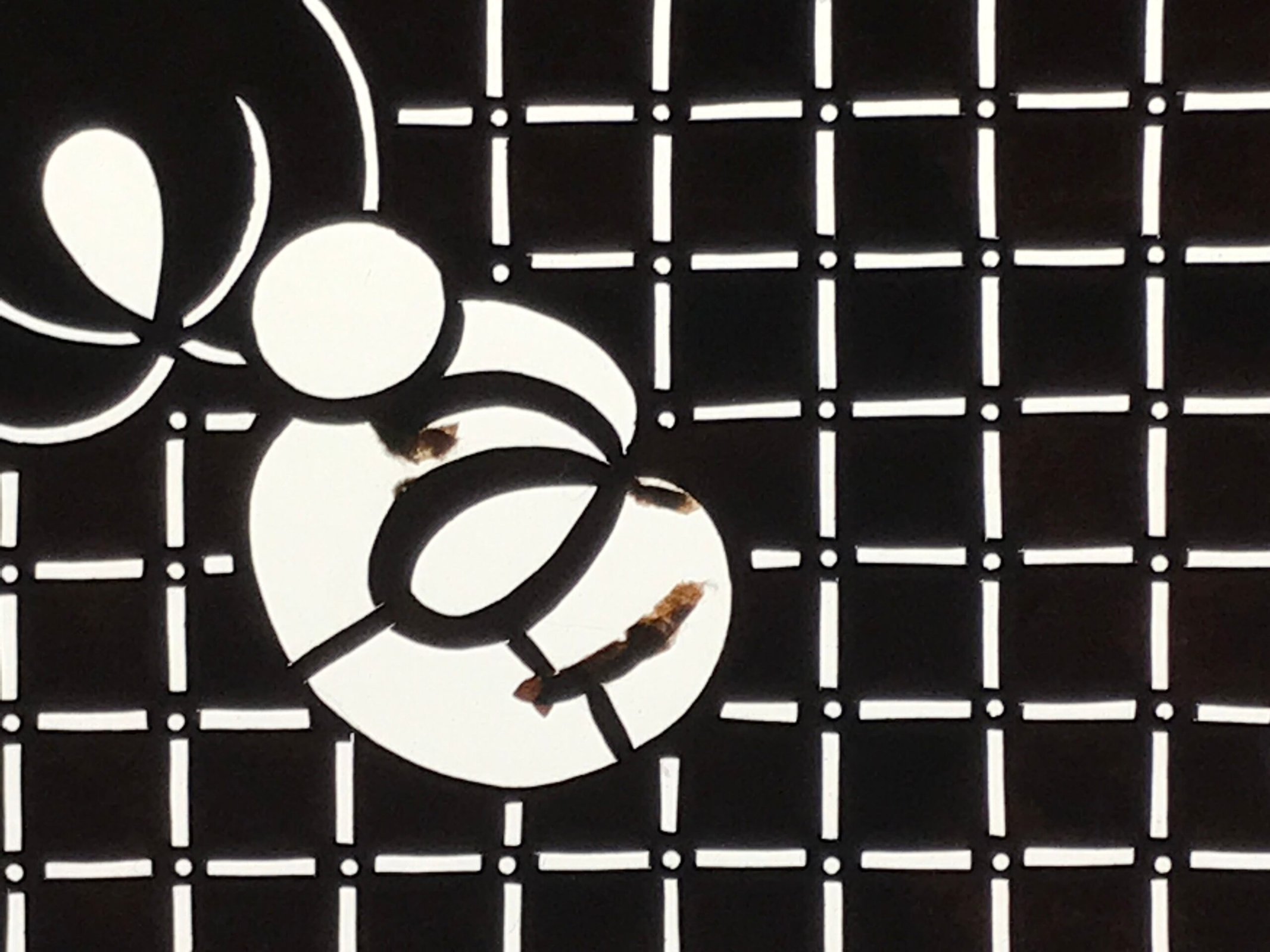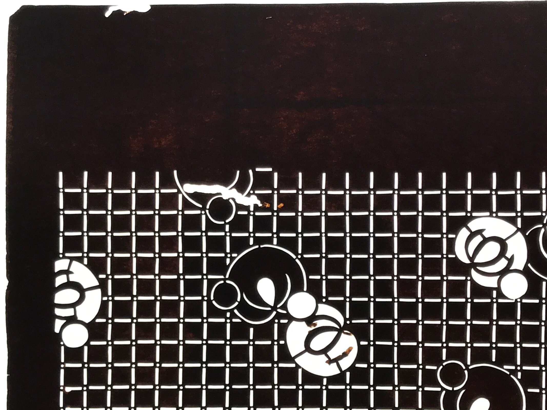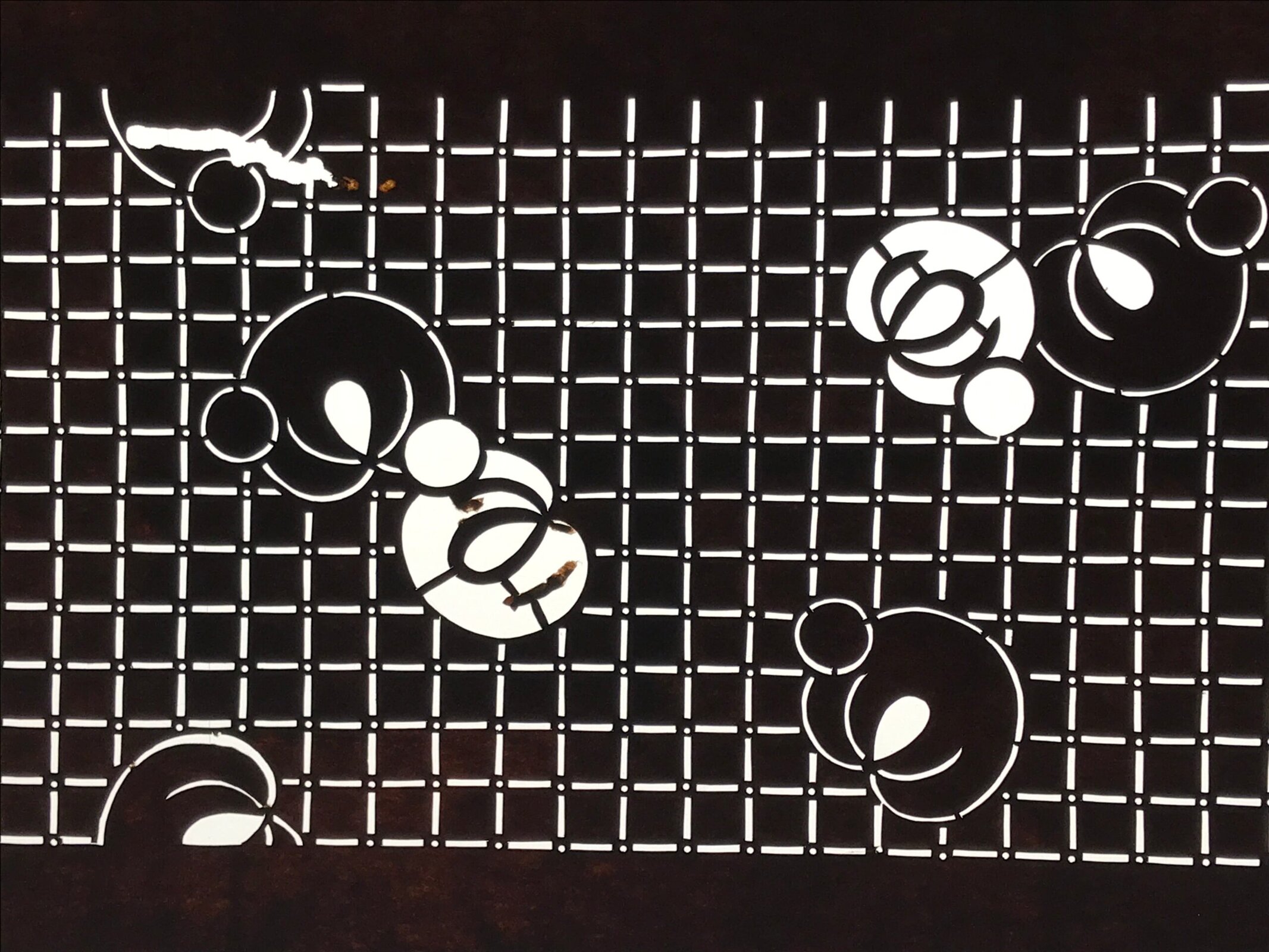 This antique Katagami was designed during the mid or late Edo period (1860) to early Meiji (1900) in Central Japan. It is made of two or more layers of handmade mulberry washi paper laminated together and waterproofed with persimmon tannin. Katagami printing uses a technique called resist dye where a paste is applied to the fabric with the katagami before dipping in ink. The open space on the katagami will be a negative space in the printed design.