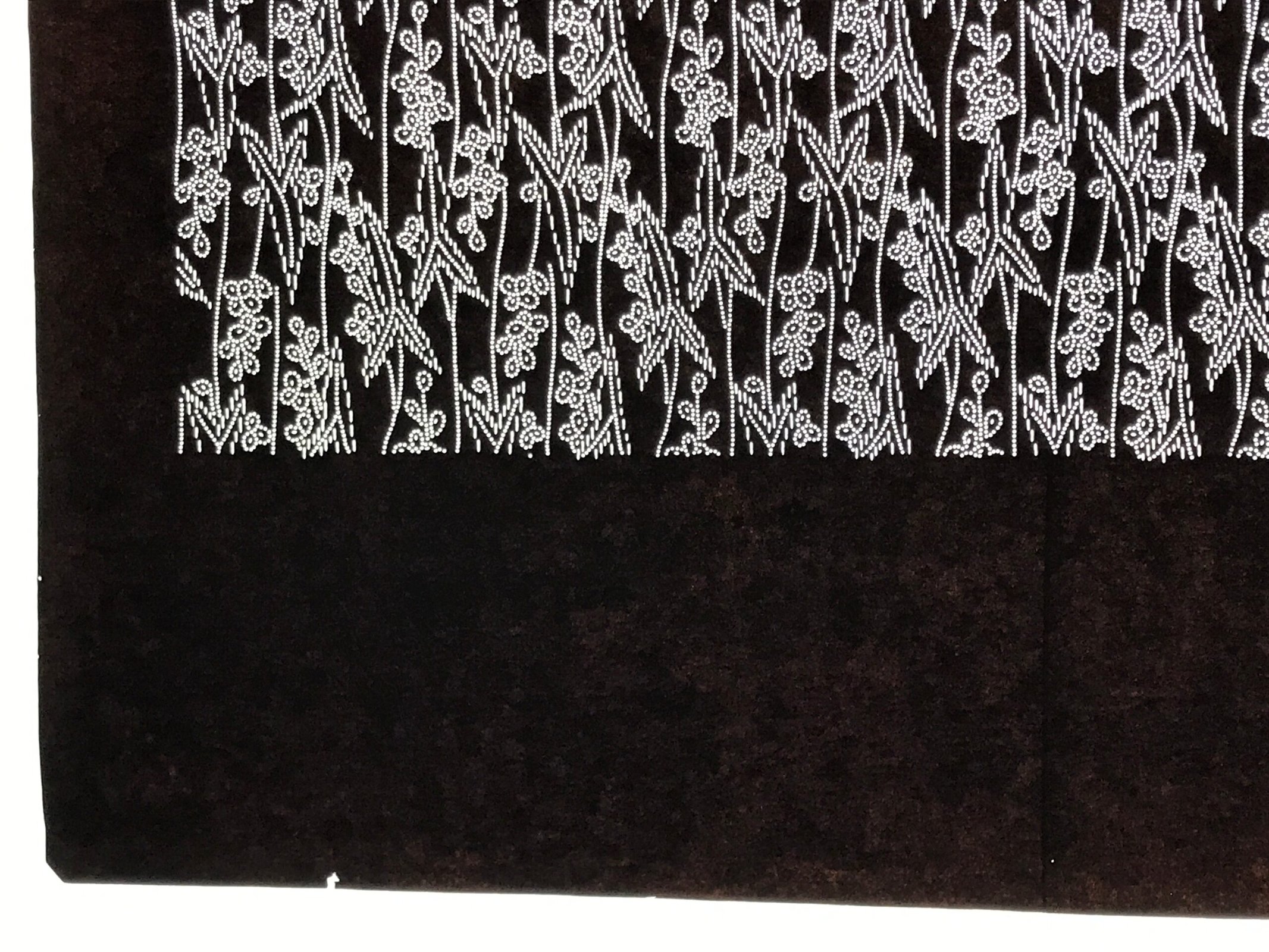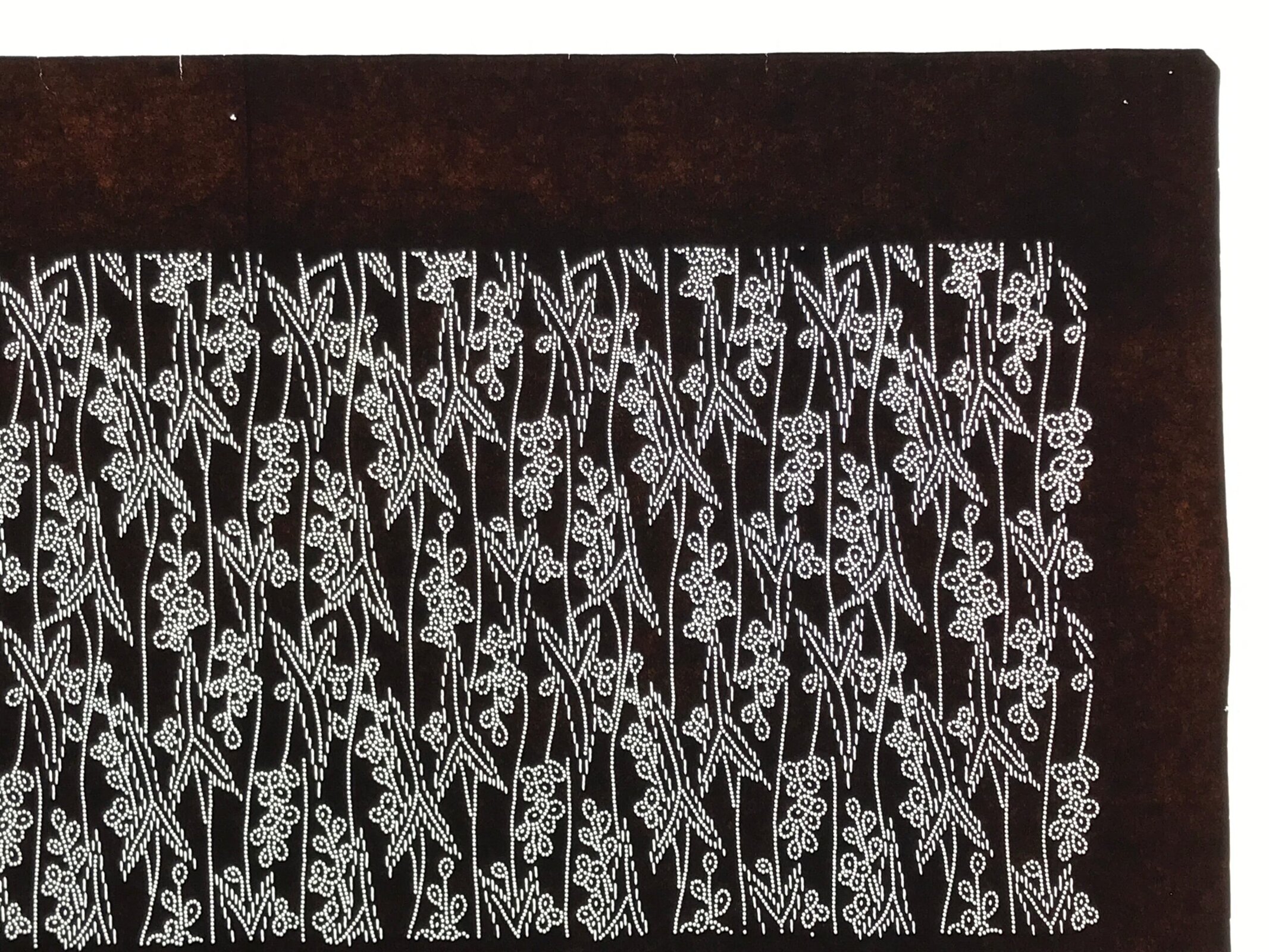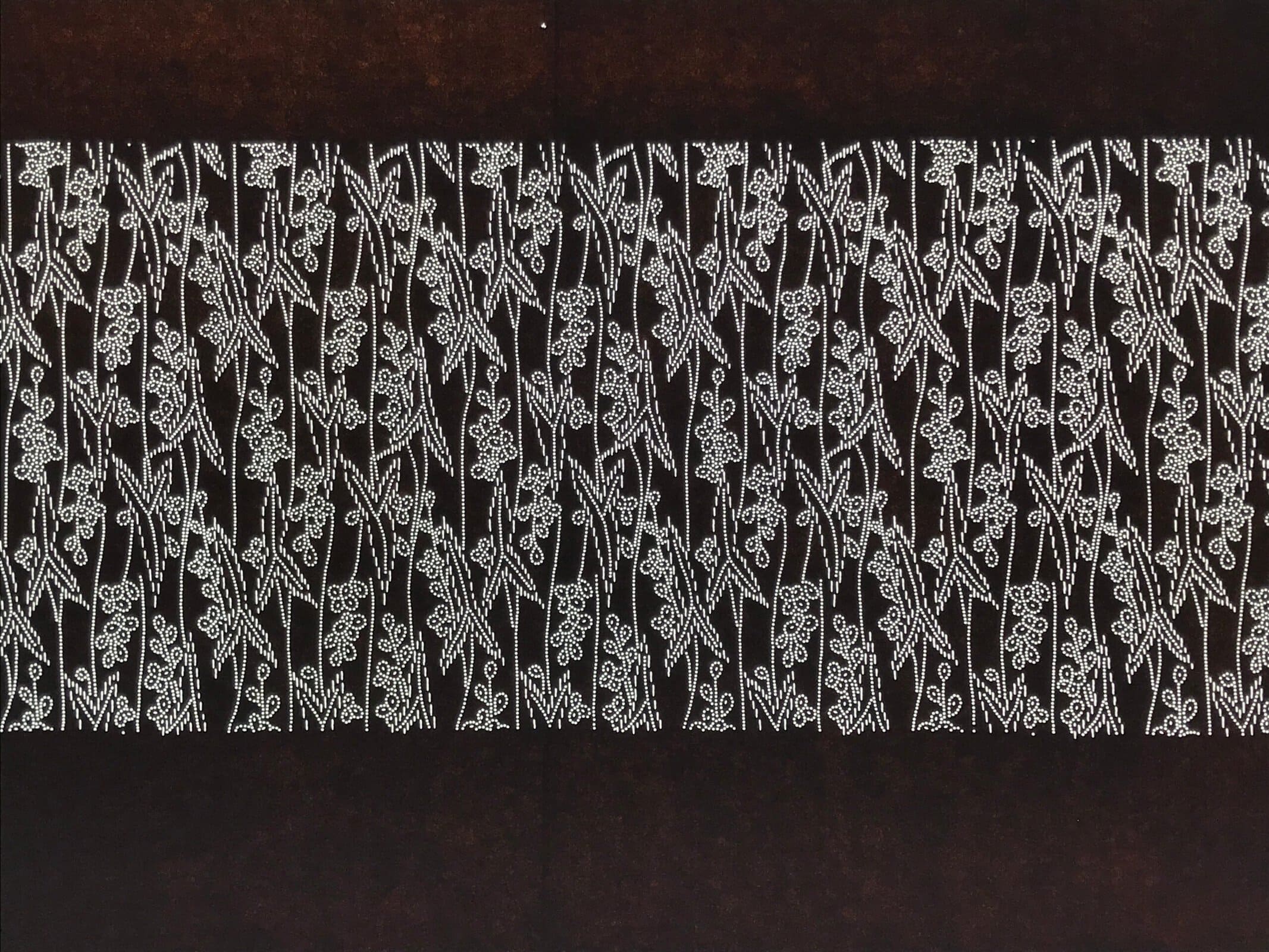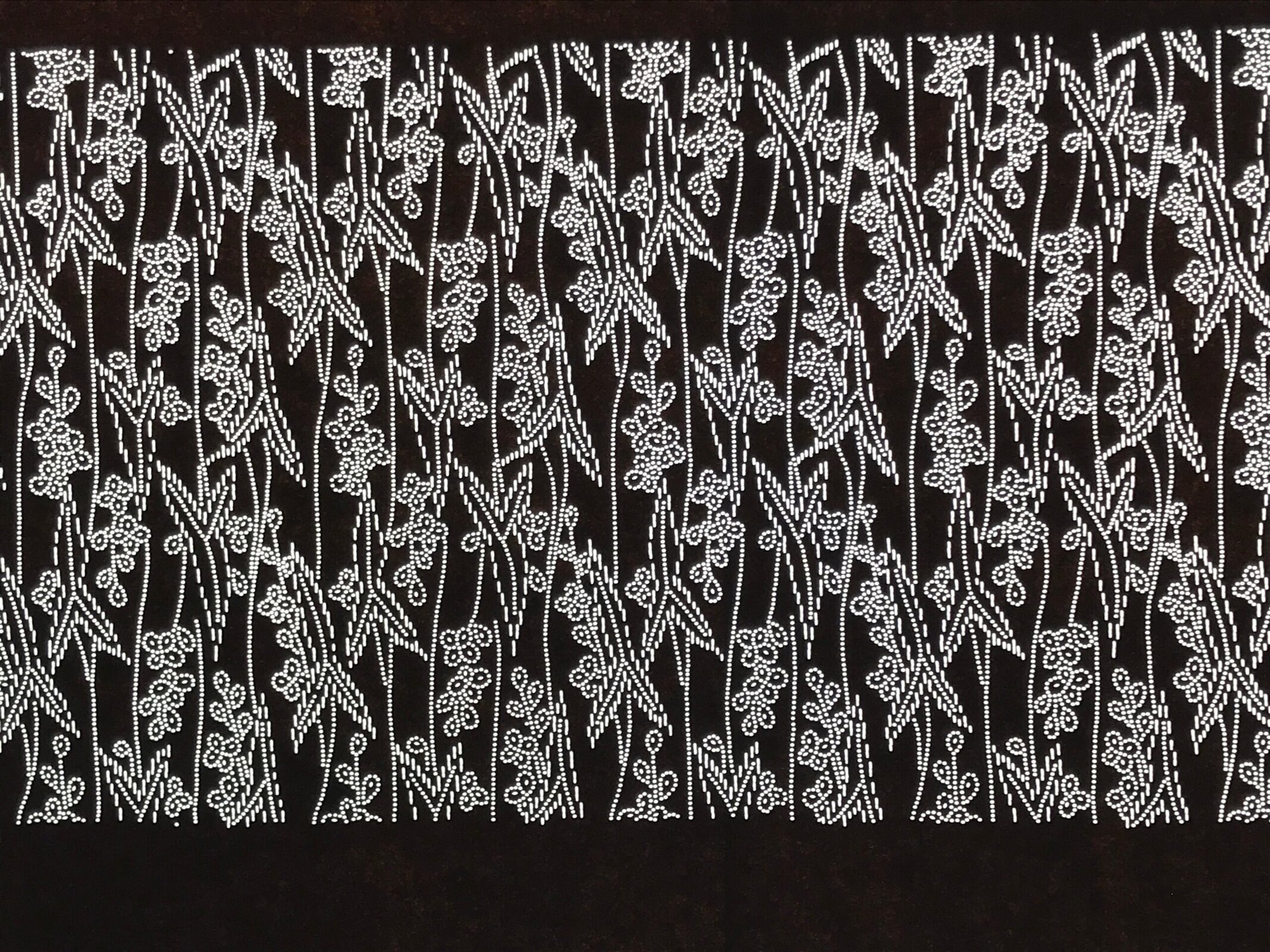 Using traditional mulberry washi paper, this Ise katagami stencil features a detailed design of spearhead leaves and bunches of berries in alternating vertical lines.