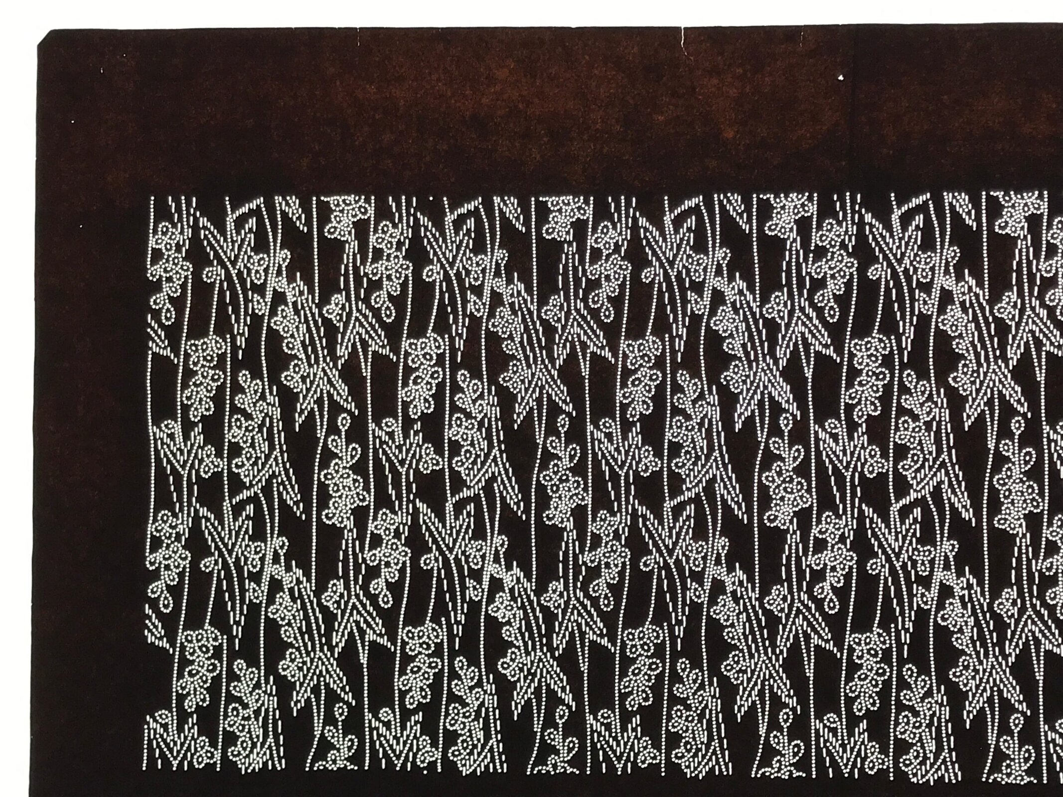 This antique Katagami was designed during the mid or late Edo period (1860) to early Meiji (1900) in Central Japan. It is made of two or more layers of handmade mulberry washi paper laminated together and waterproofed with persimmon tannin. Katagami printing uses a technique called resist dye where a paste is applied to the fabric with the katagami before dipping in ink. The open space on the katagami will be a negative space in the printed design.