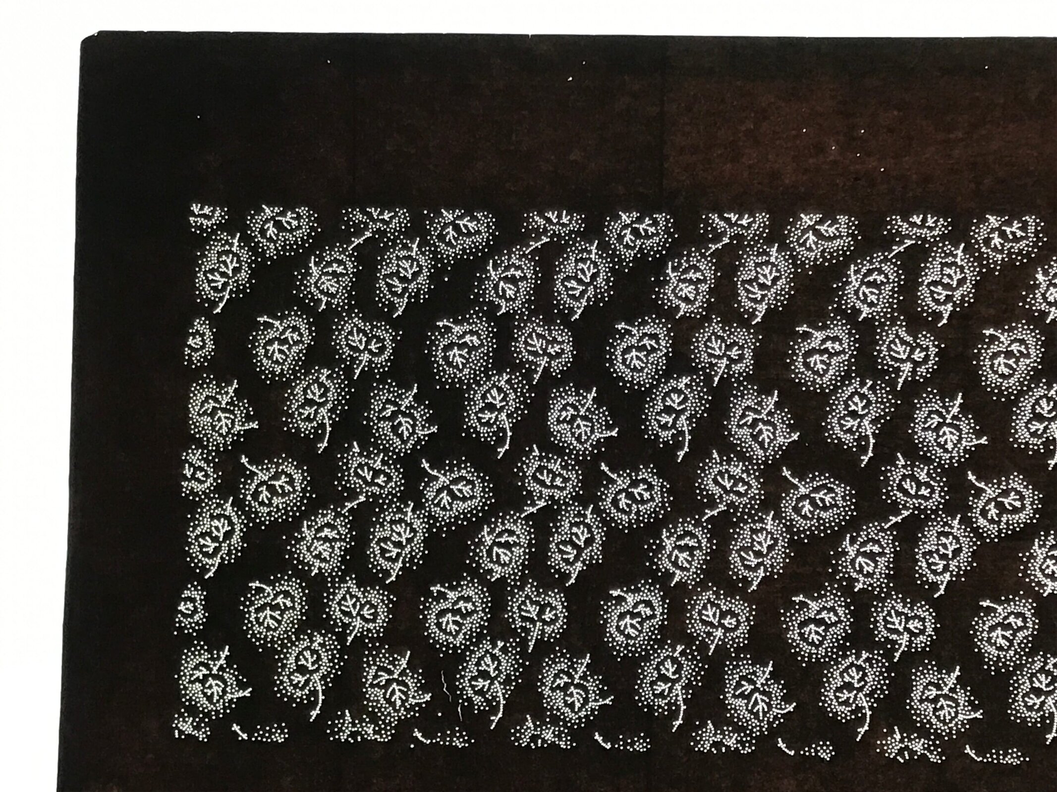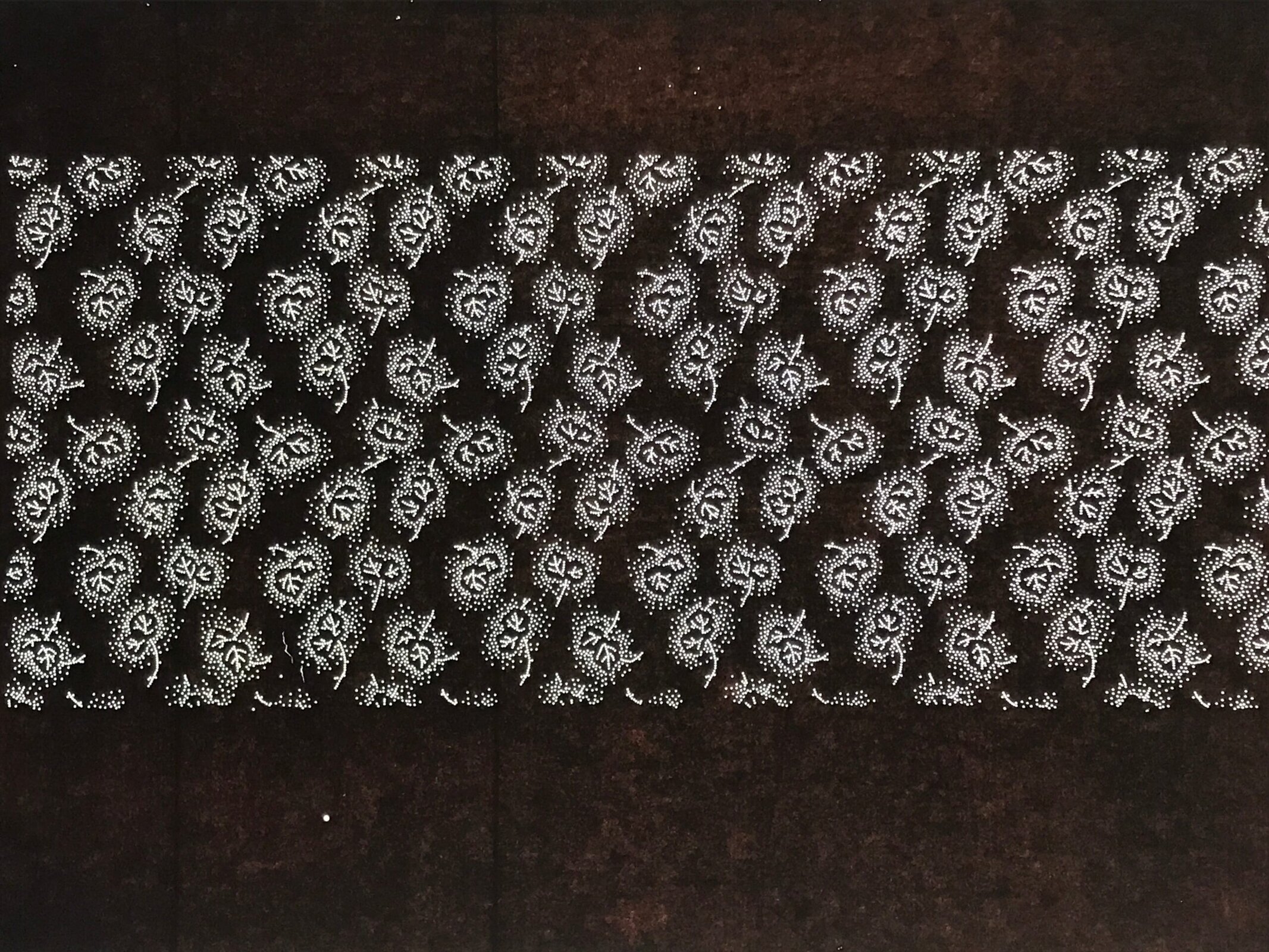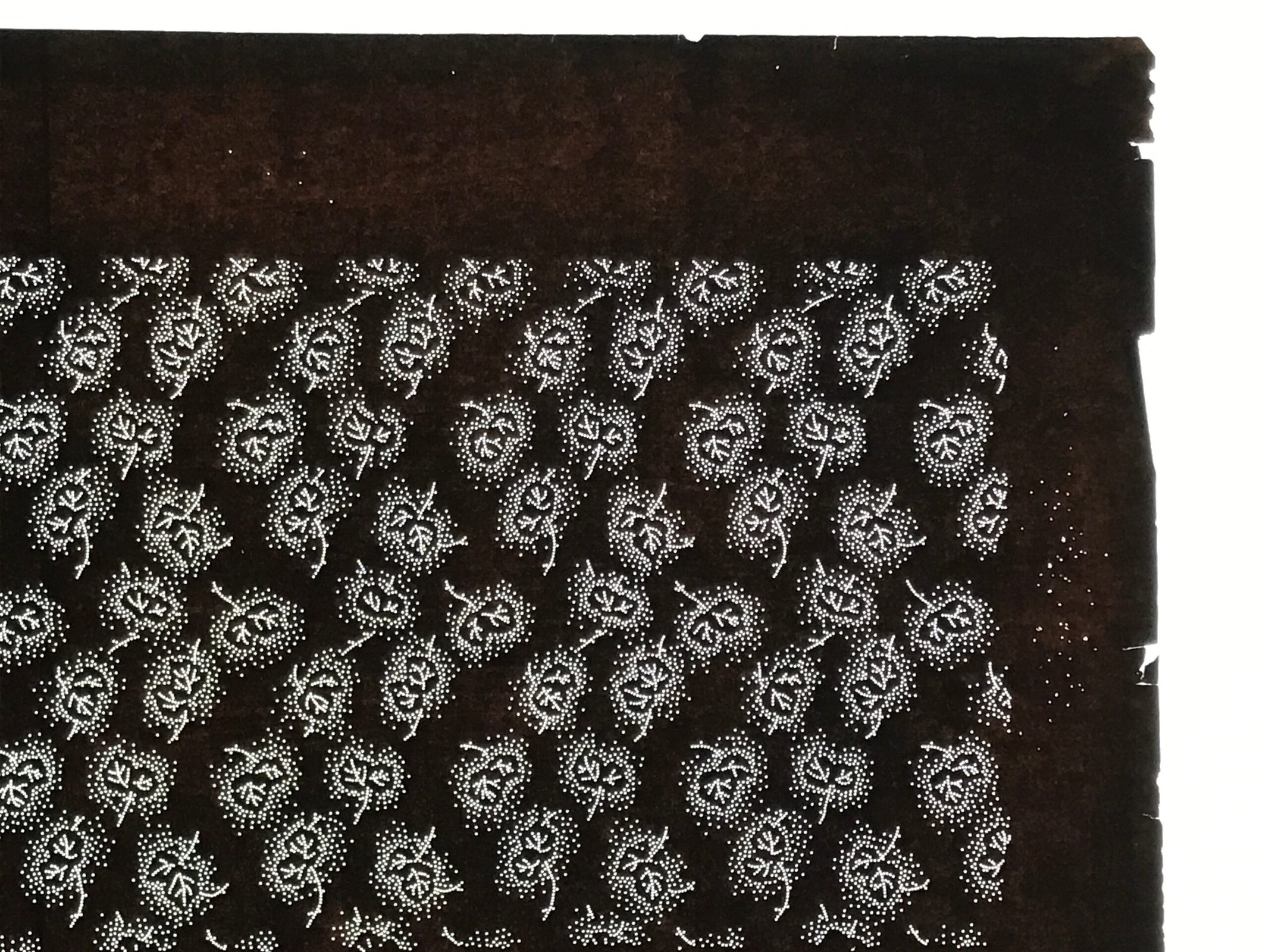 This antique Katagami was designed during the mid or late Edo period (1860) to early Meiji (1900) in Central Japan. It is made of two or more layers of handmade mulberry washi paper laminated together and waterproofed with persimmon tannin. Katagami printing uses a technique called resist dye where a paste is applied to the fabric with the katagami before dipping in ink. The open space on the katagami will be a negative space in the printed design.