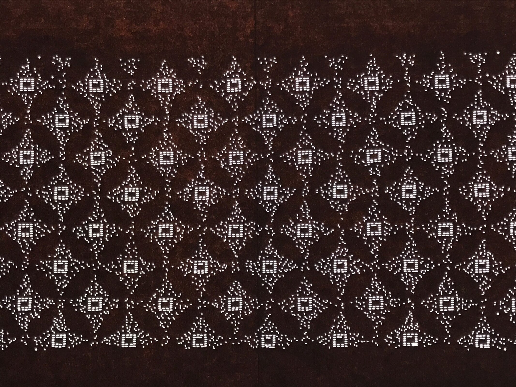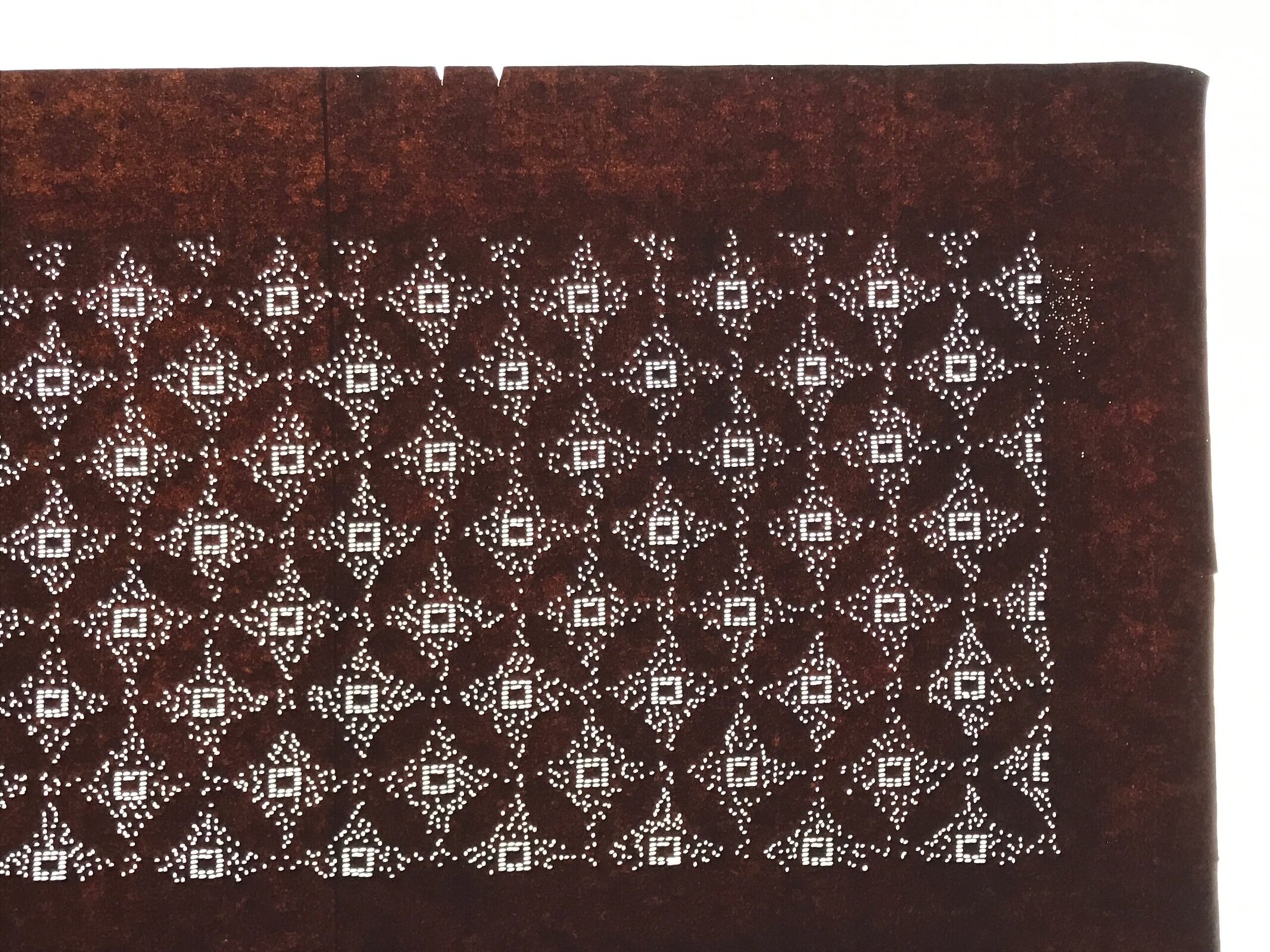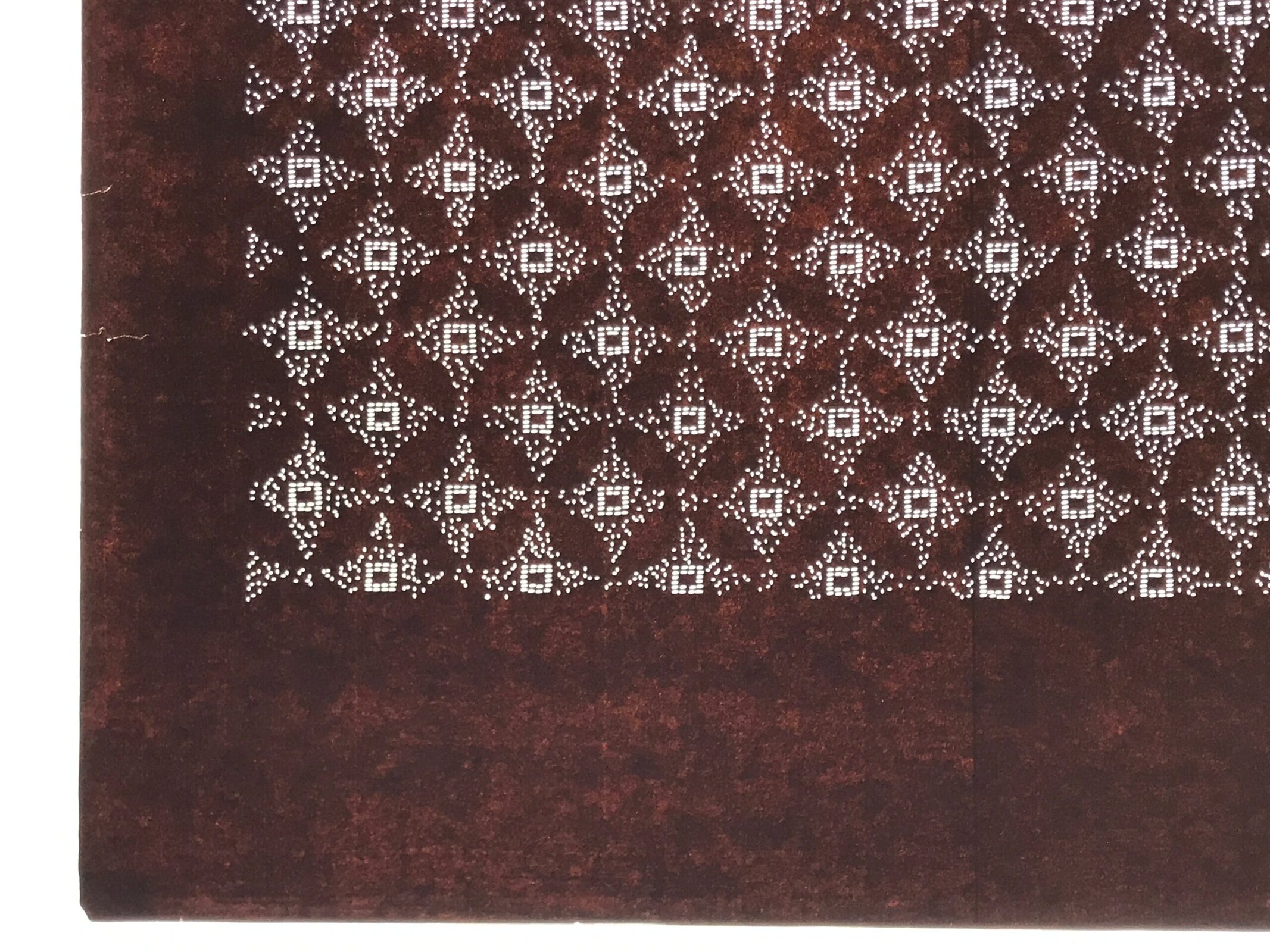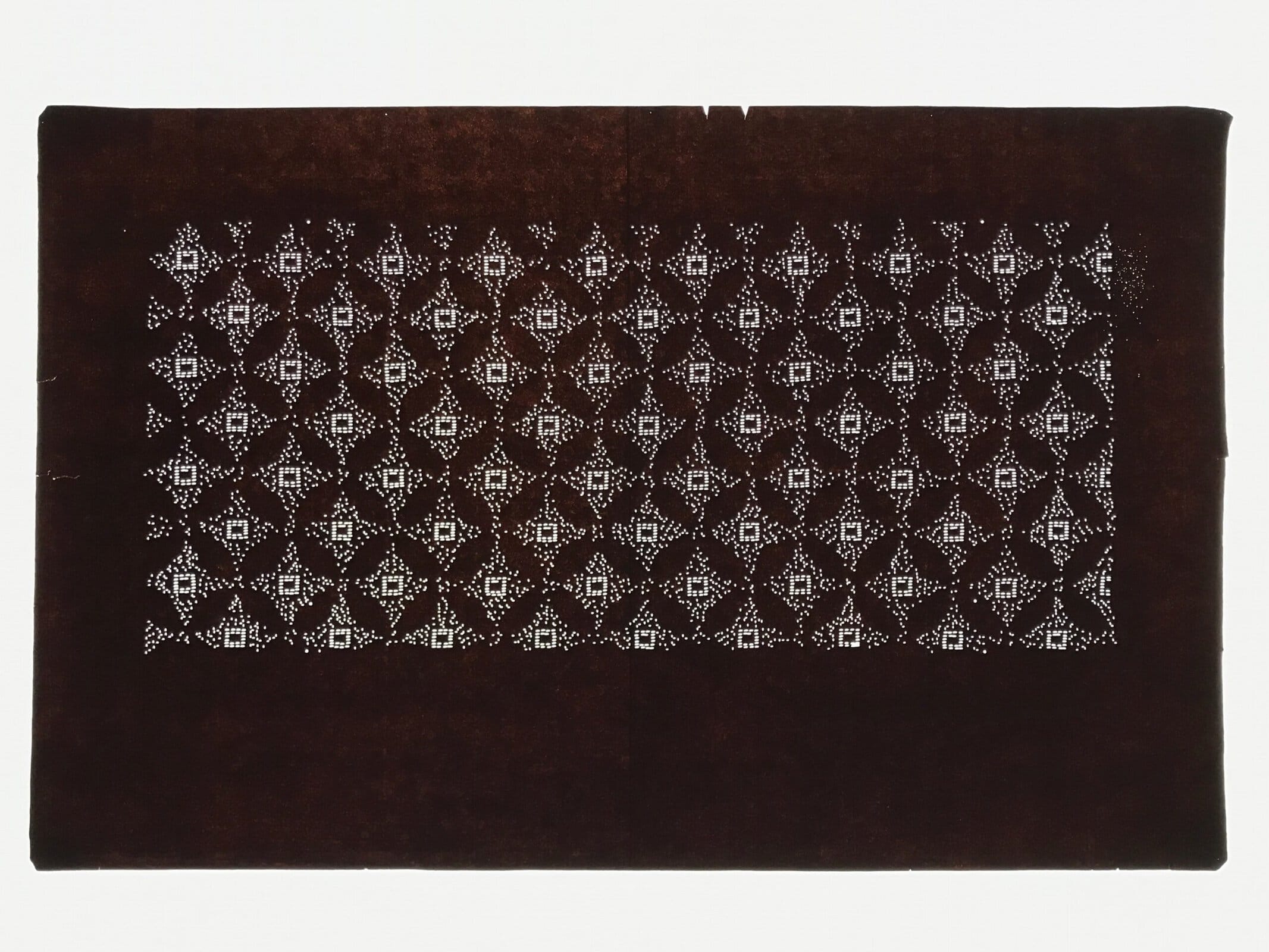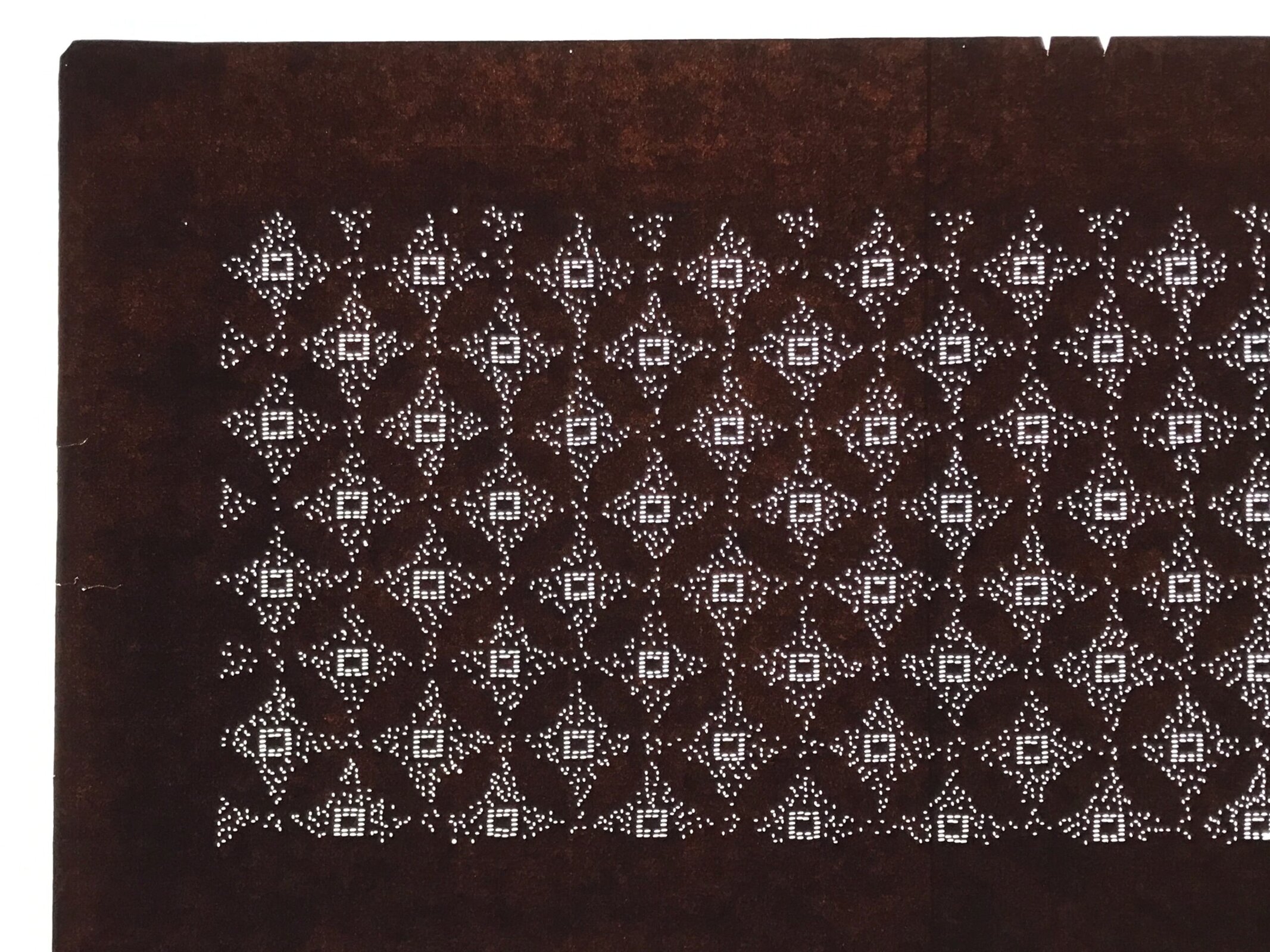 This antique Katagami was designed during the mid or late Edo period (1860) to early Meiji (1900) in Central Japan. It is made of two or more layers of handmade mulberry washi paper laminated together and waterproofed with persimmon tannin. Katagami printing uses a technique called resist dye where a paste is applied to the fabric with the katagami before dipping in ink. The open space on the katagami will be a negative space in the printed design.