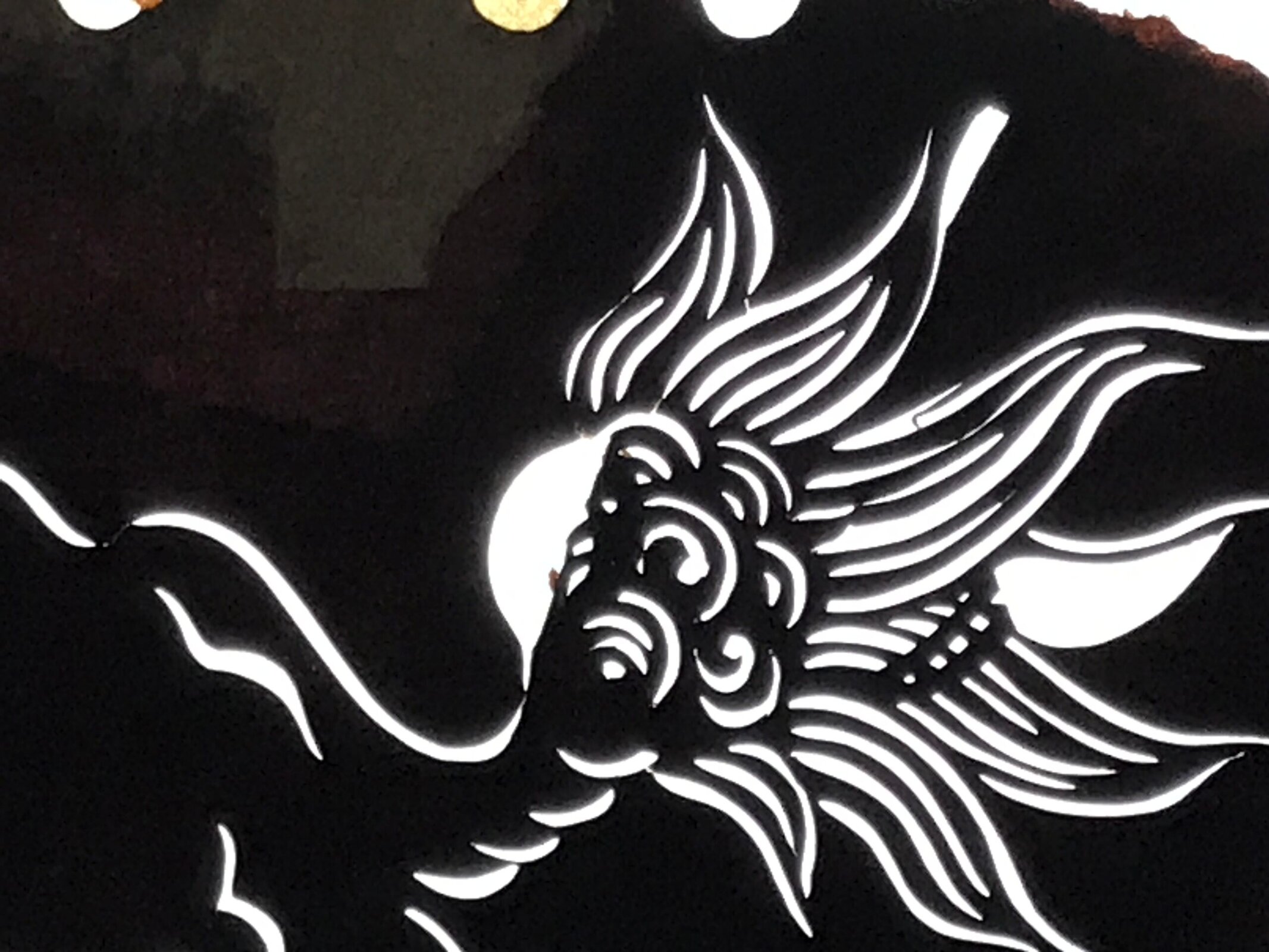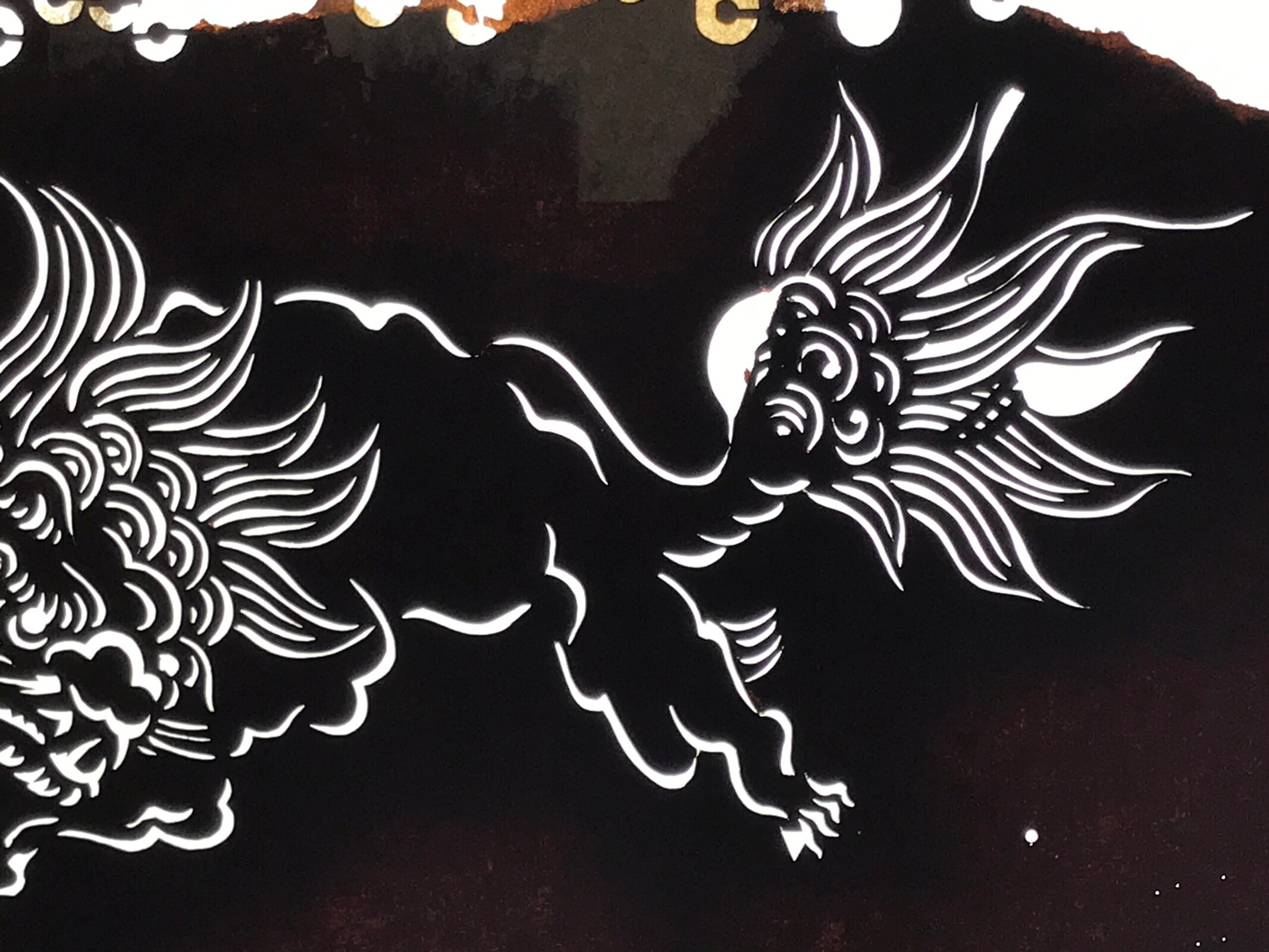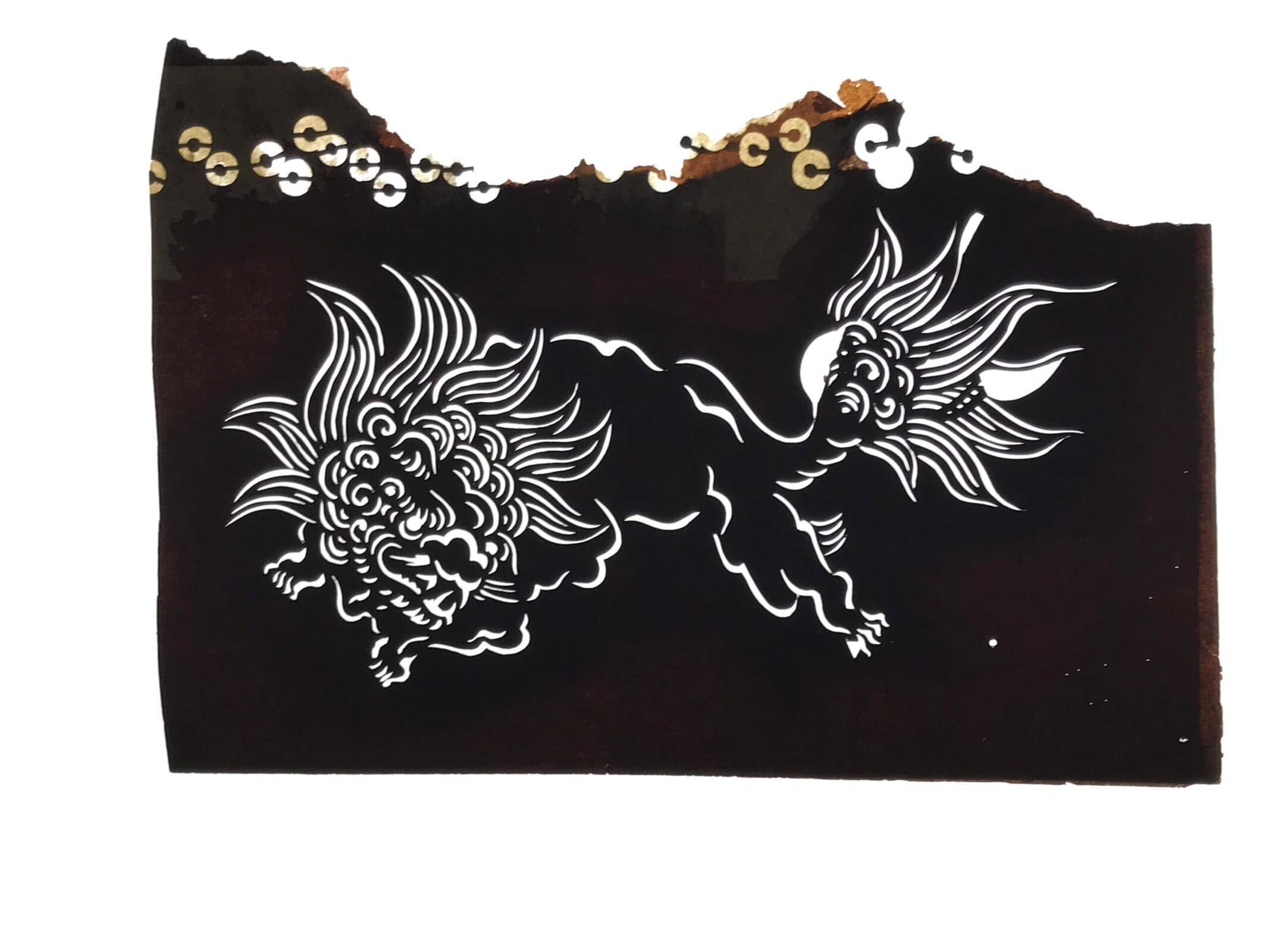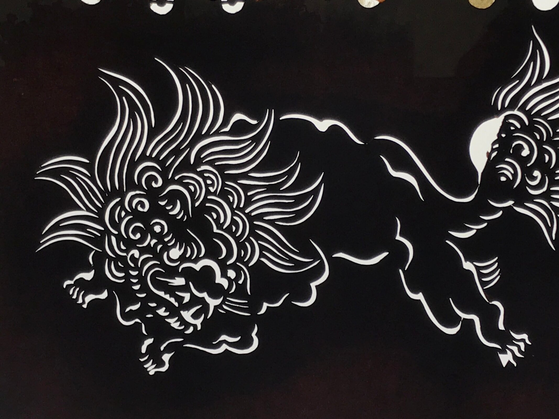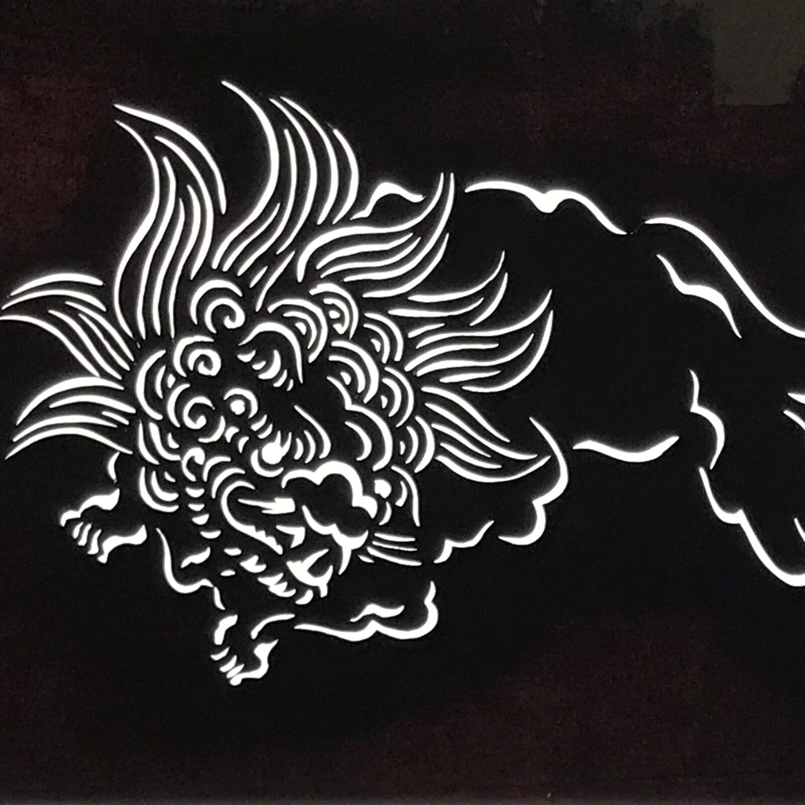 Using traditional mulberry washi paper, this Ise katagami stencil features a beautifully hand-cut image of a leaping shishi lion dog.