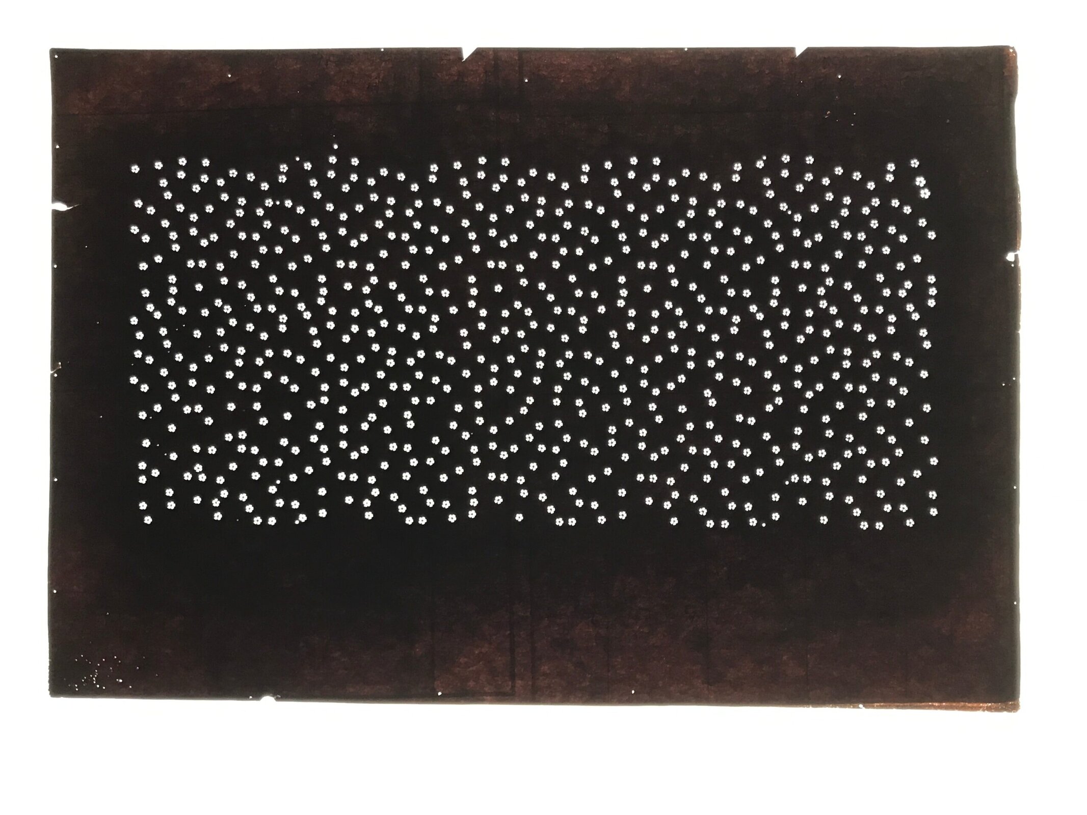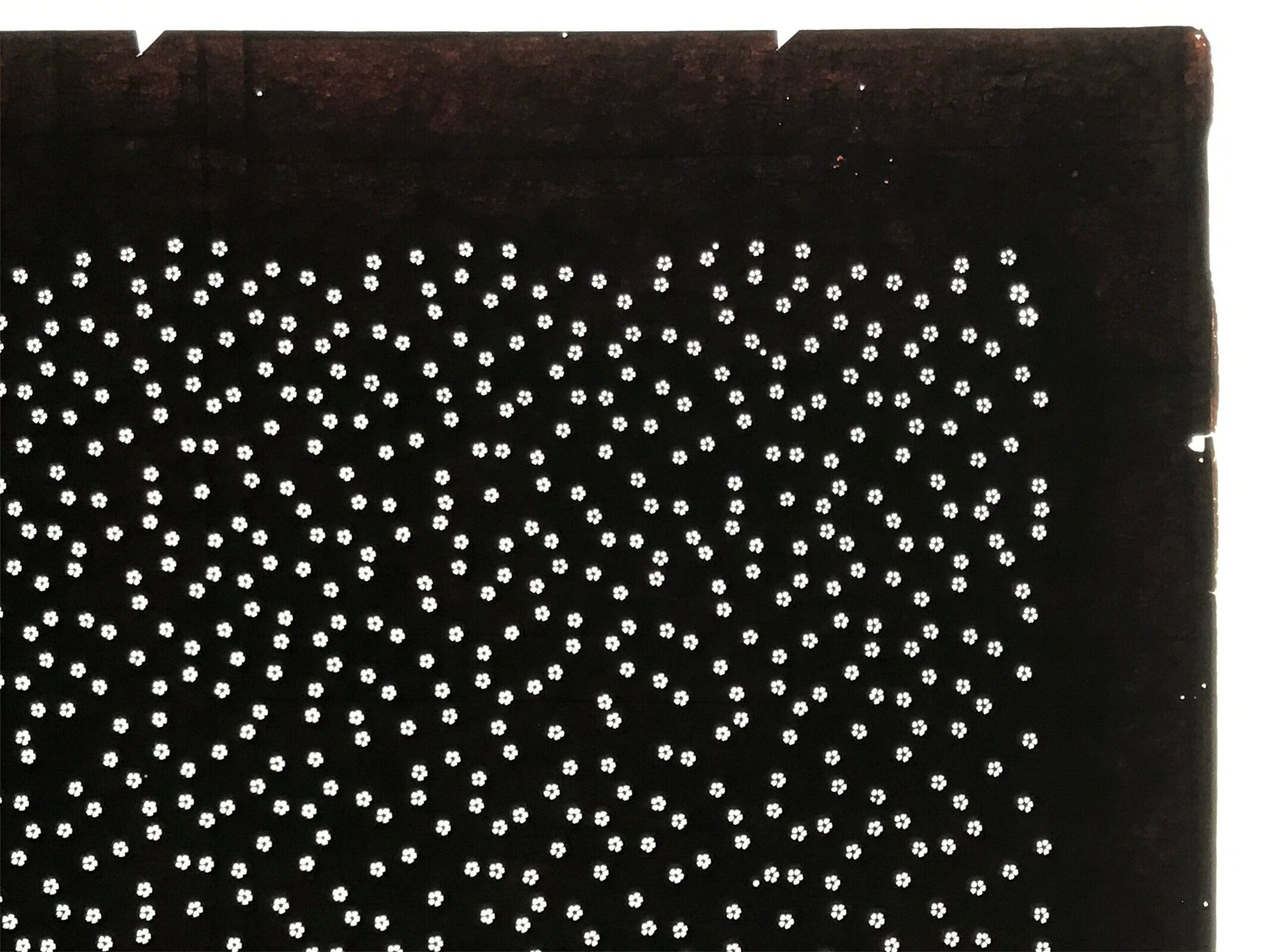 This antique Katagami was designed during the mid or late Edo period (1860) to early Meiji (1900) in Central Japan. It is made of two or more layers of handmade mulberry washi paper laminated together and waterproofed with persimmon tannin. Katagami printing uses a technique called resist dye where a paste is applied to the fabric with the katagami before dipping in ink. The open space on the katagami will be a negative space in the printed design.